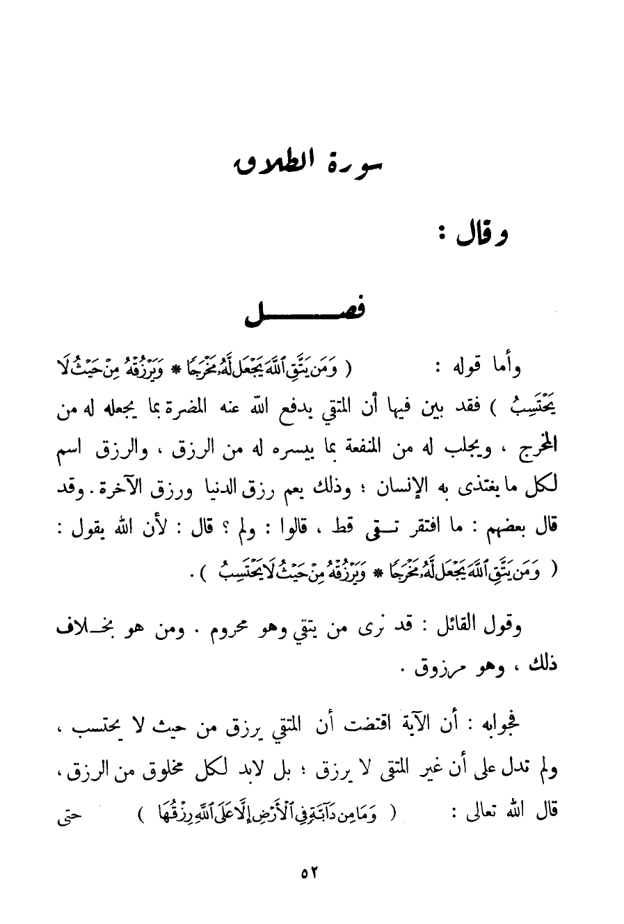 وَأَمَّا قَوْلُهُ: {وَمَنْ يَتَّقِ اللَّهَ يَجْعَلْ لَهُ مَخْرَجًا} {وَيَرْزُقْهُ مِنْ حَيْثُ لَا يَحْتَسِبُ} فَقَدْ بَيَّنَ فِيهَا أَنَّ الْمُتَّقِيَ يَدْفَعُ اللَّهُ عَنْهُ الْمَضَرَّةَ بِمَا يَجْعَلُهُ لَهُ مِنْ الْمَخْرَجِ وَيَجْلِبُ لَهُ مِنْ الْمَنْفَعَةِ بِمَا يُيَسِّرُهُ لَهُ مِنْ الرِّزْقِ وَالرِّزْقُ اسْمٌ لِكُلِّ مَا يُغْتَذَى بِهِ الْإِنْسَانُ؛ وَذَلِكَ يَعُمُّ رِزْقَ الدُّنْيَا وَرِزْقَ الْآخِرَةِ. وَقَدْ قَالَ بَعْضُهُمْ: مَا افْتَقَرَ تَقِيٌّ قَطُّ قَالُوا: وَلِمَ؟ قَالَ: لِأَنَّ اللَّهَ يَقُولُ: {وَمَنْ يَتَّقِ اللَّهَ يَجْعَلْ لَهُ مَخْرَجًا} {وَيَرْزُقْهُ مِنْ حَيْثُ لَا يَحْتَسِبُ} . وَقَوْلُ الْقَائِلِ: قَدْ نَرَى مَنْ يَتَّقِي وَهُوَ مَحْرُومٌ. وَمَنْ هُوَ بِخِلَافِ ذَلِكَ وَهُوَ مَرْزُوقٌ. فَجَوَابُهُ: أَنَّ الْآيَةَ اقْتَضَتْ أَنَّ الْمُتَّقِيَ يُرْزَقُ مِنْ حَيْثُ لَا يَحْتَسِبُ وَلَمْ تَدُلَّ عَلَى أَنَّ غَيْرَ الْمُتَّقِي لَا يُرْزَقُ؛ بَلْ لَا بُدَّ لِكُلِّ مَخْلُوقٍ مِنْ الرِّزْقِ قَالَ اللَّهُ تَعَالَى: {وَمَا مِنْ دَابَّةٍ فِي الْأَرْضِ إلَّا عَلَى اللَّهِ رِزْقُهَا} حَتَّى