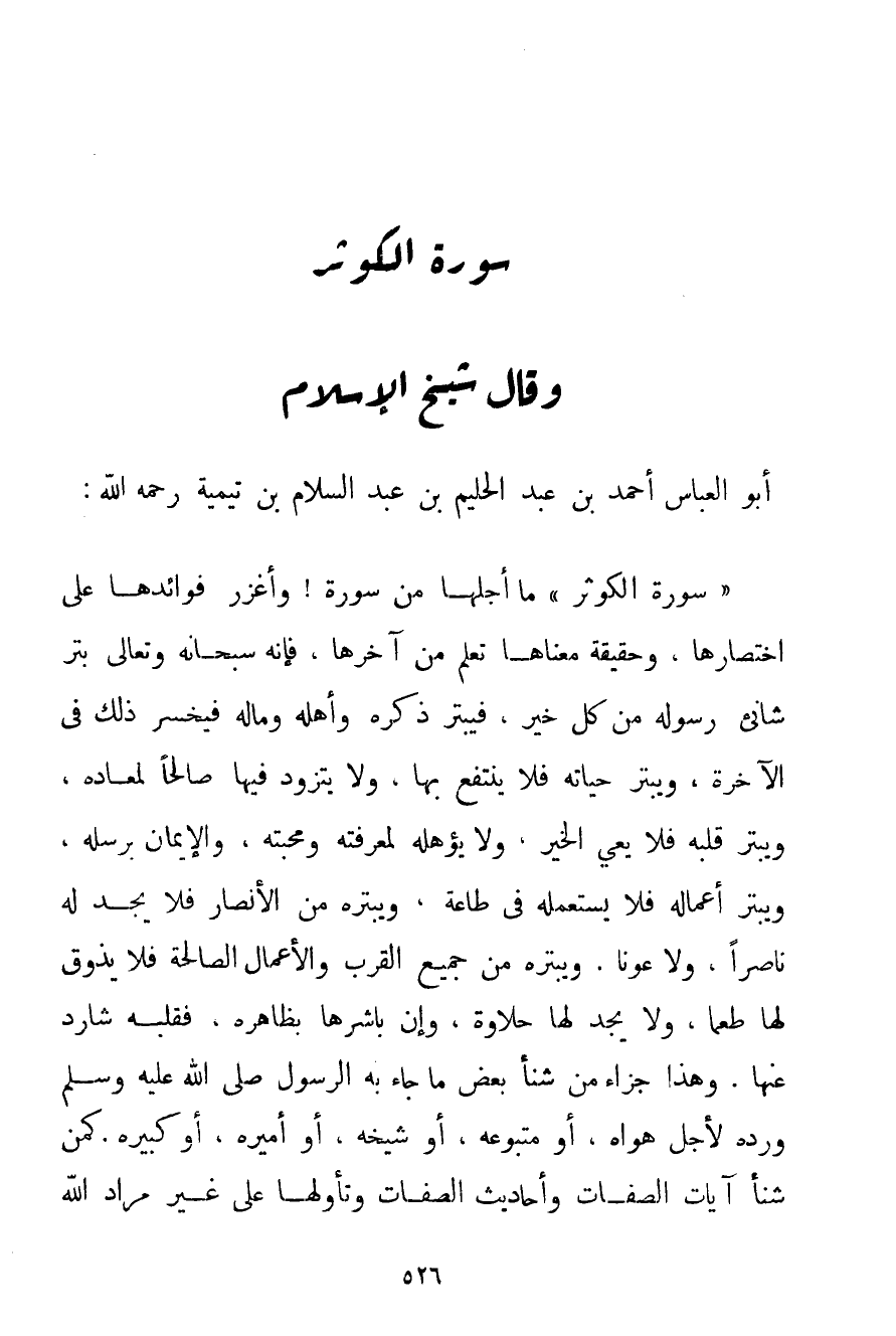 " سُورَةُ الْكَوْثَرِ " مَا أَجَلَّهَا مِنْ سُورَةٍ وَأَغْزَرُ فَوَائِدِهَا عَلَى اخْتِصَارِهَا وَحَقِيقَةُ مَعْنَاهَا تُعْلَمُ مِنْ آخِرِهَا فَإِنَّهُ سُبْحَانَهُ وَتَعَالَى بَتَرَ شَانِئَ رَسُولِهِ مِنْ كُلِّ خَيْرٍ فَيَبْتُرُ ذِكْرَهُ وَأَهْلَهُ وَمَالَهُ فَيَخْسَرُ ذَلِكَ فِي الْآخِرَةِ وَيَبْتُرُ حَيَاتَهُ فَلَا يَنْتَفِعُ بِهَا وَلَا يَتَزَوَّدُ فِيهَا صَالِحًا لِمَعَادِهِ وَيَبْتُرُ قَلْبَهُ فَلَا يَعِي الْخَيْرَ وَلَا يُؤَهِّلُهُ لِمَعْرِفَتِهِ وَمَحَبَّتِهِ وَالْإِيمَانِ بِرُسُلِهِ وَيَبْتُرُ أَعْمَالَهُ فَلَا يَسْتَعْمِلُهُ فِي طَاعَةٍ وَيَبْتُرُهُ مِنْ الْأَنْصَارِ فَلَا يَجِدُ لَهُ نَاصِرًا وَلَا عَوْنًا. وَيَبْتُرُهُ مِنْ جَمِيعِ الْقُرَبِ وَالْأَعْمَالِ الصَّالِحَةِ فَلَا يَذُوقُ لَهَا طَعْمًا وَلَا يَجِدُ لَهَا حَلَاوَةً وَإِنْ بَاشَرَهَا بِظَاهِرِهِ فَقَلْبُهُ شَارِدٌ عَنْهَا. وَهَذَا جَزَاءُ مَنْ شَنَأَ بَعْضَ مَا جَاءَ بِهِ الرَّسُولُ صَلَّى اللَّهُ عَلَيْهِ وَسَلَّمَ وَرَدَّهُ لِأَجْلِ هَوَاهُ أَوْ مَتْبُوعِهِ أَوْ شَيْخِهِ أَوْ أَمِيرِهِ أَوْ كَبِيرِهِ. كَمَنْ شَنَأَ آيَاتِ الصِّفَاتِ وَأَحَادِيثِ الصِّفَاتِ وَتَأَوَّلَهَا عَلَى غَيْرِ مُرَادِ اللَّهِ