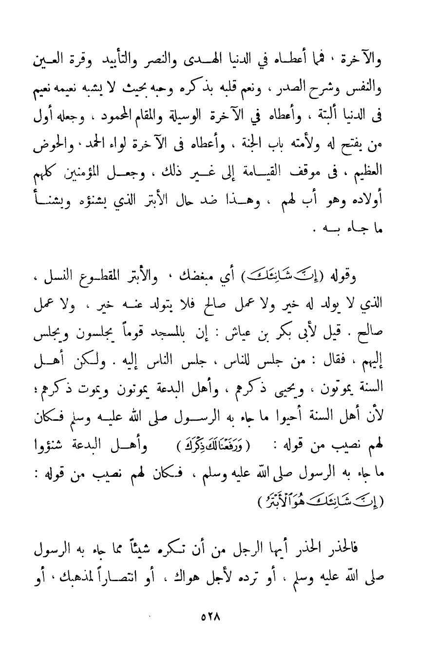 وَالْآخِرَةِ فَمِمَّا أَعْطَاهُ فِي الدُّنْيَا الْهُدَى وَالنَّصْرَ وَالتَّأْيِيدَ وَقُرَّةَ الْعَيْنِ وَالنَّفْسِ وَشَرْحَ الصَّدْرِ وَنِعْمَ قَلْبِهِ بِذِكْرِهِ وَحُبِّهِ بِحَيْثُ لَا يُشْبِهُ نَعِيمَهُ نَعِيمٌ فِي الدُّنْيَا أَلْبَتَّةَ وَأَعْطَاهُ فِي الْآخِرَةِ الْوَسِيلَةَ وَالْمَقَامَ الْمَحْمُودَ وَجَعَلَهُ أَوَّلَ مَنْ يُفْتَحُ لَهُ وَلِأُمَّتِهِ بَابُ الْجَنَّةِ وَأَعْطَاهُ فِي الْآخِرَةِ لِوَاءَ الْحَمْدِ وَالْحَوْضَ الْعَظِيمَ فِي مَوْقِفِ الْقِيَامَةِ إلَى غَيْرِ ذَلِكَ وَجَعَلَ الْمُؤْمِنِينَ كُلَّهُمْ أَوْلَادَهُ وَهُوَ أَبٌ لَهُمْ وَهَذَا ضِدُّ حَالِ الْأَبْتَرِ الَّذِي يَشْنَؤُهُ وَيَشْنَأُ مَا جَاءَ بِهِ. وَقَوْلُهُ {إنَّ شَانِئَكَ} أَيْ مُبْغِضُك وَالْأَبْتَرُ الْمَقْطُوعُ النَّسْلِ الَّذِي لَا يُولَدُ لَهُ خَيْرٌ وَلَا عَمَلٌ صَالِحٌ فَلَا يَتَوَلَّدُ عَنْهُ خَيْرٌ وَلَا عَمَلٌ صَالِحٌ. قِيلَ لِأَبِي بَكْرِ بْنِ عَيَّاشٍ: إنَّ بِالْمَسْجِدِ قَوْمًا يَجْلِسُونَ وَيُجْلَسُ إلَيْهِمْ فَقَالَ: مَنْ جَلَسَ لِلنَّاسِ جَلَسَ النَّاسُ إلَيْهِ. وَلَكِنَّ أَهْلَ السُّنَّةِ يَمُوتُونَ وَيَحْيَى ذِكْرُهُمْ وَأَهْلَ الْبِدْعَةِ يَمُوتُونَ وَيَمُوتُ ذِكْرُهُمْ؛ لِأَنَّ أَهْلَ السُّنَّةِ أَحْيَوْا مَا جَاءَ بِهِ الرَّسُولُ صَلَّى اللَّهُ عَلَيْهِ وَسَلَّمَ فَكَانَ لَهُمْ نَصِيبٌ مِنْ قَوْلِهِ: {وَرَفَعْنَا لَكَ ذِكْرَكَ} وَأَهْلَ الْبِدْعَةِ شَنَئُوا مَا جَاءَ بِهِ الرَّسُولُ صَلَّى اللَّهُ عَلَيْهِ وَسَلَّمَ فَكَانَ لَهُمْ نَصِيبٌ مِنْ قَوْلِهِ: {إنَّ شَانِئَكَ هُوَ الْأَبْتَرُ} فَالْحَذَرَ الْحَذَرَ أَيُّهَا الرَّجُلُ مِنْ أَنْ تَكْرَهَ شَيْئًا مِمَّا جَاءَ بِهِ الرَّسُولُ صَلَّى اللَّهُ عَلَيْهِ وَسَلَّمَ أَوْ تَرُدَّهُ لِأَجْلِ هَوَاك أَوْ انْتِصَارًا لِمَذْهَبِك أَوْ