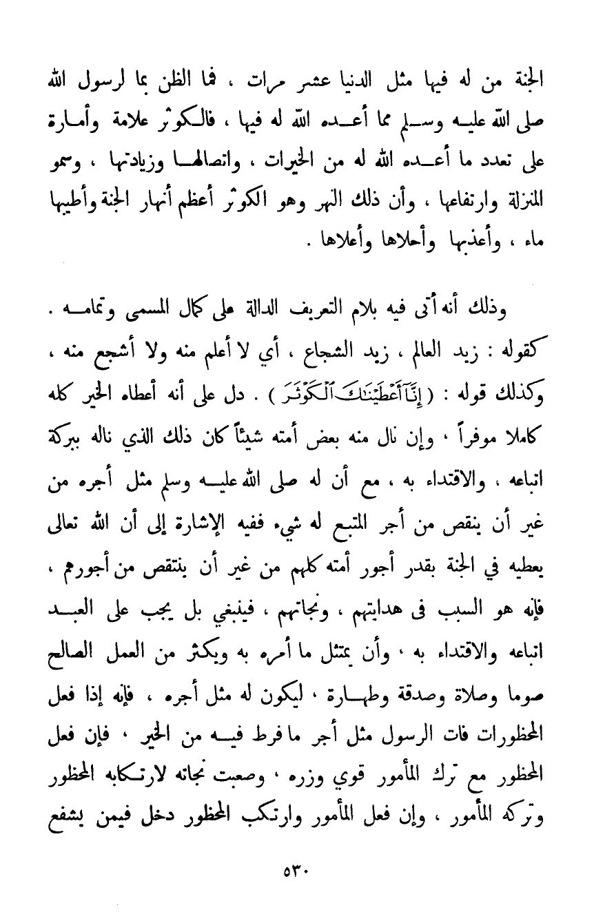 الْجَنَّةِ مَنْ لَهُ فِيهَا مِثْلُ الدُّنْيَا عَشْرُ مَرَّاتٍ فَمَا الظَّنُّ بِمَا لِرَسُولِ اللَّهِ صَلَّى اللَّهُ عَلَيْهِ وَسَلَّمَ مِمَّا أَعَدَّهُ اللَّهُ لَهُ فِيهَا فَالْكَوْثَرُ عَلَامَةٌ وَأَمَارَةٌ عَلَى تَعَدُّدِ مَا أَعَدَّهُ اللَّهُ لَهُ مِنْ الْخَيْرَاتِ وَاتِّصَالِهَا وَزِيَادَتِهَا وَسُمُوِّ الْمَنْزِلَةِ وَارْتِفَاعِهَا وَأَنَّ ذَلِكَ النَّهْرَ وَهُوَ الْكَوْثَرُ أَعْظَمُ أَنْهَارِ الْجَنَّةِ وَأَطْيَبُهَا مَاءً وَأَعْذَبُهَا وَأَحْلَاهَا وَأَعْلَاهَا. وَذَلِكَ أَنَّهُ أَتَى فِيهِ بِلَامِ التَّعْرِيفِ الدَّالَّةِ عَلَى كَمَالِ الْمُسَمَّى وَتَمَامِهِ. كَقَوْلِهِ: زَيْدٌ الْعَالِمُ زَيْدٌ الشُّجَاعُ أَيْ لَا أَعْلَمُ مِنْهُ وَلَا أَشْجَعُ مِنْهُ وَكَذَلِكَ قَوْلُهُ: {إنَّا أَعْطَيْنَاكَ الْكَوْثَرَ} . دَلَّ عَلَى أَنَّهُ أَعْطَاهُ الْخَيْرَ كُلَّهُ كَامِلًا مُوَفَّرًا وَإِنْ نَالَ مِنْهُ بَعْضُ أُمَّتِهِ شَيْئًا كَانَ ذَلِكَ الَّذِي نَالَهُ بِبَرَكَةِ اتِّبَاعِهِ. وَالِاقْتِدَاءِ بِهِ مَعَ أَنَّ لَهُ صَلَّى اللَّهُ عَلَيْهِ وَسَلَّمَ مِثْلَ أَجْرِهِ مِنْ غَيْرِ أَنْ يَنْقُصَ مِنْ أَجْرِ الْمُتَّبَعِ لَهُ شَيْءٌ فَفِيهِ الْإِشَارَةُ إلَى أَنَّ اللَّهَ تَعَالَى يُعْطِيهِ فِي الْجَنَّةِ بِقَدْرِ أُجُورِ أُمَّتِهِ كُلِّهِمْ مِنْ غَيْرِ أَنْ يَنْتَقِصَ مِنْ أُجُورِهِمْ فَإِنَّهُ هُوَ السَّبَبُ فِي هِدَايَتِهِمْ وَنَجَاتِهِمْ فَيَنْبَغِي بَلْ يَجِبُ عَلَى الْعَبْدِ اتِّبَاعُهُ وَالِاقْتِدَاءُ بِهِ وَأَنْ يَمْتَثِلَ مَا أَمَرَهُ بِهِ وَيُكْثِرَ مِنْ الْعَمَلِ الصَّالِحِ صَوْمًا وَصَلَاةً وَصَدَقَةً وَطِهَارَةً لِيَكُونَ لَهُ مِثْلُ أَجْرِهِ فَإِنَّهُ إذَا فَعَلَ الْمَحْظُورَاتِ فَاتَ الرَّسُولَ مِثْلُ أَجْرِ مَا فَرَّطَ فِيهِ مِنْ الْخَيْرِ فَإِنْ فَعَلَ الْمَحْظُورَ مَعَ تَرْكِ الْمَأْمُورِ قَوِيَ وِزْرُهُ وَصَعُبَتْ نَجَاتُهُ لِارْتِكَابِهِ الْمَحْظُورَ وَتَرْكِهِ الْمَأْمُورَ وَإِنْ فَعَلَ الْمَأْمُورَ وَارْتَكَبَ الْمَحْظُورَ دَخَلَ فِيمَنْ يَشْفَعُ