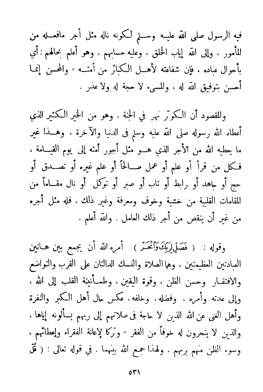 فِيهِ الرَّسُولُ صَلَّى اللَّهُ عَلَيْهِ وَسَلَّمَ لِكَوْنِهِ نَالَهُ مِثْلُ أَجْرِ مَا فَعَلَهُ مِنْ الْمَأْمُورِ وَإِلَى اللَّهِ إيَابُ الْخَلْقِ وَعَلَيْهِ حِسَابُهُمْ وَهُوَ أَعْلَمُ بِحَالِهِمْ: أَيْ بِأَحْوَالِ عِبَادِهِ فَإِنَّ شَفَاعَتَهُ لِأَهْلِ الْكَبَائِرِ مِنْ أُمَّتِهِ وَالْمُحْسِنُ إنَّمَا أَحْسَنَ بِتَوْفِيقِ اللَّهِ لَهُ وَالْمُسِيءُ لَا حُجَّةَ لَهُ وَلَا عُذْرَ. وَالْمَقْصُودُ أَنَّ الْكَوْثَرَ نَهْرٌ فِي الْجَنَّةِ وَهُوَ مِنْ الْخَيْرِ الْكَثِيرِ الَّذِي أَعْطَاهُ اللَّهُ رَسُولَهُ صَلَّى اللَّهُ عَلَيْهِ وَسَلَّمَ فِي الدُّنْيَا وَالْآخِرَةِ وَهَذَا غَيْرُ مَا يُعْطِيهِ اللَّهُ مِنْ الْأَجْرِ الَّذِي هُوَ مِثْلُ أُجُورِ أُمَّتِهِ إلَى يَوْمِ الْقِيَامَةِ فَكُلُّ مَنْ قَرَأَ أَوْ عَلِمَ أَوْ عَمِلَ صَالِحًا أَوْ عَلَّمَ غَيْرَهُ أَوْ تَصَدَّقَ أَوْ حَجَّ أَوْ جَاهَدَ أَوْ رَابَطَ أَوْ تَابَ أَوْ صَبَرَ أَوْ تَوَكَّلَ أَوْ نَالَ مَقَامًا مِنْ الْمَقَامَاتِ الْقَلْبِيَّةِ مِنْ خَشْيَةٍ وَخَوْفٍ وَمَعْرِفَةٍ وَغَيْرِ ذَلِكَ فَلَهُ مِثْلُ أَجْرِهِ مِنْ غَيْرِ أَنْ يَنْقُصَ مِنْ أَجْرِ ذَلِكَ الْعَامِلِ. وَاَللَّهُ أَعْلَمُ. وَقَوْلُهُ: {فَصَلِّ لِرَبِّكَ وَانْحَرْ} أَمَرَهُ اللَّهُ أَنْ يَجْمَعَ بَيْنَ هَاتَيْنِ الْعِبَادَتَيْنِ الْعَظِيمَتَيْنِ وَهُمَا الصَّلَاةُ وَالنُّسُكُ الدَّالَّتَانِ عَلَى الْقُرْبِ وَالتَّوَاضُعِ وَالِافْتِقَارِ وَحُسْنِ الظَّنِّ وَقُوَّةِ الْيَقِينِ وَطُمَأْنِينَةِ الْقَلْبِ إلَى اللَّهِ وَإِلَى عُدَّتِهِ وَأَمْرِهِ وَفَضْلِهِ وَخُلْفِهِ عَكْسُ حَالِ أَهْلِ الْكِبْرِ وَالنُّفْرَةِ وَأَهْلِ الْغِنَى عَنْ اللَّهِ الَّذِينَ لَا حَاجَةَ فِي صَلَاتِهِمْ إلَى رَبِّهِمْ يَسْأَلُونَهُ إيَّاهَا وَاَلَّذِينَ لَا يَنْحَرُونَ لَهُ خَوْفًا مِنْ الْفَقْرِ وَتَرْكًا لِإِعَانَةِ الْفُقَرَاءِ وَإِعْطَائِهِمْ وَسُوءِ الظَّنِّ مِنْهُمْ بِرَبِّهِمْ وَلِهَذَا جَمَعَ اللَّهُ بَيْنَهُمَا. فِي قَوْله تَعَالَى {قُلْ