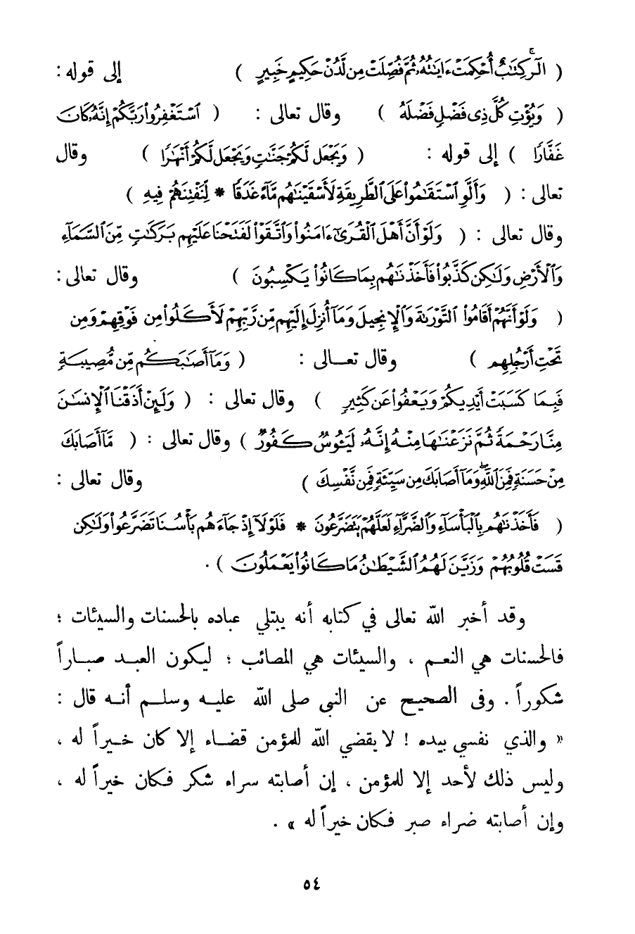 {الر كِتَابٌ أُحْكِمَتْ آيَاتُهُ ثُمَّ فُصِّلَتْ مِنْ لَدُنْ حَكِيمٍ خَبِيرٍ} إلَى قَوْلِهِ: {وَيُؤْتِ كُلَّ ذِي فَضْلٍ فَضْلَهُ} وَقَالَ تَعَالَى: {اسْتَغْفِرُوا رَبَّكُمْ إنَّهُ كَانَ غَفَّارًا} إلَى قَوْلِهِ: {وَيَجْعَلْ لَكُمْ جَنَّاتٍ وَيَجْعَلْ لَكُمْ أَنْهَارًا} وَقَالَ تَعَالَى: {وَأَنْ لَوِ اسْتَقَامُوا عَلَى الطَّرِيقَةِ لَأَسْقَيْنَاهُمْ مَاءً غَدَقًا} {لِنَفْتِنَهُمْ فِيهِ} وَقَالَ تَعَالَى: {وَلَوْ أَنَّ أَهْلَ الْقُرَى آمَنُوا وَاتَّقَوْا لَفَتَحْنَا عَلَيْهِمْ بَرَكَاتٍ مِنَ السَّمَاءِ وَالْأَرْضِ وَلَكِنْ كَذَّبُوا فَأَخَذْنَاهُمْ بِمَا كَانُوا يَكْسِبُونَ} وَقَالَ تَعَالَى: {وَلَوْ أَنَّهُمْ أَقَامُوا التَّوْرَاةَ وَالْإِنْجِيلَ وَمَا أُنْزِلَ إلَيْهِمْ مِنْ رَبِّهِمْ لَأَكَلُوا مِنْ فَوْقِهِمْ وَمِنْ تَحْتِ أَرْجُلِهِمْ} وَقَالَ تَعَالَى: {وَمَا أَصَابَكُمْ مِنْ مُصِيبَةٍ فَبِمَا كَسَبَتْ أَيْدِيكُمْ وَيَعْفُو عَنْ كَثِيرٍ} وَقَالَ تَعَالَى: {وَلَئِنْ أَذَقْنَا الْإِنْسَانَ مِنَّا رَحْمَةً ثُمَّ نَزَعْنَاهَا مِنْهُ إنَّهُ لَيَئُوسٌ كَفُورٌ} وَقَالَ تَعَالَى: {مَا أَصَابَكَ مِنْ حَسَنَةٍ فَمِنَ اللَّهِ وَمَا أَصَابَكَ مِنْ سَيِّئَةٍ فَمِنْ نَفْسِكَ} وَقَالَ تَعَالَى: {فَأَخَذْنَاهُمْ بِالْبَأْسَاءِ وَالضَّرَّاءِ لَعَلَّهُمْ يَتَضَرَّعُونَ} {فَلَوْلَا إذْ جَاءَهُمْ بَأْسُنَا تَضَرَّعُوا وَلَكِنْ قَسَتْ قُلُوبُهُمْ وَزَيَّنَ لَهُمُ الشَّيْطَانُ مَا كَانُوا يَعْمَلُونَ} . وَقَدْ أَخْبَرَ اللَّهُ تَعَالَى فِي كِتَابِهِ أَنَّهُ يَبْتَلِي عِبَادَهُ بِالْحَسَنَاتِ وَالسَّيِّئَاتِ؛ فَالْحَسَنَاتُ هِيَ النِّعَمُ وَالسَّيِّئَاتُ هِيَ الْمَصَائِبُ؛ لِيَكُونَ الْعَبْدُ صَبَّارًا شَكُورًا. وَفِي الصَّحِيحِ عَنْ النَّبِيِّ صَلَّى اللَّهُ عَلَيْهِ وَسَلَّمَ أَنَّهُ قَالَ: {وَاَلَّذِي نَفْسِي بِيَدِهِ لَا يَقْضِي اللَّهُ لِلْمُؤْمِنِ قَضَاءً إلَّا كَانَ خَيْرًا لَهُ وَلَيْسَ ذَلِكَ لِأَحَدِ إلَّا لِلْمُؤْمِنِ إنْ أَصَابَتْهُ سَرَّاءُ شَكَرَ فَكَانَ خَيْرًا لَهُ وَإِنْ أَصَابَتْهُ ضَرَّاءُ صَبَرَ فَكَانَ خَيْرًا لَهُ} .