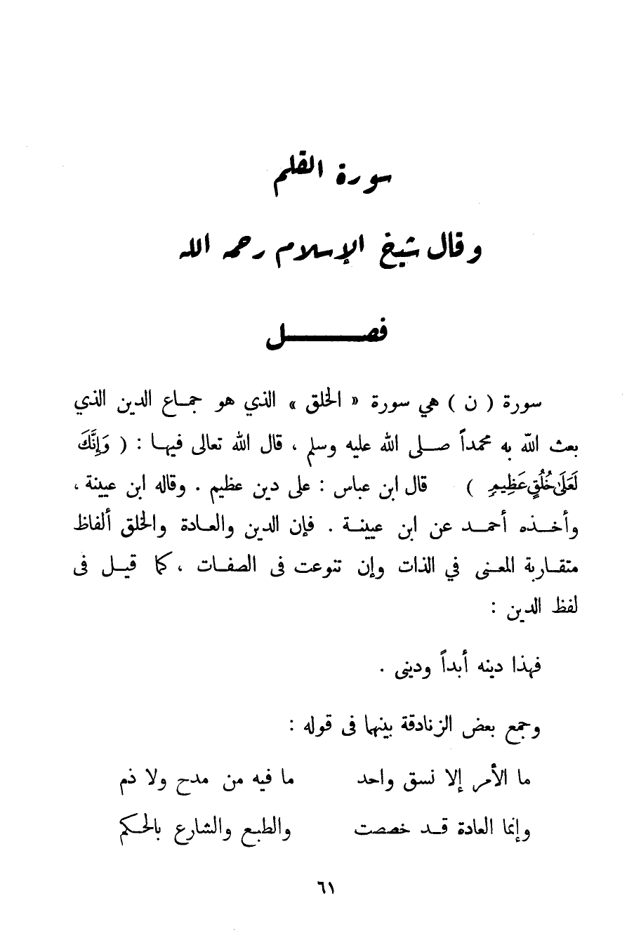 سُورَةُ (ن) هِيَ سُورَةُ " الْخُلُقِ " الَّذِي هُوَ جِمَاعُ الدِّينِ الَّذِي بَعَثَ اللَّهُ بِهِ مُحَمَّدًا صَلَّى اللَّهُ عَلَيْهِ وَسَلَّمَ قَالَ اللَّهُ تَعَالَى فِيهَا: {وَإِنَّكَ لَعَلى خُلُقٍ عَظِيمٍ} قَالَ ابْنُ عَبَّاسٍ: عَلَى دِينٍ عَظِيمٍ. وَقَالَهُ ابْنُ عُيَيْنَة وَأَخَذَهُ أَحْمَد عَنْ ابْنِ عُيَيْنَة. فَإِنَّ الدِّينَ وَالْعَادَةَ وَالْخُلُقَ أَلْفَاظٌ مُتَقَارِبَةُ الْمَعْنَى فِي الذَّاتِ وَإِنْ تَنَوَّعَتْ فِي الصِّفَاتِ كَمَا قِيلَ فِي لَفْظِ الدِّينِ: فَهَذَا دِينُهُ أَبَدًا وَدِينِي. وَجَمَعَ بَعْضُ الزَّنَادِقَةِ بَيْنَهُمَا فِي قَوْلِهِ: