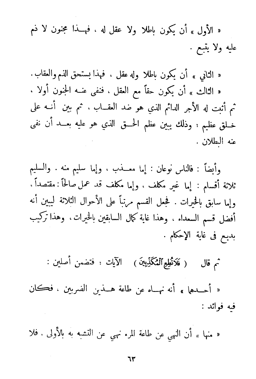 " الْأَوَّلُ " أَنْ يَكُونَ بَاطِلًا وَلَا عَقْلَ لَهُ. فَهَذَا مَجْنُونٌ لَا ذَمَّ عَلَيْهِ وَلَا يُتَّبَعُ. " الثَّانِي " أَنْ يَكُونَ بَاطِلًا وَلَهُ عَقْلٌ فَهَذَا يَسْتَحِقُّ الذَّمَّ وَالْعِقَابَ. " الثَّالِثُ " أَنْ يَكُونَ حَقًّا مَعَ الْعَقْلِ فَنَفَى عَنْهُ الْجُنُونَ أَوَّلًا ثُمَّ أَثْبَتَ لَهُ الْأَجْرَ الدَّائِمَ الَّذِي هُوَ ضِدُّ الْعِقَابِ ثُمَّ بَيَّنَ أَنَّهُ عَلَى خُلُقٍ عَظِيمٍ؛ وَذَلِكَ يُبَيِّنُ عِظَمَ الْحَقِّ الَّذِي هُوَ عَلَيْهِ بَعْدَ أَنْ نَفَى عَنْهُ الْبُطْلَانَ. وَأَيْضًا: فَالنَّاسُ نَوْعَانِ: إمَّا مُعَذَّبٌ وَإِمَّا سَلِيمٌ مِنْهُ. وَالسَّلِيمُ ثَلَاثَةُ أَقْسَامٍ: إمَّا غَيْرُ مُكَلَّفٍ وَإِمَّا مُكَلَّفٌ قَدْ عَمِلَ صَالِحًا: مُقْتَصِدًا وَإِمَّا سَابِقٌ بِالْخَيْرَاتِ. فَجَعَلَ الْقَسَمَ مُرَتَّبًا عَلَى الْأَحْوَالِ الثَّلَاثَةِ لِيُبَيِّنَ أَنَّهُ أَفْضَلُ قَسْمِ السُّعَدَاءِ وَهَذَا غَايَةُ كَمَالِ السَّابِقِينَ بِالْخَيْرَاتِ وَهَذَا تَرْكِيبٌ بَدِيعٌ فِي غَايَةِ الْإِحْكَامِ. ثُمَّ قَالَ {فَلَا تُطِعِ الْمُكَذِّبِينَ} الْآيَاتِ؛ فَتَضَمَّنَ أَصْلَيْنِ: " أَحَدَهُمَا " أَنَّهُ نَهَاهُ عَنْ طَاعَةِ هَذَيْنِ الضَّرْبَيْنِ فَكَانَ فِيهِ فَوَائِدُ: " مِنْهَا " أَنَّ النَّهْيَ عَنْ طَاعَةِ الْمَرْءِ نَهْيٌ عَنْ التَّشَبُّهِ بِهِ بِالْأَوْلَى، فَلَا