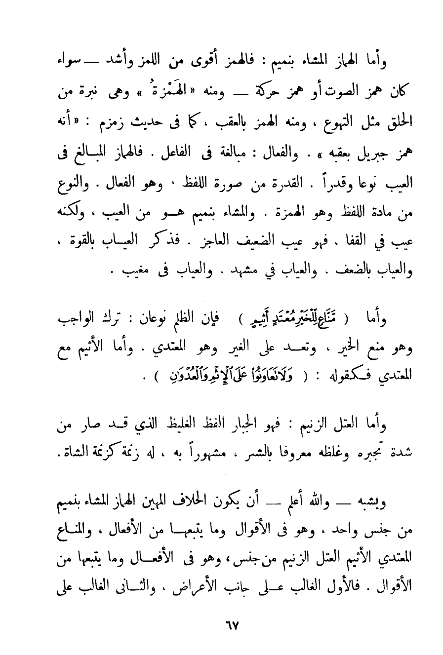 وَأَمَّا الْهَمَّازُ الْمَشَّاءُ بِنَمِيمِ: فَالْهَمْزُ أَقْوَى مِنْ اللَّمْزِ وَأَشَدُّ - سَوَاءٌ كَانَ هَمْزَ الصَّوْتِ أَوْ هَمْزَ حَرَكَةٍ - وَمِنْهُ " الْهَمْزَةُ " وَهِيَ نَبْرَةٌ مِنْ الْحَلْقِ مِثْلُ التَّهَوُّعِ وَمِنْهُ الْهَمْزُ بِالْعَقِبِ كَمَا فِي حَدِيثِ زَمْزَمَ: {أَنَّهُ هَمْزُ جِبْرِيلَ بِعَقِبِهِ} وَالْفَعَّالُ: مُبَالَغَةٌ فِي الْفَاعِلِ. فَالْهَمَّازُ الْمُبَالِغُ فِي الْعَيْبِ نَوْعًا وَقَدْرًا. الْقُدْرَةُ مِنْ صُورَةِ اللَّفْظِ وَهُوَ الْفَعَّالُ. وَالنَّوْعُ مِنْ مَادَّةِ اللَّفْظِ وَهُوَ الْهَمْزَةُ. وَالْمَشَّاءُ بِنَمِيمِ هُوَ مِنْ الْعَيْبِ وَلَكِنَّهُ عَيْبٌ فِي الْقَفَا فَهُوَ عَيْبُ الضَّعِيفِ الْعَاجِزِ. فَذَكَرَ الْعَيَّابَ بِالْقُوَّةِ وَالْعَيَّابَ بِالضَّعْفِ وَالْعَيَّابَ فِي مَشْهَدٍ وَالْعَيَّابَ فِي مَغِيبٍ. وَأَمَّا {مَنَّاعٍ لِلْخَيْرِ مُعْتَدٍ أَثِيمٍ} فَإِنَّ الظُّلْمَ نَوْعَانِ: تَرْكُ الْوَاجِبِ وَهُوَ مَنْعُ الْخَيْرِ وَتَعَدٍّ عَلَى الْغَيْرِ وَهُوَ الْمُعْتَدِي. وَأَمَّا الْأَثِيمُ مَعَ الْمُعْتَدِي فَكَقَوْلِهِ: {وَلَا تَعَاوَنُوا عَلَى الْإِثْمِ وَالْعُدْوَانِ} . وَأَمَّا الْعُتُلُّ الزَّنِيمُ: فَهُوَ الْجَبَّارُ الْفَظُّ الْغَلِيظُ الَّذِي قَدْ صَارَ مِنْ شِدَّةِ تَجَبُّرِهِ وَغِلَظِهِ مَعْرُوفًا بِالشَّرِّ مَشْهُورًا بِهِ لَهُ زَنَمَةٌ كَزَنَمَةِ الشَّاةِ. وَيُشْبِهُ - وَاَللَّهُ أَعْلَمُ - أَنْ يَكُونَ الْحَلَّافُ الْمَهِينُ الْهَمَّازُ الْمَشَّاءُ بِنَمِيمِ مِنْ جِنْسٍ وَاحِدٍ وَهُوَ فِي الْأَقْوَالِ وَمَا يَتْبَعُهَا مِنْ الْأَفْعَالِ وَالْمَنَّاعُ الْمُعْتَدِي الْأَثِيمُ الْعُتُلُّ الزَّنِيمُ مِنْ جِنْسٍ وَهُوَ فِي الْأَفْعَالِ وَمَا يَتْبَعُهَا مِنْ الْأَقْوَالِ. فَالْأَوَّلُ الْغَالِبُ عَلَى جَانِبِ الْأَعْرَاضِ وَالثَّانِي الْغَالِبُ عَلَى جَانِبِ