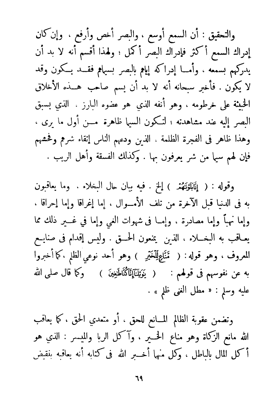 وَالتَّحْقِيقُ: أَنَّ السَّمْعَ أَوْسَعُ وَالْبَصَرَ أَخَصُّ وَأَرْفَعُ وَإِنْ كَانَ إدْرَاكُ السَّمْعِ أَكْثَرَ فَإِدْرَاكُ الْبَصَرِ أَكْمَلُ؛ وَلِهَذَا أَقْسَمَ أَنَّهُ لَا بُدَّ أَنْ يُدْرِكَهُمْ بِسَمْعِهِ وَأَمَّا إدْرَاكُهُ إيَّاهُمْ بِالْبَصَرِ بِسِيمَاهُمْ فَقَدْ يَكُونُ وَقَدْ لَا يَكُونُ. فَأَخْبَرَ سُبْحَانَهُ أَنَّهُ لَا بُدَّ أَنْ يَسِمَ صَاحِبَ هَذِهِ الْأَخْلَاقِ الْخَبِيثَةِ عَلَى خُرْطُومِهِ وَهُوَ أَنْفُهُ الَّذِي هُوَ عُضْوُهُ الْبَارِزُ الَّذِي يَسْبِقُ الْبَصَرَ إلَيْهِ عِنْدَ مُشَاهَدَتِهِ؛ لِتَكُونَ السِّيمَا ظَاهِرَةً مِنْ أَوَّلِ مَا يَرَى وَهَذَا ظَاهِرٌ فِي الْفَجَرَةِ الظَّلَمَةِ الَّذِينَ وَدَعَهُمْ النَّاسُ اتِّقَاءَ شَرِّهِمْ وَفُحْشِهِمْ فَإِنَّ لَهُمْ سِيمَا مِنْ شَرٍّ يُعْرَفُونَ بِهَا. وَكَذَلِكَ الْفَسَقَةُ وَأَهْلُ الرِّيَبِ. وَقَوْلُهُ: {إنَّا بَلَوْنَاهُمْ} إلَخْ. فِيهِ بَيَانُ حَالِ الْبُخَلَاءِ وَمَا يُعَاقَبُونَ بِهِ فِي الدُّنْيَا قَبْلَ الْآخِرَةِ مِنْ تَلَفِ الْأَمْوَالِ إمَّا إغْرَاقًا وَإِمَّا إحْرَاقًا وَإِمَّا نَهْبًا وَإِمَّا مُصَادَرَةً وَإِمَّا فِي شَهَوَاتِ الْغَيِّ وَإِمَّا فِي غَيْرِ ذَلِكَ مِمَّا يُعَاقَبُ بِهِ الْبُخَلَاءُ الَّذِينَ يَمْنَعُونَ الْحَقَّ. وَلَيْسَ إقْدَامٌ فِي صَنَائِعِ الْمَعْرُوفِ وَهُوَ قَوْلُهُ {مَنَّاعٍ لِلْخَيْرِ} وَهُوَ أَحَدُ نَوْعَيْ الظُّلْمِ كَمَا أَخْبَرُوا بِهِ عَنْ نُفُوسِهِمْ فِي قَوْلِهِمْ: {يَا وَيْلَنَا إنَّا كُنَّا طَاغِينَ} وَكَمَا قَالَ صَلَّى اللَّهُ عَلَيْهِ وَسَلَّمَ {مَطْلُ الْغَنِيِّ ظُلْمٌ} . وَتَضَمُّنُ عُقُوبَةِ الظَّالِمِ الْمَانِعِ لِلْحَقِّ أَوْ مُتَعَدِّي الْحَقِّ كَمَا يُعَاقِبُ اللَّهُ مَانِعَ الزَّكَاةِ وَهُوَ مَنَّاعٌ الْخَيْرَ وَآكِلَ الرِّبَا وَالْمَيْسِرِ: الَّذِي هُوَ أَكْلُ الْمَالِ بِالْبَاطِلِ وَكُلٌّ مِنْهُمَا أَخْبَرَ اللَّهُ فِي كِتَابِهِ أَنَّهُ يُعَاقِبُهُ بِنَقِيضِ