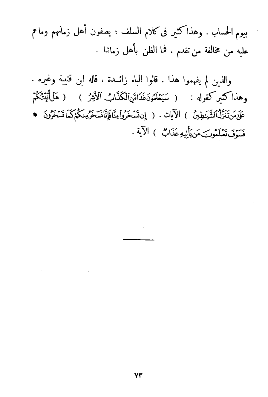 بِيَوْمِ الْحِسَابِ. وَهَذَا كَثِيرٌ فِي كَلَامِ السَّلَفِ؛ يَصِفُونَ أَهْلَ زَمَانِهِمْ وَمَا هُمْ عَلَيْهِ مِنْ مُخَالَفَةِ مَنْ تَقَدَّمَ فَمَا الظَّنُّ بِأَهْلِ زَمَانِنَا. وَاَلَّذِينَ لَمْ يَفْهَمُوا هَذَا. قَالُوا الْبَاءُ زَائِدَةٌ قَالَهُ ابْنُ قُتَيْبَةَ وَغَيْرُهُ. وَهَذَا كَثِيرٌ كَقَوْلِهِ: {سَيَعْلَمُونَ غَدًا مَنِ الْكَذَّابُ الْأَشِرُ} {هَلْ أُنَبِّئُكُمْ عَلَى مَنْ تَنَزَّلُ الشَّيَاطِينُ} الْآيَاتِ. {إنْ تَسْخَرُوا مِنَّا فَإِنَّا نَسْخَرُ مِنْكُمْ كَمَا تَسْخَرُونَ} {فَسَوْفَ تَعْلَمُونَ مَنْ يَأْتِيهِ عَذَابٌ} الْآيَةَ.