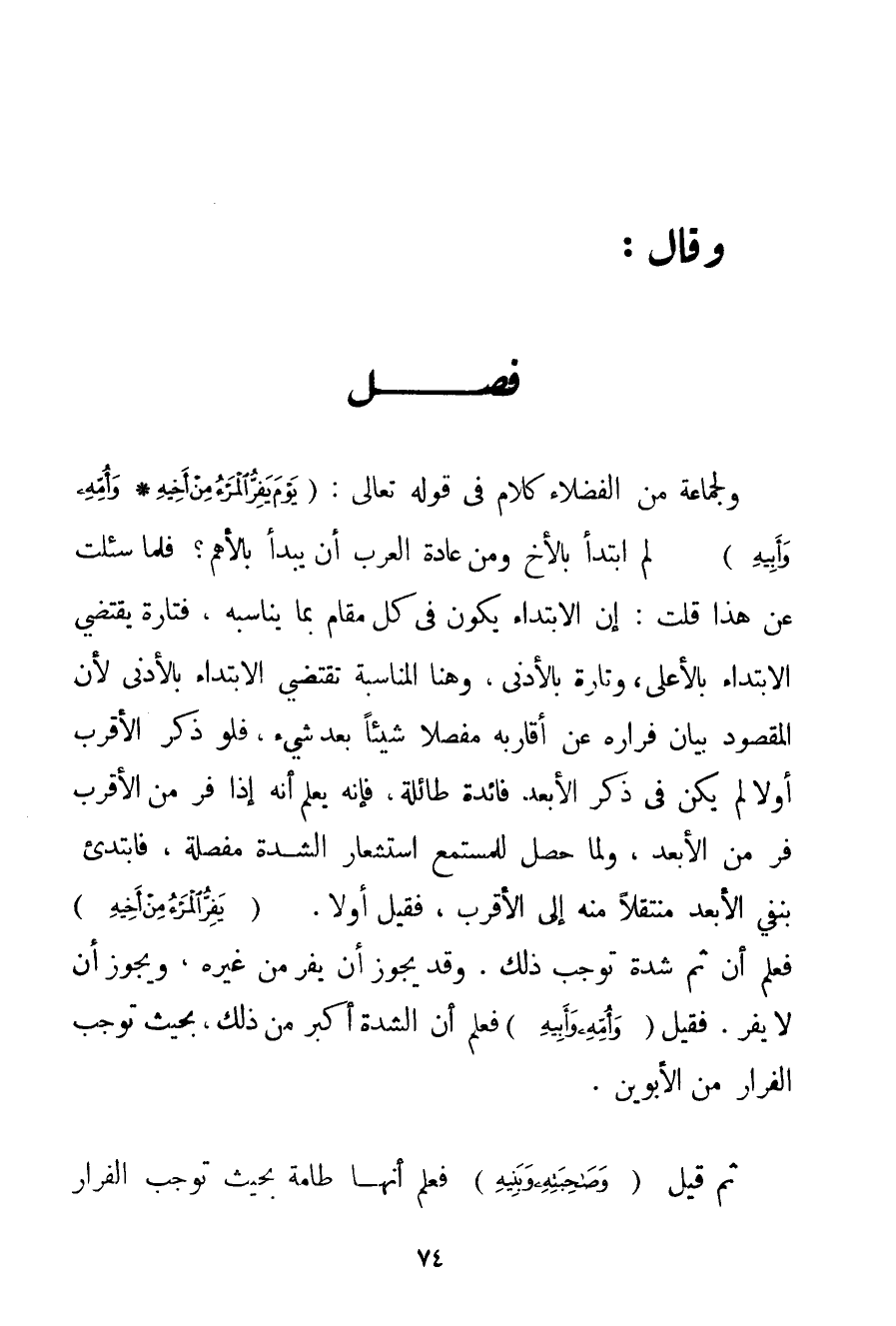 وَلِجَمَاعَةِ مِنْ الْفُضَلَاءِ كَلَامٌ فِي قَوْله تَعَالَى {يَوْمَ يَفِرُّ الْمَرْءُ مِنْ أَخِيهِ} {وَأُمِّهِ وَأَبِيهِ} لِمَ ابْتَدَأَ بِالْأَخِ وَمِنْ عَادَة الْعَرَبِ أَنْ يُبْدَأَ بِالْأَهَمِّ؟