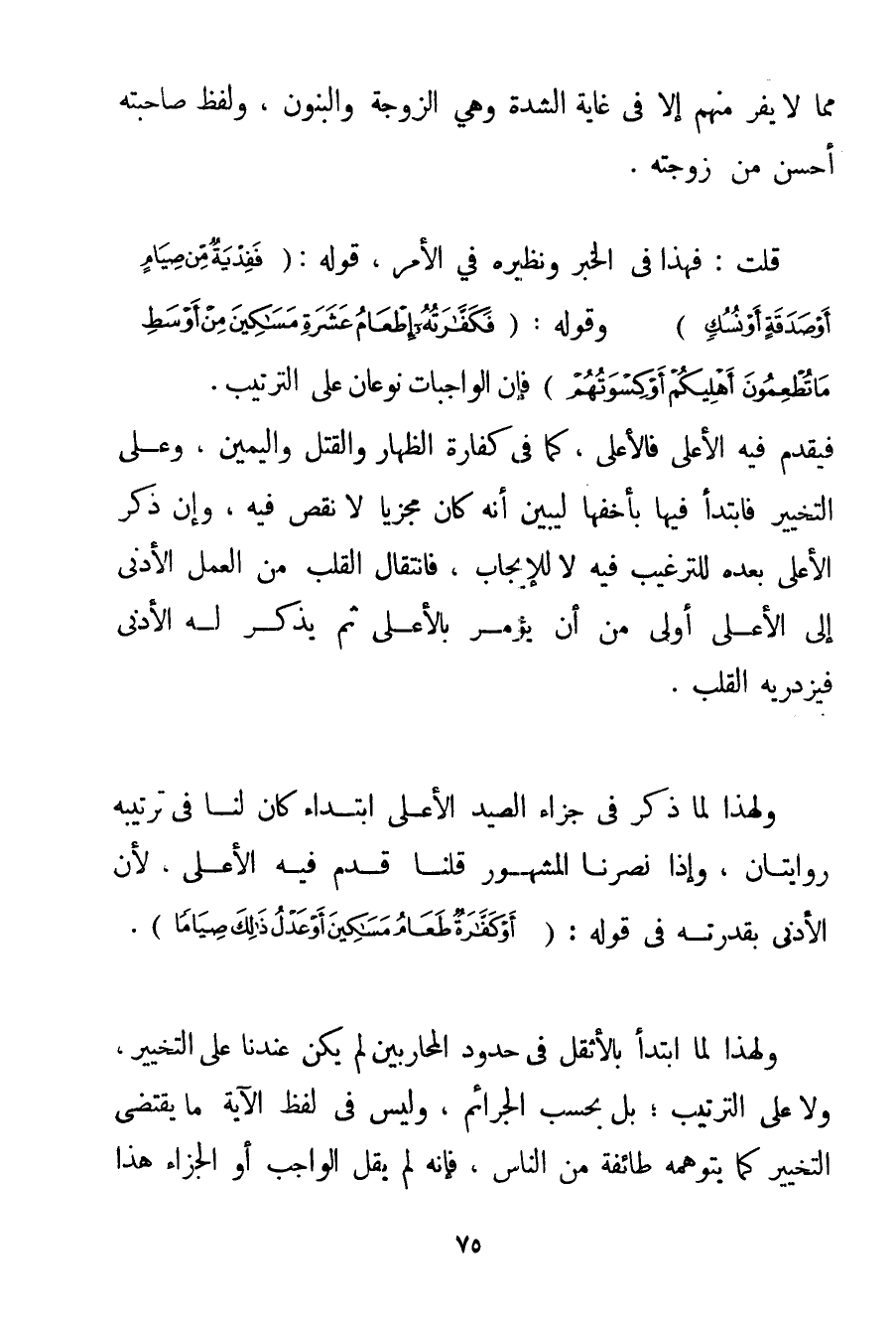 مِمَّا لَا يَفِرُّ مِنْهُمْ إلَّا فِي غَايَةِ الشِّدَّةِ وَهِيَ الزَّوْجَةُ وَالْبَنُونَ وَلَفْظُ صَاحِبَتِهِ أَحْسَنُ مِنْ زَوْجَتِهِ. قُلْت: فَهَذَا فِي الْخَبَرِ وَنَظِيرُهُ فِي الْأَمْرِ قَوْلُهُ: {فَفِدْيَةٌ مِنْ صِيَامٍ أَوْ صَدَقَةٍ أَوْ نُسُكٍ} وَقَوْلُهُ: {فَكَفَّارَتُهُ إطْعَامُ عَشَرَةِ مَسَاكِينَ مِنْ أَوْسَطِ مَا تُطْعِمُونَ أَهْلِيكُمْ أَوْ كِسْوَتُهُمْ} فَإِنَّ الْوَاجِبَاتِ نَوْعَانِ عَلَى التَّرْتِيبِ. فَيُقَدَّمُ فِيهِ الْأَعْلَى فَالْأَعْلَى كَمَا فِي كَفَّارَةِ الظِّهَارِ وَالْقَتْلِ وَالْيَمِينِ وَعَلَى التَّخْيِيرِ فَابْتَدَأَ فِيهَا بِأَخَفِّهَا لِيُبَيِّنَ أَنَّهُ كَانَ مُجْزِيًا لَا نَقْصَ فِيهِ وَإِنْ ذَكَرَ الْأَعْلَى بَعْدَهُ لِلتَّرْغِيبِ فِيهِ لَا لِلْإِيجَابِ فَانْتِقَالُ الْقَلْبِ مِنْ الْعَمَلِ الْأَدْنَى إلَى الْأَعْلَى أَوْلَى مِنْ أَنْ يُؤْمَرَ بِالْأَعْلَى ثُمَّ يُذْكَرُ لَهُ الْأَدْنَى فَيَزْدَرِيَهُ الْقَلْبُ. وَلِهَذَا لَمَّا ذَكَرَ فِي جَزَاءِ الصَّيْدِ الْأَعْلَى ابْتِدَاءً كَانَ لَنَا فِي تَرْتِيبِهِ رِوَايَتَانِ وَإِذَا نَصَرْنَا الْمَشْهُورَ قُلْنَا قَدَّمَ فِيهِ الْأَعْلَى لِأَنَّ الْأَدْنَى بِقُدْرَتِهِ فِي قَوْلِهِ: {أَوْ كَفَّارَةٌ طَعَامُ مَسَاكِينَ أَوْ عَدْلُ ذَلِكَ صِيَامًا} . وَلِهَذَا لَمَّا ابْتَدَأَ بِالْأَثْقَلِ فِي حُدُودِ الْمُحَارِبِينَ لَمْ يَكُنْ عِنْدَنَا عَلَى التَّخْيِيرِ وَلَا عَلَى التَّرْتِيبِ؛ بَلْ بِحَسَبِ الْجَرَائِمِ وَلَيْسَ فِي لَفْظِ الْآيَةِ مَا يَقْتَضِي التَّخْيِيرَ كَمَا يَتَوَهَّمُهُ طَائِفَةٌ مِنْ النَّاسِ فَإِنَّهُ لَمْ يَقُلْ الْوَاجِبُ أَوْ الْجَزَاءُ هَذَا