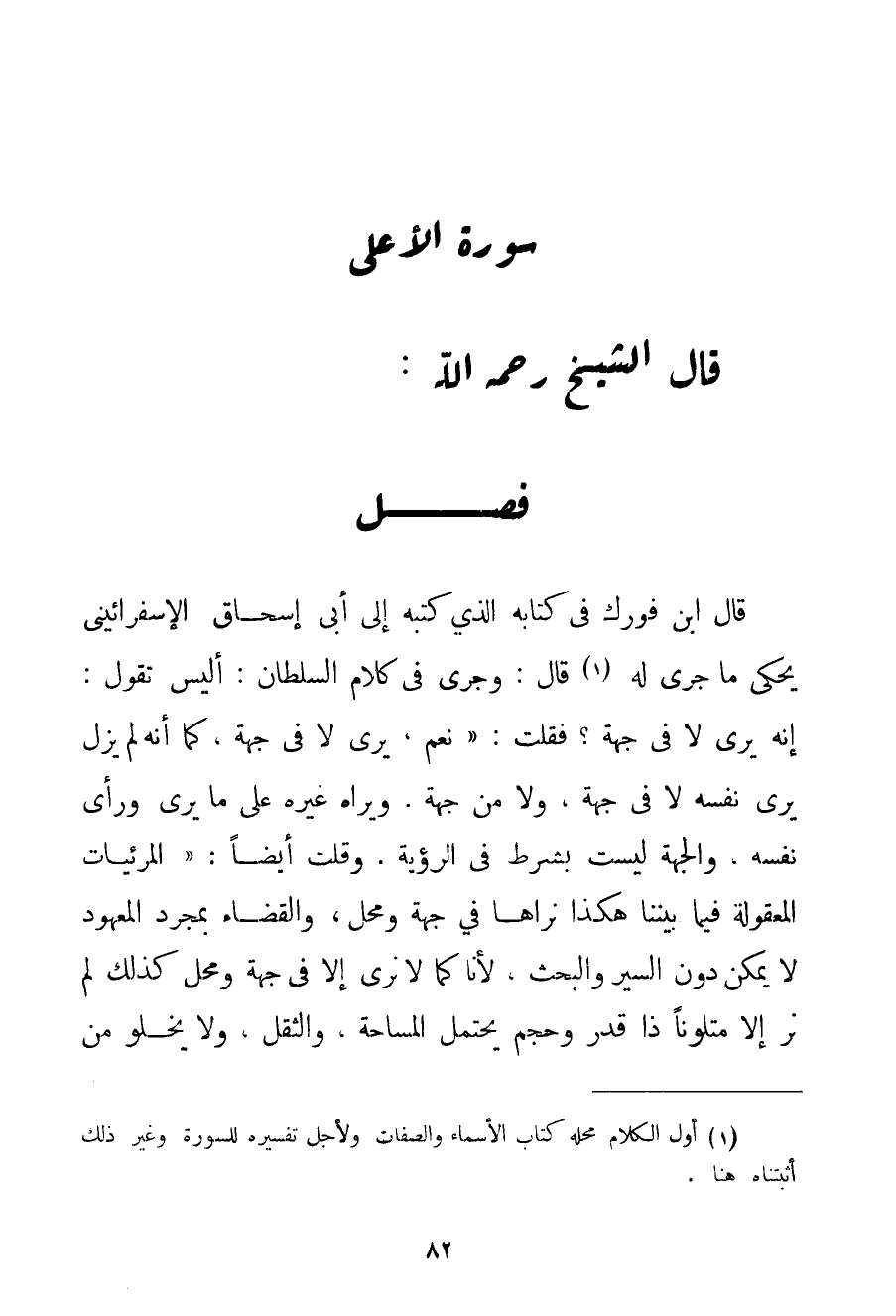 قَالَ ابْنُ فورك فِي كِتَابِهِ الَّذِي كَتَبَهُ إلَى أَبِي إسْحَاقَ الإسفراييني يَحْكِي مَا جَرَى لَهُ قَالَ: وَجَرَى فِي كَلَامِ السُّلْطَانِ: أَلَيْسَ تَقُولُ: إنَّهُ يُرَى لَا فِي جِهَةٍ؟ فَقُلْت: " نَعَمْ يُرَى لَا فِي جِهَةٍ كَمَا أَنَّهُ لَمْ يَزَلْ يَرَى نَفْسَهُ لَا فِي جِهَةٍ وَلَا مِنْ جِهَةٍ وَيَرَاهُ غَيْرُهُ عَلَى مَا يَرَى وَرَأَى نَفْسَهُ وَالْجِهَةُ لَيْسَتْ بِشَرْطِ فِي الرُّؤْيَةِ. وَقُلْت أَيْضًا: " الْمَرْئِيَّاتُ الْمَعْقُولَةُ فِيمَا بَيْنَنَا هَكَذَا نَرَاهَا فِي جِهَةٍ وَمَحَلٍّ. وَالْقَضَاءُ بِمُجَرَّدِ الْمَعْهُودِ لَا يُمْكِنُ دُونَ السَّيْرِ وَالْبَحْثِ لِأَنَّا كَمَا لَا نَرَى إلَّا فِي جِهَةٍ وَمَحَلٍّ كَذَلِكَ لَمْ نَرَ إلَّا مُتَلَوِّنًا ذَا قَدْرٍ وَحَجْمٍ يَحْتَمِلُ الْمِسَاحَةَ وَالثِّقَلَ وَلَا يَخْلُو مِنْ
