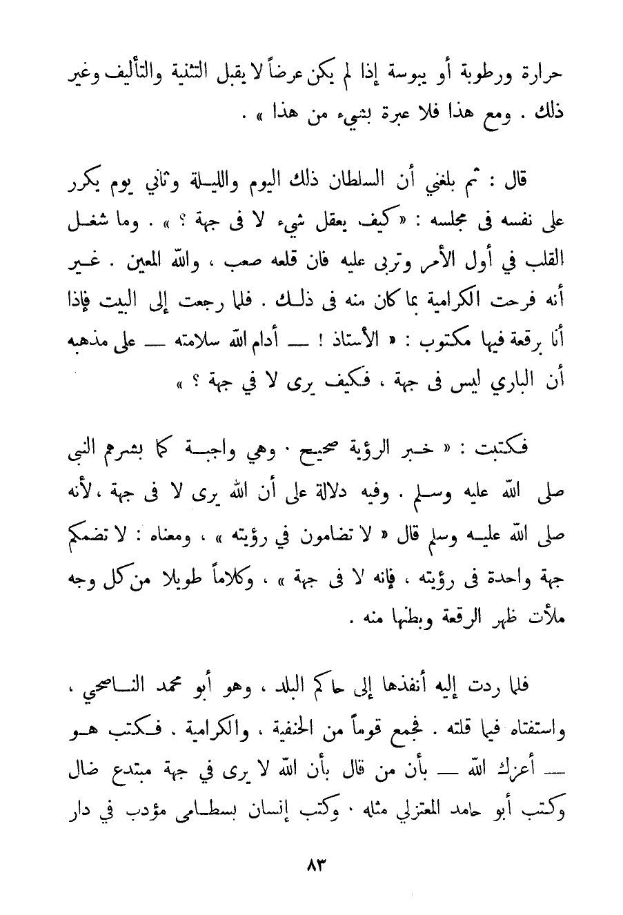 حَرَارَةٍ وَرُطُوبَةٍ أَوْ يُبُوسَةٍ إذَا لَمْ يَكُنْ عَرْضًا لَا يَقْبَلُ التَّثْنِيَةَ وَالتَّأْلِيفَ وَغَيْرَ ذَلِكَ. وَمَعَ هَذَا فَلَا عِبْرَةَ بِشَيْءٍ مِنْ هَذَا ". قَالَ: ثُمَّ بَلَغَنِي أَنَّ السُّلْطَانَ ذَلِكَ الْيَوْمَ وَاللَّيْلَةَ وَثَانِي يَوْمٍ يُكَرِّرُ عَلَى نَفْسِهِ فِي مَجْلِسِهِ: " كَيْفَ يُعْقَلُ شَيْءٌ لَا فِي جِهَةٍ؟ ". وَمَا شَغَلَ الْقَلْبَ فِي أَوَّلِ الْأَمْرِ وَتَرَبَّى عَلَيْهِ فَإِنَّ قَلْعَهُ صَعْبٌ وَاَللَّهُ الْمُعِينُ. غَيْرَ أَنَّهُ فَرِحَتْ الكَرَّامِيَة بِمَا كَانَ مِنْهُ فِي ذَلِكَ. فَلَمَّا رَجَعْت إلَى الْبَيْتِ فَإِذَا أَنَا بِرُقْعَةِ فِيهَا مَكْتُوبٌ: " الْأُسْتَاذُ أَدَامَ اللَّهُ سَلَامَتَهُ عَلَى مَذْهَبِهِ إنَّ الْبَارِيَ لَيْسَ فِي جِهَةٍ فَكَيْفَ يُرَى لَا فِي جِهَةٍ؟ " فَكَتَبْت: " خَبَرُ الرُّؤْيَةِ صَحِيحٌ وَهِيَ وَاجِبَةٌ كَمَا بَشَّرَهُمْ النَّبِيُّ صَلَّى اللَّهُ عَلَيْهِ وَسَلَّمَ وَفِيهِ دَلَالَةٌ عَلَى أَنَّ اللَّهَ يُرَى لَا فِي جِهَةٍ لِأَنَّهُ صَلَّى اللَّهُ عَلَيْهِ وَسَلَّمَ قَالَ {لَا تضامون فِي رُؤْيَتِهِ} وَمَعْنَاهُ: لَا تضمكم جِهَةٌ وَاحِدَةٌ فِي رُؤْيَتِهِ فَإِنَّهُ لَا فِي جِهَةٍ " وَكَلَامًا طَوِيلًا مِنْ كُلِّ وَجْهٍ مَلَأْت ظَهْرَ الرُّقْعَةِ وَبَطْنَهَا مِنْهُ. فَلَمَّا رُدَّتْ إلَيْهِ أَنْفَذَهَا إلَى حَاكِمِ الْبَلَدِ وَهُوَ أَبُو مُحَمَّدٍ الناصحي وَاسْتَفْتَاهُ فِيمَا قُلْته. فَجَمَعَ قَوْمًا مِنْ الْحَنَفِيَّةِ والكَرَّامِيَة فَكَتَبَ هُوَ أَعَزَّك اللَّهُ بِأَنَّ مَنْ قَالَ بِأَنَّ اللَّهَ لَا يُرَى فِي جِهَةٍ مُبْتَدَعٌ ضَالُّ وَكَتَبَ أَبُو حَامِدٍ الْمُعْتَزِلِيُّ مِثْلَهُ وَكَتَبَ إنْسَانٌ بسطامي مُؤَدَّبٌ فِي دَارِ
