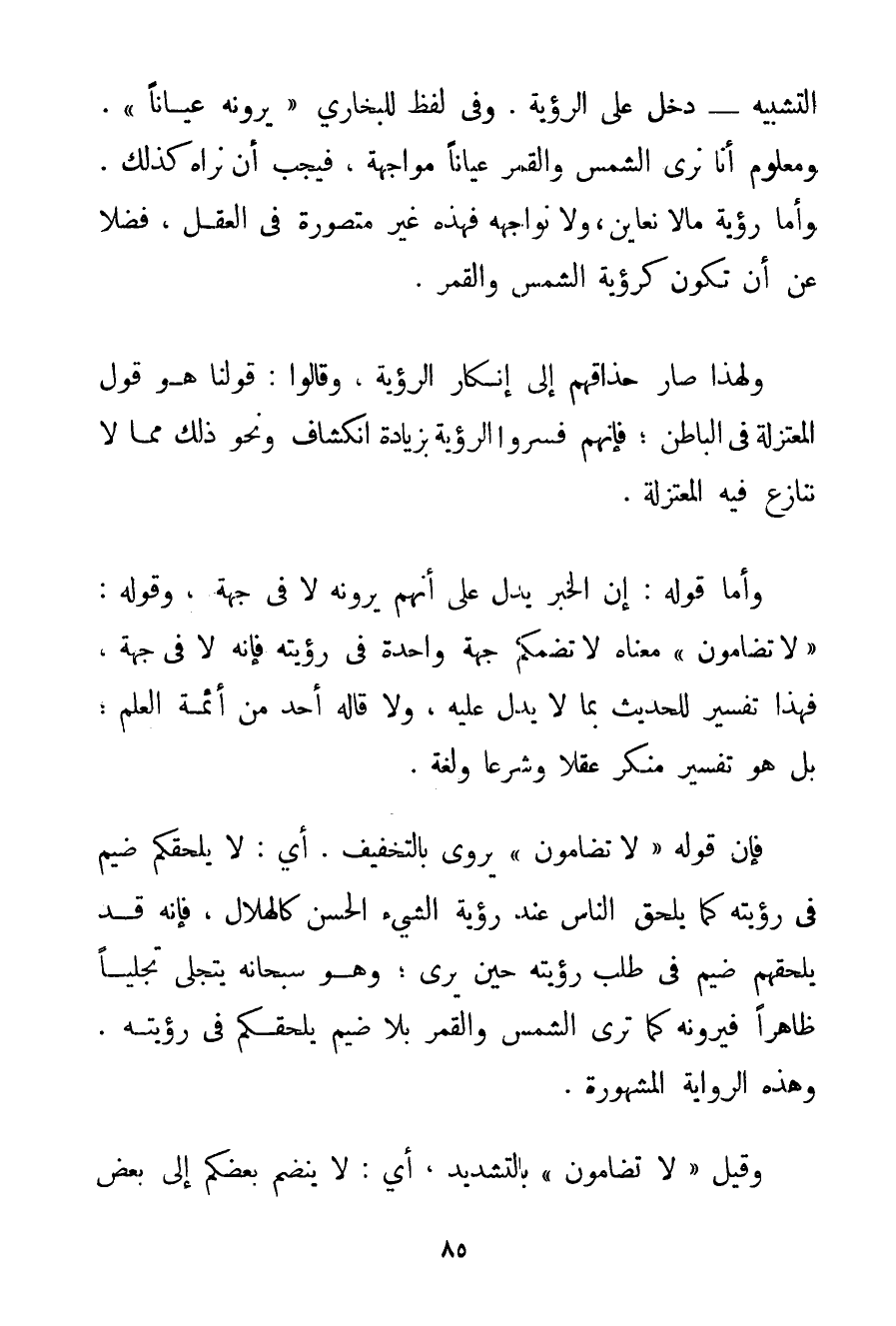التَّشْبِيهِ - دَخَلَ عَلَى الرُّؤْيَةِ. وَفِي لَفْظٍ لِلْبُخَارِيِّ {يَرَوْنَهُ عِيَانًا} . وَمَعْلُومٌ أَنَّا نَرَى الشَّمْسَ وَالْقَمَرَ عِيَانًا مُوَاجَهَةً فَيَجِبُ أَنْ نَرَاهُ كَذَلِكَ. وَأَمَّا رُؤْيَةُ مَا لَا نُعَايِنُ وَلَا نُوَاجِهُهُ فَهَذِهِ غَيْرُ مُتَصَوَّرَةٍ فِي الْعَقْلِ فَضْلًا عَنْ أَنْ تَكُونَ كَرُؤْيَةِ الشَّمْسِ وَالْقَمَرِ. وَلِهَذَا صَارَ حُذَّاقُهُمْ إلَى إنْكَارِ الرُّؤْيَةِ وَقَالُوا: قَوْلُنَا هُوَ قَوْلُ الْمُعْتَزِلَةِ فِي الْبَاطِنِ؛ فَإِنَّهُمْ فَسَّرُوا الرُّؤْيَةَ بِزِيَادَةِ انْكِشَافٍ وَنَحْوِ ذَلِكَ مِمَّا لَا نُنَازِعُ فِيهِ الْمُعْتَزِلَةَ. وَأَمَّا قَوْلُهُ: إنَّ الْخَبَرَ يَدُلُّ عَلَى أَنَّهُمْ يَرَوْنَهُ لَا فِي جِهَةٍ وَقَوْلُهُ: " لَا تضامون " مَعْنَاهُ لَا تضمكم جِهَةٌ وَاحِدَةٌ فِي رُؤْيَتِهِ فَإِنَّهُ لَا فِي جِهَةٍ فَهَذَا تَفْسِيرٌ لِلْحَدِيثِ بِمَا لَا يَدُلُّ عَلَيْهِ وَلَا قَالَهُ أَحَدٌ مِنْ أَئِمَّةِ الْعِلْمِ؛ بَلْ هُوَ تَفْسِيرٌ مُنْكَرٌ عَقْلًا وَشَرْعًا وَلُغَةً. فَإِنَّ قَوْلَهُ " لَا تُضَامُونَ " يُرْوَى بِالتَّخْفِيفِ. أَيْ: لَا يَلْحَقُكُمْ ضَيْمٌ فِي رُؤْيَتِهِ كَمَا يَلْحَقُ النَّاسَ عِنْدَ رُؤْيَةِ الشَّيْءِ الْحَسَنِ كَالْهِلَالِ فَإِنَّهُ قَدْ يَلْحَقُهُمْ ضَيْمٌ فِي طَلَبِ رُؤْيَتِهِ حِينَ يُرَى؛ وَهُوَ سُبْحَانَهُ يَتَجَلَّى تَجَلِّيًا ظَاهِرًا فَيَرَوْنَهُ كَمَا تُرَى الشَّمْسُ وَالْقَمَرُ بِلَا ضَيْمٍ يَلْحَقُكُمْ فِي رُؤْيَتِهِ. وَهَذِهِ الرِّوَايَةُ الْمَشْهُورَةُ. وَقِيلَ " لَا تضامون " بِالتَّشْدِيدِ أَيْ: لَا يَنْضَمُّ بَعْضُكُمْ إلَى بَعْضٍ