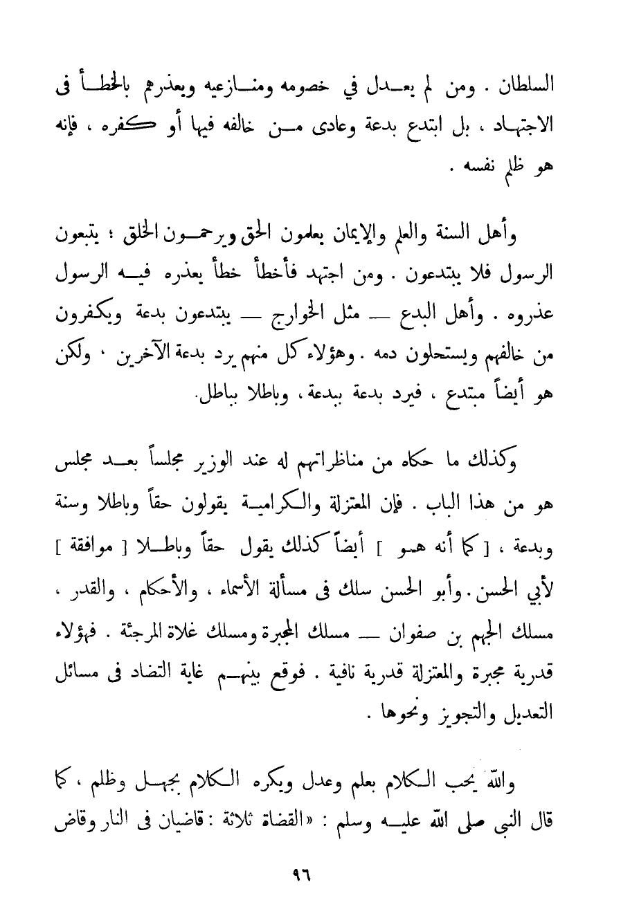 السُّلْطَانِ. وَمَنْ لَمْ يَعْدِلْ فِي خُصُومِهِ وَمُنَازَعِيهِ وَيَعْذُرْهُمْ بِالْخَطَأِ فِي الِاجْتِهَادِ بَلْ ابْتَدَعَ بِدْعَةً وَعَادَى مَنْ خَالَفَهُ فِيهَا أَوْ كَفَّرَهُ فَإِنَّهُ هُوَ ظَلَمَ نَفْسَهُ. وَأَهْلُ السُّنَّةِ وَالْعِلْمِ وَالْإِيمَانِ يَعْلَمُونَ الْحَقَّ وَيَرْحَمُونَ الْخَلْقَ؛ يَتَّبِعُونَ الرَّسُولَ فَلَا يَبْتَدِعُونَ. وَمَنْ اجْتَهَدَ فَأَخْطَأَ خَطَأً يَعْذُرُهُ فِيهِ الرَّسُولُ عَذَرُوهُ. وَأَهْلُ الْبِدَعِ مِثْلُ الْخَوَارِجِ يَبْتَدِعُونَ بِدْعَةً وَيُكَفِّرُونَ مَنْ خَالَفَهُمْ وَيَسْتَحِلُّونَ دَمَهُ. وَهَؤُلَاءِ كُلٌّ مِنْهُمْ يَرُدُّ بِدْعَةَ الْآخَرِينَ وَلَكِنْ هُوَ أَيْضًا مُبْتَدِعٌ فَيَرُدُّ بِدْعَةً بِبِدْعَةِ وَبَاطِلًا بِبَاطِلِ. وَكَذَلِكَ مَا حَكَاهُ مِنْ مُنَاظَرَاتِهِمْ لَهُ عِنْدَ الْوَزِيرِ مَجْلِسًا بَعْدَ مَجْلِسٍ هُوَ مِنْ هَذَا الْبَابِ. فَإِنَّ الْمُعْتَزِلَةَ والكَرَّامِيَة يَقُولُونَ حَقًّا وَبَاطِلًا وَسُنَّةً وَبِدْعَةً كَمَا أَنَّهُ هُوَ أَيْضًا كَذَلِكَ يَقُولُ حَقًّا وَبَاطِلًا مُوَافَقَةً لِأَبِي الْحَسَنِ. وَأَبُو الْحَسَنِ سَلَكَ فِي مَسْأَلَةِ الْأَسْمَاءِ وَالْأَحْكَامِ وَالْقَدَرِ مَسْلَكَ الْجَهْمِ بْنِ صَفْوَان - مَسْلَكَ الْمُجْبِرَةِ وَمَسْلَكَ غُلَاةِ الْمُرْجِئَةِ. فَهَؤُلَاءِ قَدَرِيَّةٌ مُجْبِرَةٌ وَالْمُعْتَزِلَةُ قَدَرِيَّةٌ نَافِيَةٌ. فَوَقَعَ بَيْنَهُمْ غَايَةُ التَّضَادِّ فِي مَسَائِلِ التَّعْدِيلِ وَالتَّجْوِيرِ وَنَحْوِهَا. وَاَللَّهُ يُحِبُّ الْكَلَامَ بِعِلْمِ وَعَدْلٍ وَيَكْرَهُ الْكَلَامَ بِجَهْلِ وَظُلْمٍ كَمَا قَالَ النَّبِيُّ صَلَّى اللَّهُ عَلَيْهِ وَسَلَّمَ {الْقُضَاةُ ثَلَاثَةٌ: قَاضِيَانِ فِي النَّارِ وَقَاضٍ
