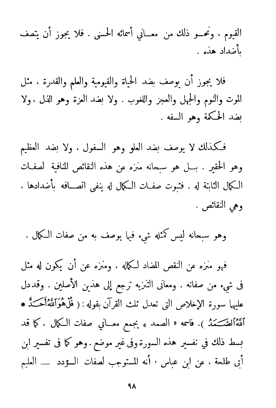 الْقَيُّومُ وَنَحْوُ ذَلِكَ مِنْ مَعَانِي أَسْمَائِهِ الْحُسْنَى. فَلَا يَجُوزُ أَنْ يَتَّصِفَ بِأَضْدَادِ هَذِهِ. فَلَا يَجُوزُ أَنْ يُوصَفَ بِضِدِّ الْحَيَاةِ والقيومية وَالْعِلْمِ وَالْقُدْرَةِ مِثْلِ الْمَوْتِ وَالنَّوْمِ وَالْجَهْلِ وَالْعَجْزِ وَاللُّغُوبِ. وَلَا بِضِدِّ الْعِزَّةِ وَهُوَ الذُّلُّ وَلَا بِضِدِّ الْحِكْمَةِ وَهُوَ السَّفَهُ. فَكَذَلِكَ لَا يُوصَفُ بِضِدِّ الْعُلُوِّ وَهُوَ السُّفُولُ وَلَا بِضِدِّ الْعَظِيمِ وَهُوَ الْحَقِيرُ. بَلْ هُوَ سُبْحَانَهُ مُنَزَّهٌ عَنْ هَذِهِ النَّقَائِصِ الْمُنَافِيَةِ لِصِفَاتِ الْكَمَالِ الثَّابِتَةِ لَهُ. فَثُبُوتُ صِفَاتِ الْكَمَالِ لَهُ يَنْفِي اتِّصَافَهُ بِأَضْدَادِهَا وَهِيَ النَّقَائِصُ. وَهُوَ سُبْحَانَهُ لَيْسَ كَمِثْلِهِ شَيْءٌ فِيمَا يُوصَفُ بِهِ مِنْ صِفَاتِ الْكَمَالِ. فَهُوَ مُنَزَّهٌ عَنْ النَّقْصِ الْمُضَادِّ لِكَمَالِهِ وَمُنَزَّهٌ عَنْ أَنْ يَكُونَ لَهُ مِثْلٌ فِي شَيْءٍ مِنْ صِفَاتِهِ. وَمَعَانِي التَّنْزِيهِ تَرْجِعُ إلَى هَذَيْنِ الْأَصْلَيْنِ. وَقَدْ دَلَّ عَلَيْهِمَا سُورَةُ الْإِخْلَاصِ الَّتِي تَعْدِلُ ثُلُثَ الْقُرْآنِ بِقَوْلِهِ: {قُلْ هُوَ اللَّهُ أَحَدٌ} {اللَّهُ الصَّمَدُ} . فَاسْمُهُ " الصَّمَدُ " يَجْمَعُ مَعَانِي صِفَاتِ الْكَمَالِ كَمَا قَدْ بُسِطَ ذَلِكَ فِي تَفْسِيرِ هَذِهِ السُّورَةِ وَفِي غَيْرِ مَوْضِعٍ. وَهُوَ كَمَا فِي تَفْسِيرِ ابْنِ أَبِي طَلْحَةَ عَنْ ابْنِ عَبَّاسٍ أَنَّهُ الْمُسْتَوْجِبُ لِصِفَاتِ السُّؤْدُدِ الْعَلِيمُ