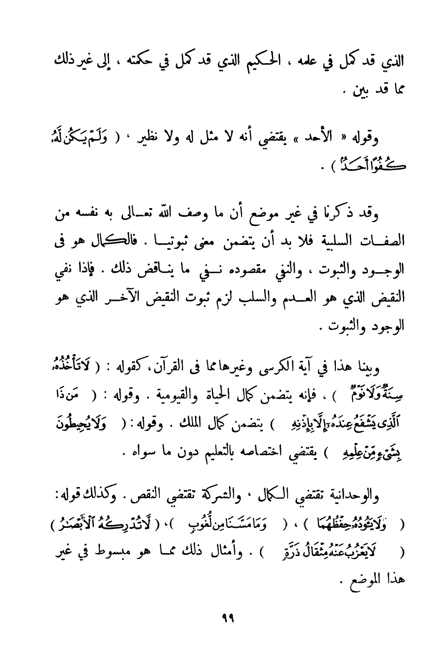 الَّذِي قَدْ كَمُلَ فِي عِلْمِهِ الْحَكِيمُ الَّذِي قَدْ كَمُلَ فِي حِكْمَتِهِ إلَى غَيْرِ ذَلِكَ مِمَّا قَدْ بُيِّنَ. وَقَوْلُهُ " الْأَحَدُ " يَقْتَضِي أَنَّهُ لَا مِثْلَ لَهُ وَلَا نَظِيرَ {وَلَمْ يَكُنْ لَهُ كُفُوًا أَحَدٌ} . وَقَدْ ذَكَرْنَا فِي غَيْرِ مَوْضِعٍ أَنَّ مَا وَصَفَ اللَّهُ تَعَالَى بِهِ نَفْسَهُ مِنْ الصِّفَاتِ السَّلْبِيَّةِ فَلَا بُدَّ أَنْ يَتَضَمَّنَ مَعْنًى ثُبُوتِيًّا. فَالْكَمَالُ هُوَ فِي الْوُجُودِ وَالثُّبُوتِ وَالنَّفْيُ مَقْصُودُهُ نَفْيُ مَا يُنَاقِضُ ذَلِكَ. فَإِذَا نُفِيَ النَّقِيضُ الَّذِي هُوَ الْعَدَمُ وَالسَّلْبُ لَزِمَ ثُبُوتُ النَّقِيضِ الْآخَرِ الَّذِي هُوَ الْوُجُودُ وَالثُّبُوتُ. وَبَيَّنَّا هَذَا فِي آيَةِ الْكُرْسِيِّ وَغَيْرِهَا مِمَّا فِي الْقُرْآنِ كَقَوْلِهِ: {لَا تَأْخُذُهُ سِنَةٌ وَلَا نَوْمٌ} فَإِنَّهُ يَتَضَمَّنُ كَمَالَ الْحَيَاةِ والقيومية. وَقَوْلُهُ: {مَنْ ذَا الَّذِي يَشْفَعُ عِنْدَهُ إلَّا بِإِذْنِهِ} يَتَضَمَّنُ كَمَالَ الْمُلْكِ. وَقَوْلُهُ: {وَلَا يُحِيطُونَ بِشَيْءٍ مِنْ عِلْمِهِ} يَقْتَضِي اخْتِصَاصَهُ بِالتَّعْلِيمِ دُونَ مَا سِوَاهُ. والوحدانية تَقْتَضِي الْكَمَالَ وَالشَّرِكَةُ تَقْتَضِي النَّقْصَ. وَكَذَلِكَ قَوْلُهُ: {وَلَا يَئُودُهُ حِفْظُهُمَا} {وَمَا مَسَّنَا مِنْ لُغُوبٍ} {لَا تُدْرِكُهُ الْأَبْصَارُ} {لَا يَعْزُبُ عَنْهُ مِثْقَالُ ذَرَّةٍ} . وَأَمْثَالُ ذَلِكَ مِمَّا هُوَ مَبْسُوطٌ فِي غَيْرِ هَذَا الْمَوْضِعِ.