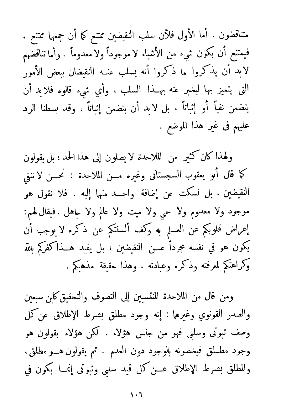 مُتَنَاقِضُونَ أَمَّا الْأَوَّلُ فَلِأَنَّ سَلْبَ النَّقِيضَيْنِ مُمْتَنِعٌ كَمَا أَنَّ جَمْعَهُمَا مُمْتَنِعٌ فَيَمْتَنِعُ أَنْ يَكُونَ شَيْءٌ مِنْ الْأَشْيَاءِ لَا مَوْجُودًا وَلَا مَعْدُومًا. وَأَمَّا تَنَاقُضُهُمْ لَا بُدَّ أَنْ يَذْكُرُوا مَا ذَكَرُوا أَنَّهُ يُسْلَبُ عَنْهُ النَّقِيضَانِ بِبَعْضِ الْأُمُورِ الَّتِي يَتَمَيَّزُ بِهَا لِيُخْبِرَ عَنْهُ بِهَذَا السَّلْبِ وَأَيُّ شَيْءٍ قَالُوهُ فَلَا بُدَّ أَنْ يَتَضَمَّنَ نَفْيًا أَوْ إثْبَاتًا بَلْ لَا بُدَّ أَنْ يَتَضَمَّنَ إثْبَاتًا وَقَدْ بَسَطْنَا الرَّدَّ عَلَيْهِمْ فِي غَيْرِ هَذَا الْمَوْضِعِ. وَلِهَذَا كَانَ كَثِيرٌ مِنْ الْمَلَاحِدَةِ لَا يَصِلُونَ إلَى هَذَا الْحَدِّ؛ بَلْ يَقُولُونَ كَمَا قَالَ أَبُو يَعْقُوبَ السجستاني وَغَيْرُهُ مِنْ الْمَلَاحِدَةِ: نَحْنُ لَا نَنْفِي النَّقِيضَيْنِ بَلْ نَسْكُتُ عَنْ إضَافَةِ وَاحِدٍ مِنْهُمَا إلَيْهِ؛ فَلَا نَقُولُ هُوَ مَوْجُودٌ وَلَا مَعْدُومٌ وَلَا حَيٌّ وَلَا مَيِّتٌ وَلَا عَالِمٌ وَلَا جَاهِلٌ. فَيُقَالُ لَهُمْ: إعْرَاضُ قُلُوبِكُمْ عَنْ الْعِلْمِ بِهِ وَكَفُّ أَلْسِنَتِكُمْ عَنْ ذِكْرِهِ لَا يُوجِبُ أَنْ يَكُونَ هُوَ فِي نَفْسِهِ مُجَرَّدًا عَنْ النَّقِيضَيْنِ؛ بَلْ يُفِيدُ هَذَا كُفْرَكُمْ بِاَللَّهِ وَكَرَاهَتَكُمْ لِمَعْرِفَتِهِ وَذِكْرِهِ وَعِبَادَتِهِ وَهَذَا حَقِيقَةُ مَذْهَبِكُمْ. وَمَنْ قَالَ مِنْ الْمَلَاحِدَةِ الْمُنْتَسِبِينَ إلَى التَّصَوُّفِ وَالتَّحْقِيقِ كَابْنِ سَبْعِينَ وَالصَّدْرِ القُونَوي وَغَيْرِهِمَا: إنَّهُ وُجُودٌ مُطْلَقٌ بِشَرْطِ الْإِطْلَاقِ عَنْ كُلِّ وَصْفٍ ثُبُوتِيٍّ وَسَلْبِيٍّ فَهُوَ مِنْ جِنْسِ هَؤُلَاءِ. لَكِنَّ هَؤُلَاءِ يَقُولُونَ هُوَ وُجُودٌ مُطْلَقٌ فَيَخُصُّونَهُ بِالْوُجُودِ دُونَ الْعَدَمِ. ثُمَّ يَقُولُونَ هُوَ مُطْلَقٌ وَالْمُطْلَقُ بِشَرْطِ الْإِطْلَاقِ عَنْ كُلِّ قَيْدٍ سَلْبِيٍّ وَثُبُوتِيٍّ إنَّمَا يَكُونُ