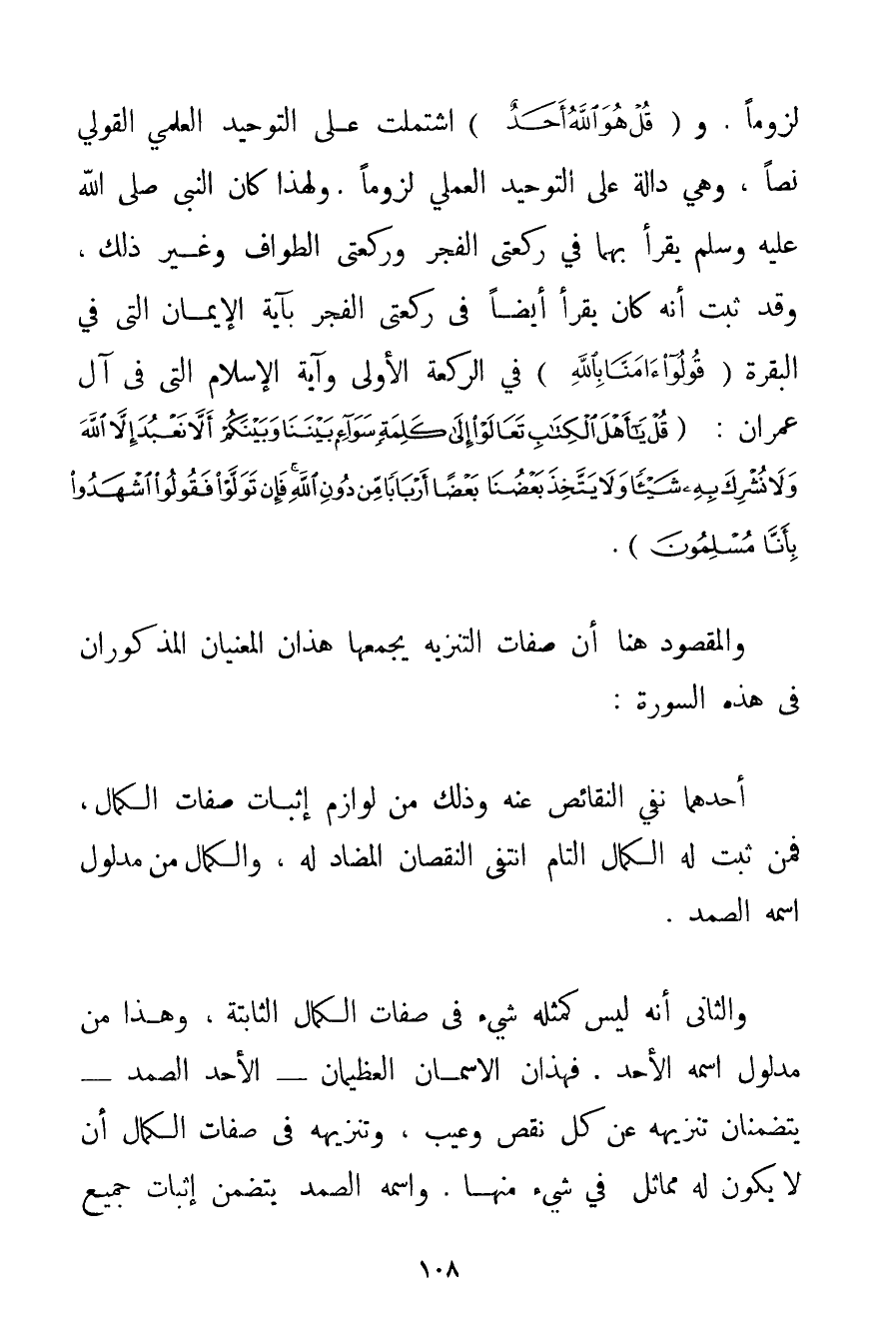 لُزُومًا. و {قُلْ هُوَ اللَّهُ أَحَدٌ} اشْتَمَلَتْ عَلَى التَّوْحِيدِ الْعِلْمِيِّ الْقَوْلِيِّ نَصًّا وَهِيَ دَالَّةٌ عَلَى التَّوْحِيدِ الْعَمَلِيِّ لُزُومًا. وَلِهَذَا كَانَ النَّبِيُّ صَلَّى اللَّهُ عَلَيْهِ وَسَلَّمَ يَقْرَأُ بِهِمَا فِي رَكْعَتَيْ الْفَجْرِ وَرَكْعَتَيْ الطَّوَافِ وَغَيْرِ ذَلِكَ وَقَدْ ثَبَتَ أَنَّهُ كَانَ يَقْرَأُ أَيْضًا فِي رَكْعَتَيْ الْفَجْرِ بِآيَةِ الْإِيمَانِ الَّتِي فِي الْبَقَرَةِ {قُولُوا آمَنَّا بِاللَّهِ} فِي الرَّكْعَةِ الْأُولَى وَآيَةِ الْإِسْلَامِ الَّتِي فِي آلِ عِمْرَانَ: {قُلْ يَا أَهْلَ الْكِتَابِ تَعَالَوْا إلَى كَلِمَةٍ سَوَاءٍ بَيْنَنَا وَبَيْنَكُمْ أَلَّا نَعْبُدَ إلَّا اللَّهَ وَلَا نُشْرِكَ بِهِ شَيْئًا وَلَا يَتَّخِذَ بَعْضُنَا بَعْضًا أَرْبَابًا مِنْ دُونِ اللَّهِ فَإِنْ تَوَلَّوْا فَقُولُوا اشْهَدُوا بِأَنَّا مُسْلِمُونَ} . وَالْمَقْصُودُ هُنَا أَنَّ صِفَاتِ التَّنْزِيهِ يَجْمَعُهَا هَذَانِ الْمَعْنَيَانِ الْمَذْكُورَانِ فِي هَذِهِ السُّورَةِ: أَحَدُهُمَا نَفْيُ النَّقَائِصِ عَنْهُ وَذَلِكَ مِنْ لَوَازِمِ إثْبَاتِ صِفَاتِ الْكَمَالِ فَمَنْ ثَبَتَ لَهُ الْكَمَالُ التَّامُّ انْتَفَى النُّقْصَانُ الْمُضَادُّ لَهُ وَالْكَمَالُ مِنْ مَدْلُولِ اسْمِهِ الصَّمَدِ. وَالثَّانِي أَنَّهُ لَيْسَ كَمِثْلِهِ شَيْءٌ فِي صِفَاتِ الْكَمَالِ الثَّابِتَةِ وَهَذَا مِنْ مَدْلُولِ اسْمِهِ الْأَحَدِ. فَهَذَانِ الِاسْمَانِ الْعَظِيمَانِ - الْأَحَدُ الصَّمَدُ - يَتَضَمَّنَانِ تَنْزِيهَهُ عَنْ كُلِّ نَقْصٍ وَعَيْبٍ وَتَنْزِيهِهِ فِي صِفَاتِ الْكَمَالِ أَنْ لَا يَكُونَ لَهُ مُمَاثِلٌ فِي شَيْءٍ مِنْهَا. وَاسْمُهُ الصَّمَدُ يَتَضَمَّنُ إثْبَاتَ جَمِيعِ