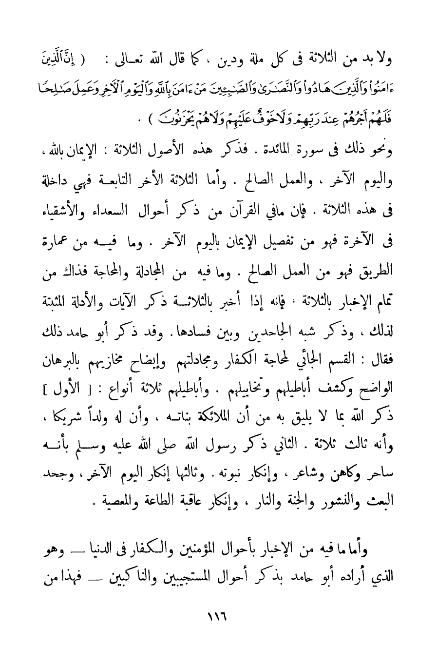 وَلَا بُدَّ مِنْ الثَّلَاثَةِ فِي كُلِّ مِلَّةٍ وَدِينٍ كَمَا قَالَ اللَّهُ تَعَالَى: {إنَّ الَّذِينَ آمَنُوا وَالَّذِينَ هَادُوا وَالنَّصَارَى وَالصَّابِئِينَ مَنْ آمَنَ بِاللَّهِ وَالْيَوْمِ الْآخِرِ وَعَمِلَ صَالِحًا فَلَهُمْ أَجْرُهُمْ عِنْدَ رَبِّهِمْ وَلَا خَوْفٌ عَلَيْهِمْ وَلَا هُمْ يَحْزَنُونَ} . وَنَحْوُ ذَلِكَ فِي سُورَةِ الْمَائِدَةِ. فَذَكَرَ هَذِهِ الْأُصُولَ الثَّلَاثَةَ: الْإِيمَانُ بِاَللَّهِ وَالْيَوْمِ الْآخِرِ وَالْعَمَلُ الصَّالِحُ. وَأَمَّا الثَّلَاثَةُ الْأُخَرُ التَّابِعَةُ فَهِيَ دَاخِلَةٌ فِي هَذِهِ الثَّلَاثَةِ. فَإِنَّ مَا فِي الْقُرْآنِ مِنْ ذِكْرِ أَحْوَالِ السُّعَدَاءِ وَالْأَشْقِيَاءِ فِي الْآخِرَةِ فَهُوَ مِنْ تَفْضِيلِ الْإِيمَانِ بِالْيَوْمِ الْآخِرِ. وَمَا فِيهِ مِنْ عِمَارَةِ الطَّرِيقِ فَهُوَ مِنْ الْعَمَلِ الصَّالِحِ. وَمَا فِيهِ مِنْ الْمُجَادَلَةِ وَالْمُحَاجَّةِ فَذَاكَ مِنْ تَمَامِ الْإِخْبَارِ بِالثَّلَاثَةِ فَإِنَّهُ إذَا أَخْبَرَ بِالثَّلَاثَةِ ذَكَرَ الْآيَاتِ وَالْأَدِلَّةَ الْمُثْبِتَةَ لِذَلِكَ وَذَكَرَ شِبْهَ الْجَاحِدِينَ وَبَيَّنَ فَسَادَهَا. وَقَدْ ذَكَرَ أَبُو حَامِدٍ ذَلِكَ فَقَالَ: الْقِسْمُ الْجَائِي لِمُحَاجَّةِ الْكُفَّارِ وَمُجَادَلَتِهِمْ وَإِيضَاحِ مَخَازِيهِمْ بِالْبُرْهَانِ الْوَاضِحِ وَكَشْفِ أَبَاطِيلِهِمْ وتخاييلهم. وَأَبَاطِيلُهُمْ ثَلَاثَةُ أَنْوَاعٍ: