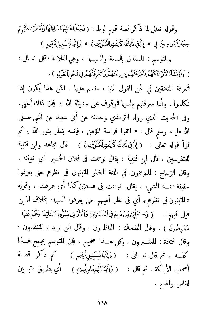 وَقَوْلُهُ تَعَالَى لِمَا ذَكَرَ قِصَّةَ قَوْمِ لُوطٍ: {فَجَعَلْنَا عَالِيَهَا سَافِلَهَا وَأَمْطَرْنَا عَلَيْهِمْ حِجَارَةً مِنْ سِجِّيلٍ} {إنَّ فِي ذَلِكَ لَآيَاتٍ لِلْمُتَوَسِّمِينَ} {وَإِنَّهَا لَبِسَبِيلٍ مُقِيمٍ} وَالْمُتَوَسِّمُ: الْمُسْتَدِلُّ بِالسِّمَةِ وَالسِّيمَا وَهِيَ الْعَلَامَةُ قَالَ تَعَالَى: {وَلَوْ نَشَاءُ لَأَرَيْنَاكَهُمْ فَلَعَرَفْتَهُمْ بِسِيمَاهُمْ وَلَتَعْرِفَنَّهُمْ فِي لَحْنِ الْقَوْلِ} . فَمَعْرِفَةُ الْمُنَافِقِينَ فِي لَحْنِ الْقَوْلِ ثَابِتَةٌ مَقْسَمٌ عَلَيْهَا لَكِنَّ هَذَا يَكُونُ إذَا تَكَلَّمُوا وَأَمَّا مَعْرِفَتُهُمْ بِالسِّيمَا فَمَوْقُوفٌ عَلَى مَشِيئَةِ اللَّهِ؛ فَإِنَّ ذَلِكَ أَخْفَى. وَفِي الْحَدِيثِ الَّذِي رَوَاهُ التِّرْمِذِيُّ وَحَسَّنَهُ عَنْ أَبِي سَعِيدٍ عَنْ النَّبِيِّ صَلَّى اللَّهُ عَلَيْهِ وَسَلَّمَ قَالَ: {اتَّقُوا فِرَاسَةَ الْمُؤْمِنِ فَإِنَّهُ يَنْظُرُ بِنُورِ اللَّهِ ثُمَّ قَرَأَ قَوْلَهُ تَعَالَى: {إنَّ فِي ذَلِكَ لَآيَاتٍ لِلْمُتَوَسِّمِينَ} } قَالَ مُجَاهِدٌ وَابْنُ قُتَيْبَةَ لِلْمُتَفَرَّسِينَ قَالَ ابْنُ قُتَيْبَةَ: يُقَالُ تَوَسَّمْت فِي فُلَانٍ الْخَيْرَ أَيْ تَبَيَّنْته وَقَالَ الزَّجَّاجُ: الْمُتَوَسِّمُونَ فِي اللُّغَةِ النُّظَّارُ الْمُثْبِتُونَ فِي نَظَرِهِمْ حَتَّى يَعْرِفُوا حَقِيقَةَ سِمَةِ الشَّيْءِ يُقَالُ تَوَسَّمْت فِي فُلَانٍ كَذَا أَيْ عَرَفْت وَقَوْلُهُ " الْمُثْبِتُونَ فِي نَظَرِهِمْ " أَيْ فِي نَظَرِ أَعْيُنِهِمْ حَتَّى يَعْرِفُوا السِّيمَا بِخِلَافِ الَّذِينَ قِيلَ فِيهِمْ: {وَكَأَيِّنْ مِنْ آيَةٍ فِي السَّمَاوَاتِ وَالْأَرْضِ يَمُرُّونَ عَلَيْهَا وَهُمْ عَنْهَا مُعْرِضُونَ} . وَقَالَ الضَّحَّاكُ: النَّاظِرُونَ وَقَالَ ابْنُ زَيْدٍ: الْمُنْتَقِدُونَ وَقَالَ قتادة: الْمُعْتَبِرُونَ. وَكُلُّ هَذَا صَحِيحٌ فَإِنَّ الْمُتَوَسِّمَ يَجْمَعُ هَذَا كُلَّهُ. ثُمَّ قَالَ تَعَالَى: {وَإِنَّهَا لَبِسَبِيلٍ مُقِيمٍ} ثُمَّ ذَكَرَ قِصَّةَ أَصْحَابِ الْأَيْكَةِ. ثُمَّ قَالَ: {وَإِنَّهُمَا لَبِإِمَامٍ مُبِينٍ} أَيْ بِطَرِيقِ مُتَبَيِّنٍ لِلنَّاسِ وَاضِحٍ.