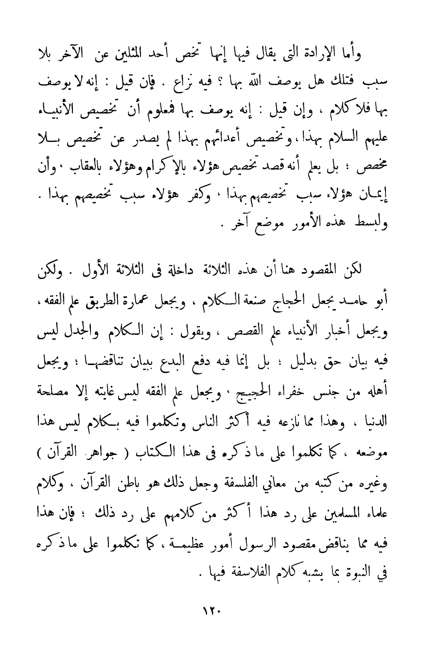 وَأَمَّا الْإِرَادَةُ الَّتِي يُقَالُ فِيهَا إنَّهَا تَخُصُّ أَحَدَ الْمِثْلَيْنِ عَنْ الْآخَرِ بِلَا سَبَبٍ فَتِلْكَ هَلْ يُوصَفُ اللَّهُ بِهَا؟ فِيهِ نِزَاعٌ. فَإِنْ قِيلَ: إنَّهُ لَا يُوصَفُ بِهَا فَلَا كَلَامَ وَإِنْ قِيلَ: إنَّهُ يُوصَفُ بِهَا فَمَعْلُومٌ أَنَّ تَخْصِيصَ الْأَنْبِيَاءِ عَلَيْهِمْ السَّلَامُ بِهَذَا وَتَخْصِيصَ أَعْدَائِهِمْ بِهَذَا لَمْ يَصْدُرْ عَنْ تَخْصِيصٍ بِلَا مُخَصَّصٍ؛ بَلْ يُعْلَمُ أَنَّهُ قَصَدَ تَخْصِيصَ هَؤُلَاءِ بِالْإِكْرَامِ وَهَؤُلَاءِ بِالْعِقَابِ وَأَنَّ إيمَانَ هَؤُلَاءِ سَبَبُ تَخْصِيصِهِمْ بِهَذَا وَكَفْرَ هَؤُلَاءِ سَبَبُ تَخْصِيصِهِمْ بِهَذَا. وَلِبَسْطِ هَذِهِ الْأُمُورِ مَوْضِعٌ آخَرُ. لَكِنَّ الْمَقْصُودَ هُنَا أَنَّ هَذِهِ الثَّلَاثَةَ دَاخِلَةٌ فِي الثَّلَاثَةِ الْأُوَلِ. وَلَكِنْ أَبُو حَامِدٍ يَجْعَلُ الْحِجَاجَ صَنْعَةَ الْكَلَامِ وَيَجْعَلُ عِمَارَةَ الطَّرِيقِ عِلْمَ الْفِقْهِ وَيَجْعَلُ أَخْبَارَ الْأَنْبِيَاءِ عِلْمَ الْقَصَصِ وَيَقُولُ: إنَّ الْكَلَامَ وَالْجَدَلَ لَيْسَ فِيهِ بَيَانُ حَقٍّ بِدَلِيلِ؛ بَلْ إنَّمَا فِيهِ دَفْعُ الْبِدَعِ بِبَيَانِ تَنَاقُضِهَا؛ وَيَجْعَلُ أَهْلَهُ مِنْ جِنْسِ خُفَرَاءِ الْحَجِيجِ وَيَجْعَلُ عِلْمَ الْفِقْهِ لَيْسَ غَايَتُهُ إلَّا مَصْلَحَةَ الدُّنْيَا وَهَذَا مِمَّا نَازَعَهُ فِيهِ أَكْثَرُ النَّاسِ وَتَكَلَّمُوا فِيهِ بِكَلَامِ لَيْسَ هَذَا مَوْضِعَهُ كَمَا تَكَلَّمُوا عَلَى مَا ذَكَرَهُ فِي هَذَا الْكِتَابِ (جَوَاهِرِ الْقُرْآنِ) وَغَيْرِهِ مِنْ كُتُبِهِ مِنْ مَعَانِي الْفَلْسَفَةِ وَجَعَلَ ذَلِكَ هُوَ بَاطِنَ الْقُرْآنِ وَكَلَامُ عُلَمَاءِ الْمُسْلِمِينَ عَلَى رَدِّ هَذَا أَكْثَرُ مِنْ كَلَامِهِمْ عَلَى رَدِّ ذَلِكَ؛ فَإِنَّ هَذَا فِيهِ مِمَّا يُنَاقِضُ مَقْصُودَ الرَّسُولِ أُمُورٌ عَظِيمَةٌ كَمَا تَكَلَّمُوا عَلَى مَا ذَكَرَهُ فِي النُّبُوَّةِ بِمَا يُشْبِهُ كَلَامَ الْفَلَاسِفَةِ فِيهَا.