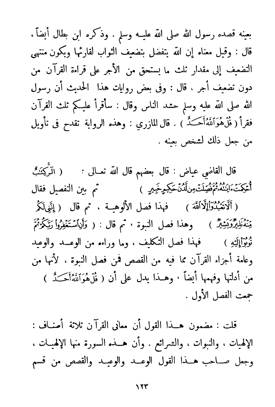 بِعَيْنِهِ قَصَدَهُ رَسُولُ اللَّهِ صَلَّى اللَّهُ عَلَيْهِ وَسَلَّمَ. وَذَكَرَهُ ابْنُ بَطَّالٍ أَيْضًا قَالَ: وَقِيلَ مَعْنَاهُ إنَّ اللَّهَ يَتَفَضَّلُ بِتَضْعِيفِ الثَّوَابِ لِقَارِئِهَا وَيَكُونُ مُنْتَهَى التَّضْعِيفِ إلَى مِقْدَارِ ثُلُثِ مَا يَسْتَحِقُّ مِنْ الْأَجْرِ عَلَى قِرَاءَةِ الْقُرْآنِ مِنْ دُونِ تَضْعِيفِ أَجْرٍ قَالَ: وَفِي بَعْضِ رِوَايَاتِ هَذَا الْحَدِيثِ {أَنَّ رَسُولَ اللَّهِ صَلَّى اللَّهُ عَلَيْهِ وَسَلَّمَ حَشَدَ النَّاسَ وَقَالَ: سَأَقْرَأُ عَلَيْكُمْ ثُلُثَ الْقُرْآنِ فَقَرَأَ {قُلْ هُوَ اللَّهُ أَحَدٌ} } . قَالَ المازري: وَهَذِهِ الرِّوَايَةُ تَقْدَحُ فِي تَأْوِيلِ مَنْ جَعَلَ ذَلِكَ لِشَخْصِ بِعَيْنِهِ. قَالَ الْقَاضِي عِيَاضٌ: قَالَ بَعْضُهُمْ قَالَ اللَّهُ تَعَالَى {الر} {كِتَابٌ أُحْكِمَتْ آيَاتُهُ ثُمَّ فُصِّلَتْ مِنْ لَدُنْ حَكِيمٍ خَبِيرٍ} ثُمَّ بَيَّنَ التَّفْصِيلَ فَقَالَ {أَلَّا تَعْبُدُوا إلَّا اللَّهَ} فَهَذَا فَصْلُ الْأُلُوهِيَّةِ ثُمَّ قَالَ {إنَّنِي لَكُمْ مِنْهُ نَذِيرٌ وَبَشِيرٌ} وَهَذَا فَصْلُ النُّبُوَّةِ ثُمَّ قَالَ: {وَأَنِ اسْتَغْفِرُوا رَبَّكُمْ ثُمَّ تُوبُوا إلَيْهِ} فَهَذَا فَصْلُ التَّكْلِيفِ وَمَا وَرَاءَهُ مِنْ الْوَعْدِ وَالْوَعِيدِ وَعَامَّةِ أَجْزَاءِ الْقُرْآنِ مِمَّا فِيهِ مِنْ الْقَصَصِ فَمَنْ فَصَلَ النُّبُوَّةَ لِأَنَّهَا مِنْ أَدِلَّتِهَا وَفَهْمِهَا أَيْضًا وَهَذَا يَدُلُّ عَلَى أَنَّ {قُلْ هُوَ اللَّهُ أَحَدٌ} جَمَعَتْ الْفَصْلَ الْأَوَّلَ. قُلْت: مَضْمُونُ هَذَا الْقَوْلِ أَنَّ مَعَانِيَ الْقُرْآنِ ثَلَاثَةُ أَصْنَافٍ: الْإِلَهِيَّاتُ وَالنُّبُوَّاتُ وَالشَّرَائِعُ. وَأَنَّ هَذِهِ السُّورَةَ مِنْهَا الْإِلَهِيَّاتُ وَجَعَلَ صَاحِبُ هَذَا الْقَوْلِ الْوَعْدَ وَالْوَعِيدَ وَالْقَصَصَ مِنْ قِسْمِ