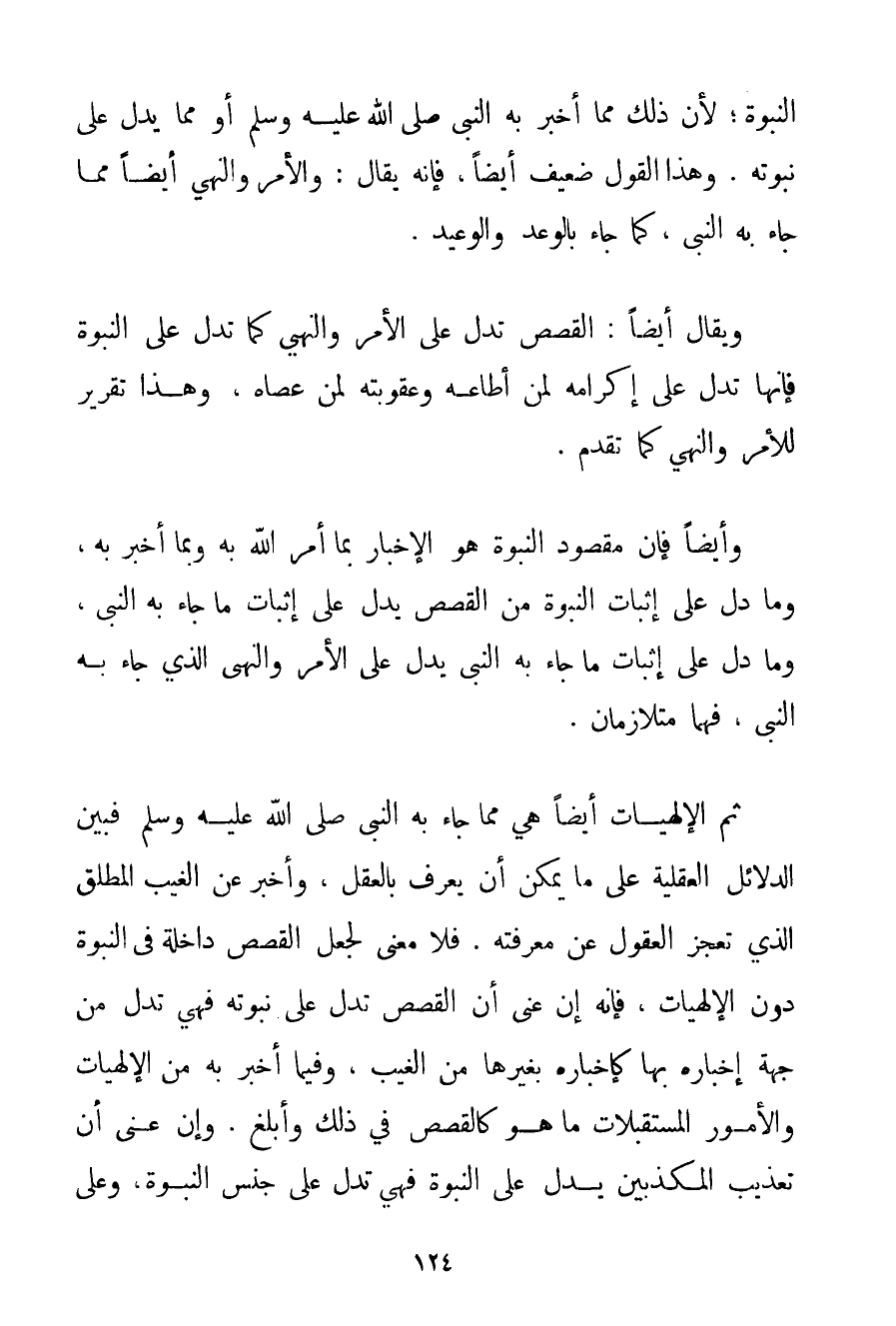 النُّبُوَّةِ؛ لِأَنَّ ذَلِكَ مِمَّا أَخْبَرَ بِهِ النَّبِيُّ صَلَّى اللَّهُ عَلَيْهِ وَسَلَّمَ أَوْ مِمَّا يَدُلُّ عَلَى نُبُوَّتِهِ. وَهَذَا الْقَوْلُ ضَعِيفٌ أَيْضًا فَإِنَّهُ يُقَالُ: وَالْأَمْرُ وَالنَّهْيُ أَيْضًا مِمَّا جَاءَ بِهِ النَّبِيُّ كَمَا جَاءَ بِالْوَعْدِ وَالْوَعِيدِ. وَيُقَالُ أَيْضًا: الْقَصَصُ تَدُلُّ عَلَى الْأَمْرِ وَالنَّهْيِ كَمَا تَدُلُّ عَلَى النُّبُوَّةِ فَإِنَّهَا تَدُلُّ عَلَى إكْرَامِهِ لِمَنْ أَطَاعَهُ وَعُقُوبَتِهِ لِمَنْ عَصَاهُ وَهَذَا تَقْرِيرٌ لِلْأَمْرِ وَالنَّهْيِ كَمَا تَقَدَّمَ. وَأَيْضًا فَإِنَّ مَقْصُودَ النُّبُوَّةِ هُوَ الْإِخْبَارُ بِمَا أَمَرَ اللَّهُ بِهِ وَبِمَا أَخْبَرَ بِهِ وَمَا دَلَّ عَلَى إثْبَاتِ النُّبُوَّةِ مِنْ الْقَصَصِ يَدُلُّ عَلَى إثْبَاتِ مَا جَاءَ بِهِ النَّبِيُّ وَمَا دَلَّ عَلَى إثْبَاتِ مَا جَاءَ بِهِ النَّبِيُّ يَدُلُّ عَلَى الْأَمْرِ وَالنَّهْيِ الَّذِي جَاءَ بِهِ النَّبِيُّ فَهُمَا مُتَلَازِمَانِ. ثُمَّ الْإِلَهِيَّاتُ أَيْضًا هِيَ مِمَّا جَاءَ بِهِ النَّبِيُّ صَلَّى اللَّهُ عَلَيْهِ وَسَلَّمَ فَبَيَّنَ الدَّلَائِلَ الْعَقْلِيَّةَ عَلَى مَا يُمْكِنُ أَنْ يُعْرَفَ بِالْعَقْلِ وَأَخْبَرَ عَنْ الْغَيْبِ الْمُطْلَقِ الَّذِي تَعْجِزُ الْعُقُولُ عَنْ مَعْرِفَتِهِ. فَلَا مَعْنَى لِجَعْلِ الْقَصَصِ دَاخِلَةً فِي النُّبُوَّةِ دُونَ الْإِلَهِيَّاتِ فَإِنَّهُ إنْ عَنِيَ أَنَّ الْقَصَصَ تَدُلُّ عَلَى نُبُوَّتِهِ فَهِيَ تَدُلُّ مِنْ جِهَةِ إخْبَارِهِ بِهَا كَإِخْبَارِهِ بِغَيْرِهَا مِنْ الْغَيْبِ وَفِيمَا أَخْبَرَ بِهِ مِنْ الْإِلَهِيَّاتِ وَالْأُمُورِ الْمُسْتَقْبِلَاتِ مَا هُوَ كَالْقَصَصِ فِي ذَلِكَ وَأَبْلَغَ. وَإِنْ عَنِيَ أَنَّ تَعْذِيبَ الْمُكَذِّبِينَ يَدُلُّ عَلَى النُّبُوَّةِ فَهِيَ تَدُلُّ عَلَى جِنْسِ النُّبُوَّةِ وَعَلَى
