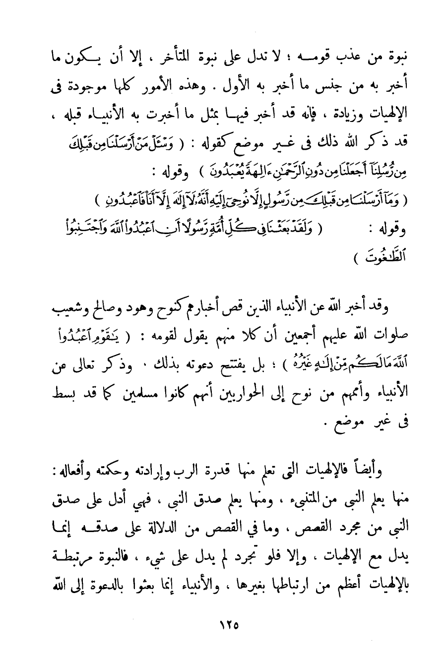 نُبُوَّةِ مَنْ عَذَّبَ قَوْمَهُ؛ لَا تَدُلُّ عَلَى نُبُوَّةِ الْمُتَأَخِّرِ إلَّا أَنْ يَكُونَ مَا أَخْبَرَ بِهِ مِنْ جِنْسِ مَا أَخْبَرَ بِهِ الْأَوَّلُ. وَهَذِهِ الْأُمُورُ كُلُّهَا مَوْجُودَةٌ فِي الْإِلَهِيَّاتِ وَزِيَادَةٌ فَإِنَّهُ قَدْ أَخْبَرَ فِيهَا بِمِثْلِ مَا أَخْبَرَتْ بِهِ الْأَنْبِيَاءُ قَبْلَهُ قَدْ ذَكَرَ اللَّهُ ذَلِكَ فِي غَيْرِ مَوْضِعٍ كَقَوْلِهِ: {وَاسْأَلْ مَنْ أَرْسَلْنَا مِنْ قَبْلِكَ مِنْ رُسُلِنَا أَجَعَلْنَا مِنْ دُونِ الرَّحْمَنِ آلِهَةً يُعْبَدُونَ} وَقَوْلِهِ: {وَمَا أَرْسَلْنَا مِنْ قَبْلِكَ مِنْ رَسُولٍ إلَّا نُوحِي إلَيْهِ أَنَّهُ لَا إلَهَ إلَّا أَنَا فَاعْبُدُونِ} وَقَوْلِهِ: {وَلَقَدْ بَعَثْنَا فِي كُلِّ أُمَّةٍ رَسُولًا أَنِ اُعْبُدُوا اللَّهَ وَاجْتَنِبُوا الطَّاغُوتَ} وَقَدْ أَخْبَرَ اللَّهُ عَنْ الْأَنْبِيَاءِ الَّذِينَ قَصَّ أَخْبَارَهُمْ كَنُوحِ وَهُودٍ وَصَالِحٍ وَشُعَيْبٍ صَلَوَاتُ اللَّهِ عَلَيْهِمْ أَجْمَعِينَ أَنَّ كُلًّا مِنْهُمْ يَقُولُ لِقَوْمِهِ: {يَا قَوْمِ اعْبُدُوا اللَّهَ مَا لَكُمْ مِنْ إلَهٍ غَيْرُهُ} بَلْ يَفْتَتِحُ دَعْوَتَهُ بِذَلِكَ وَذَكَرَ تَعَالَى عَنْ الْأَنْبِيَاءِ وَأُمَمِهِمْ مِنْ نُوحٍ إلَى الْحَوَارِيِّينَ أَنَّهُمْ كَانُوا مُسْلِمِينَ كَمَا قَدْ بُسِطَ فِي غَيْرِ مَوْضِعٍ. وَأَيْضًا فَالْإِلَهِيَّاتُ الَّتِي تُعْلَمُ مِنْهَا قُدْرَةُ الرَّبِّ وَإِرَادَتُهُ وَحِكْمَتُهُ وَأَفْعَالُهُ: مِنْهَا يُعْلَمُ النَّبِيُّ مِنْ الْمُتَنَبِّئِ وَمِنْهَا يُعْلَمُ صِدْقُ النَّبِيِّ فَهِيَ أَدَلُّ عَلَى صِدْقِ النَّبِيِّ مِنْ مُجَرَّدِ الْقَصَصِ وَمَا فِي الْقَصَصِ مِنْ الدَّلَالَةِ عَلَى صِدْقِهِ إنَّمَا يَدُلُّ مَعَ الْإِلَهِيَّاتِ وَإِلَّا فَلَوْ تَجَرَّدَ لَمْ يَدُلَّ عَلَى شَيْءٍ فَالنُّبُوَّةُ مُرْتَبِطَةٌ بِالْإِلَهِيَّاتِ أَعْظَمُ مِنْ ارْتِبَاطِهَا بِغَيْرِهَا وَالْأَنْبِيَاءُ إنَّمَا بُعِثُوا بِالدَّعْوَةِ إلَى اللَّهِ