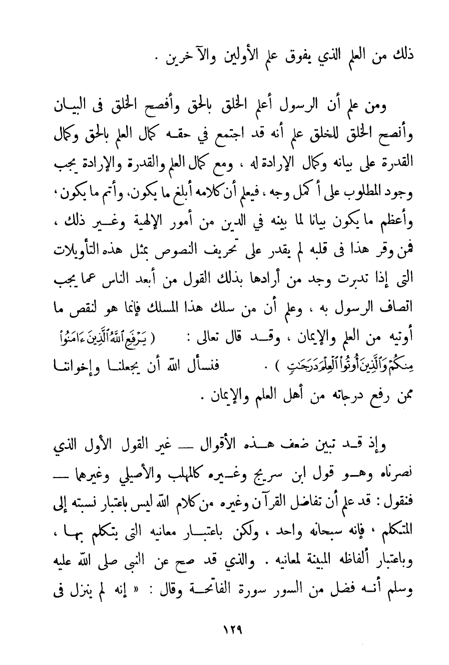 ذَلِكَ مِنْ الْعِلْمِ الَّذِي يَفُوقُ عِلْمَ الْأَوَّلِينَ والآخرين. وَمَنْ عَلِمَ أَنَّ الرَّسُولَ أَعْلَمُ الْخَلْقِ بِالْحَقِّ وَأَفْصَحُ الْخَلْقِ فِي الْبَيَانِ وَأَنْصَحُ الْخَلْقِ لِلْخَلْقِ عَلِمَ أَنَّهُ قَدْ اجْتَمَعَ فِي حَقِّهِ كَمَالُ الْعِلْمِ بِالْحَقِّ وَكَمَالُ الْقُدْرَةِ عَلَى بَيَانِهِ وَكَمَالُ الْإِرَادَةِ لَهُ وَمَعَ كَمَالِ الْعِلْمِ وَالْقُدْرَةِ وَالْإِرَادَةِ يَجِبُ وُجُودُ الْمَطْلُوبِ عَلَى أَكْمَلِ وَجْهٍ فَيُعْلَمُ أَنَّ كَلَامَهُ أَبْلَغُ مَا يَكُونُ وَأَتَمُّ مَا يَكُونُ وَأَعْظَمُ مَا يَكُونُ بَيَانًا لِمَا بَيَّنَهُ فِي الدِّينِ مِنْ أُمُورِ الْإِلَهِيَّةِ وَغَيْرِ ذَلِكَ فَمَنْ وَقَّرَ هَذَا فِي قَلْبِهِ لَمْ يَقْدِرْ عَلَى تَحْرِيفِ النُّصُوصِ بِمِثْلِ هَذِهِ التَّأْوِيلَاتِ الَّتِي إذَا تُدُبِّرَتْ وَجَدَ مَنْ أَرَادَهَا بِذَلِكَ الْقَوْلَ مِنْ أَبْعَدِ النَّاسِ عَمَّا يَجِبُ اتِّصَافُ الرَّسُولِ بِهِ وَعَلِمَ أَنَّ مَنْ سَلَكَ هَذَا الْمَسْلَكَ فَإِنَّمَا هُوَ لِنَقْصِ مَا أُوتِيَهُ مِنْ الْعِلْمِ وَالْإِيمَانِ وَقَدْ قَالَ تَعَالَى: {يَرْفَعِ اللَّهُ الَّذِينَ آمَنُوا مِنْكُمْ وَالَّذِينَ أُوتُوا الْعِلْمَ دَرَجَاتٍ} . فَنَسْأَلُ اللَّهَ أَنْ يَجْعَلَنَا وَإِخْوَانَنَا مِمَّنْ رَفَعَ دَرَجَاتِهِ مِنْ أَهْلِ الْعِلْمِ وَالْإِيمَانِ. وَإِذْ قَدْ تَبَيَّنَ ضَعْفُ هَذِهِ الْأَقْوَالِ - غَيْرَ الْقَوْلِ الْأَوَّلِ الَّذِي نَصَرْنَاهُ وَهُوَ قَوْلُ ابْنِ سُرَيْجٍ وَغَيْرِهِ كَالْمُهَلَّبِ وَالْأَصِيلِيَّ وَغَيْرِهِمَا - فَنَقُولُ: قَدْ عُلِمَ أَنَّ تَفَاضُلَ الْقُرْآنِ وَغَيْرِهِ مِنْ كَلَامِ اللَّهِ لَيْسَ بِاعْتِبَارِ نِسْبَتِهِ إلَى الْمُتَكَلِّمِ فَإِنَّهُ سُبْحَانَهُ وَاحِدٌ وَلَكِنْ بِاعْتِبَارِ مَعَانِيهِ الَّتِي يَتَكَلَّمُ بِهَا وَبِاعْتِبَارِ أَلْفَاظِهِ الْمُبَيِّنَةِ لِمَعَانِيهِ. وَاَلَّذِي قَدْ صَحَّ عَنْ النَّبِيِّ صَلَّى اللَّهُ عَلَيْهِ وَسَلَّمَ أَنَّهُ فَضَّلَ مِنْ السُّوَرِ سُورَةَ الْفَاتِحَةِ وَقَالَ: {إنَّهُ لَمْ يَنْزِلْ فِي