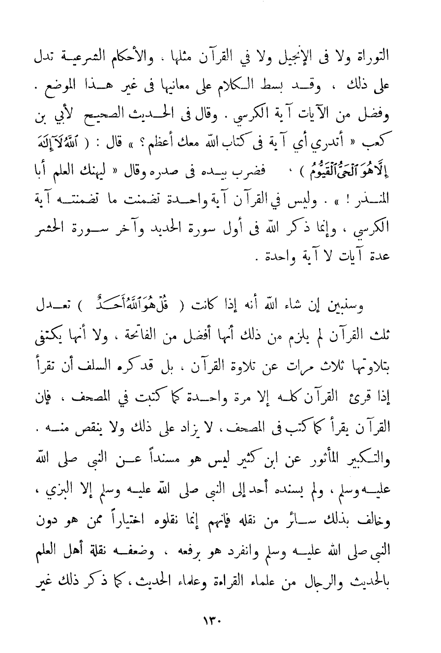 وَسَنُبَيِّنُ إنْ شَاءَ اللَّهُ أَنَّهُ إذَا كَانَتْ {قُلْ هُوَ اللَّهُ أَحَدٌ} تَعْدِلُ ثُلُثَ الْقُرْآنِ لَمْ يَلْزَمْ مِنْ ذَلِكَ أَنَّهَا أَفْضَلُ مِنْ الْفَاتِحَةِ وَلَا أَنَّهَا يَكْتَفِي بِتِلَاوَتِهَا ثَلَاثَ مَرَّاتٍ عَنْ تِلَاوَةِ الْقُرْآنِ بَلْ قَدْ كَرِهَ السَّلَفُ أَنْ تُقْرَأَ إذَا قُرِئَ الْقُرْآنُ كُلُّهُ إلَّا مَرَّةً وَاحِدَةً كَمَا كُتِبَتْ فِي الْمُصْحَفِ فَإِنَّ الْقُرْآنَ يُقْرَأُ كَمَا كُتِبَ فِي الْمُصْحَفِ لَا يُزَادُ عَلَى ذَلِكَ وَلَا يُنْقَصُ مِنْهُ وَالتَّكْبِيرُ الْمَأْثُورُ عَنْ ابْنِ كَثِيرٍ لَيْسَ هُوَ مُسْنَدًا عَنْ النَّبِيِّ صَلَّى اللَّهُ عَلَيْهِ وَسَلَّمَ وَلَمْ يُسْنِدْهُ أَحَدٌ إلَى النَّبِيِّ صَلَّى اللَّهُ عَلَيْهِ وَسَلَّمَ إلَّا البزي وَخَالَفَ بِذَلِكَ سَائِرَ مَنْ نَقَلَهُ فَإِنَّهُمْ إنَّمَا نَقَلُوهُ اخْتِيَارًا مِمَّنْ هُوَ دُونَ النَّبِيِّ صَلَّى اللَّهُ عَلَيْهِ وَسَلَّمَ وَانْفَرَدَ هُوَ بِرَفْعِهِ وَضَعْفِهِ نَقَلَهُ أَهْلُ الْعِلْمِ بِالْحَدِيثِ وَالرِّجَالِ مِنْ عُلَمَاءِ الْقِرَاءَةِ وَعُلَمَاءِ الْحَدِيثِ كَمَا ذَكَرَ ذَلِكَ غَيْرُ