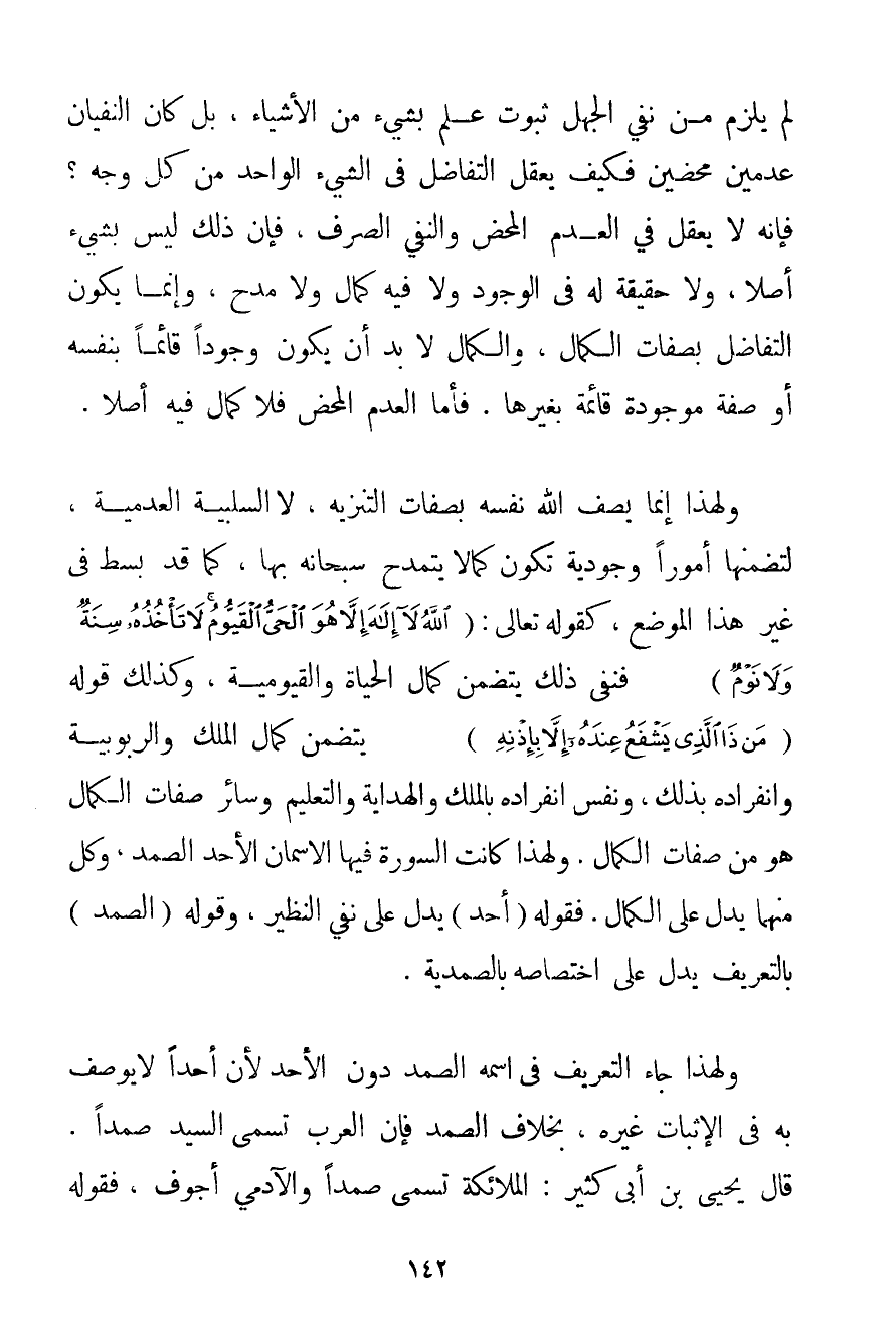 يَلْزَمْ مِنْ نَفْيِ الْجَهْلِ ثُبُوتٌ عُلِمَ بِشَيْءِ مِنْ الْأَشْيَاءِ بَلْ كَانَ النفيان عدمين مَحْضَيْنِ فَكَيْفَ يُعْقَلُ التَّفَاضُلُ فِي الشَّيْءِ الْوَاحِدِ مِنْ كُلِّ وَجْهٍ؟ فَإِنَّهُ لَا يُعْقَلُ فِي الْعَدَمِ الْمَحْضِ وَالنَّفْيِ الصِّرْفِ فَإِنَّ ذَلِكَ لَيْسَ بِشَيْءِ أَصْلًا وَلَا حَقِيقَةَ لَهُ فِي الْوُجُودِ وَلَا فِيهِ كَمَالٌ وَلَا مَدْحٌ وَإِنَّمَا يَكُونُ التَّفَاضُلُ بِصِفَاتِ الْكَمَالِ وَالْكَمَالُ لَا بُدَّ أَنْ يَكُونَ وُجُودًا قَائِمًا بِنَفْسِهِ أَوْ صِفَةٍ مَوْجُودَةٍ قَائِمَةٍ بِغَيْرِهَا. فَأَمَّا الْعَدَمُ الْمَحْضُ فَلَا كَمَالَ فِيهِ أَصْلًا. وَلِهَذَا إنَّمَا يَصِفُ اللَّهُ نَفْسَهُ بِصِفَاتِ التَّنْزِيهِ لَا السَّلْبِيَّةِ الْعَدَمِيَّةِ لِتَضَمُّنِهَا أُمُورًا وُجُودِيَّةً تَكُونُ كَمَا لَا يَتَمَدَّحُ سُبْحَانَهُ بِهَا كَمَا قَدْ بُسِطَ فِي غَيْرِ هَذَا الْمَوْضِعِ كَقَوْلِهِ تَعَالَى: {اللَّهُ لَا إلَهَ إلَّا هُوَ الْحَيُّ الْقَيُّومُ لَا تَأْخُذُهُ سِنَةٌ وَلَا نَوْمٌ} فَنَفْيُ ذَلِكَ يَتَضَمَّنُ كَمَالَ الْحَيَاةِ والقيومية وَكَذَلِكَ قَوْلُهُ {مَنْ ذَا الَّذِي يَشْفَعُ عِنْدَهُ إلَّا بِإِذْنِهِ} يَتَضَمَّنُ كَمَالَ الْمُلْكِ وَالرُّبُوبِيَّةَ وَانْفِرَادَهُ بِذَلِكَ وَنَفْسُ انْفِرَادِهِ بِالْمُلْكِ وَالْهِدَايَةِ وَالتَّعْلِيمِ وَسَائِرِ صِفَاتِ الْكَمَالِ هُوَ مِنْ صِفَاتِ الْكَمَالِ وَلِهَذَا كَانَتْ السُّورَةُ فِيهَا الِاسْمَانِ الْأَحَدُ الصَّمَدُ وَكُلٌّ مِنْهُمَا يَدُلُّ عَلَى الْكَمَالِ. فَقَوْلُهُ (أَحَدٌ) يَدُلُّ عَلَى نَفْيِ النَّظِيرِ وَقَوْلُهُ (الصَّمَدُ) بِالتَّعْرِيفِ يَدُلُّ عَلَى اخْتِصَاصِهِ بِالصَّمَدِيَّةِ. وَلِهَذَا جَاءَ التَّعْرِيفُ فِي اسْمِهِ الصَّمَدُ دُونَ الْأَحَدِ لِأَنَّ أَحَدًا لَا يُوصَفُ بِهِ فِي الْإِثْبَاتِ غَيْرَهُ بِخِلَافِ الصَّمَدِ فَإِنَّ الْعَرَبَ تُسَمِّي السَّيِّدَ صَمَدًا. قَالَ يَحْيَى بْنُ أَبِي كَثِيرٍ: الْمَلَائِكَةُ تُسَمَّى صَمَدًا وَالْآدَمِيُّ أَجْوَفُ فَقَوْلُهُ