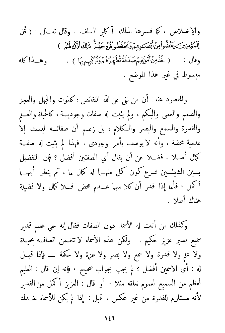 وَالْإِخْلَاصُ كَمَا فَسَّرَهَا بِذَلِكَ أَكَابِرُ السَّلَفِ. وَقَالَ تَعَالَى: {قُلْ لِلْمُؤْمِنِينَ يَغُضُّوا مِنْ أَبْصَارِهِمْ وَيَحْفَظُوا فُرُوجَهُمْ ذَلِكَ أَزْكَى لَهُمْ} وَقَالَ: {خُذْ مِنْ أَمْوَالِهِمْ صَدَقَةً تُطَهِّرُهُمْ وَتُزَكِّيهِمْ بِهَا} . وَهَذَا كُلُّهُ مَبْسُوطٌ فِي غَيْرِ هَذَا الْمَوْضِعِ. وَالْمَقْصُودُ هُنَا: أَنَّ مَنْ نَفَى عَنْ اللَّهِ النَّقَائِصَ؛ كَالْمَوْتِ وَالْجَهْلِ وَالْعَجْزِ وَالصَّمَمِ وَالْعَمَى وَالْبُكْمِ وَلَمْ يُثْبِتْ لَهُ صِفَاتٍ وُجُودِيَّةً؛ كَالْحَيَاةِ وَالْعِلْمِ وَالْقُدْرَةِ وَالسَّمْعِ وَالْبَصَرِ وَالْكَلَامِ؛ بَلْ زَعَمَ أَنَّ صِفَاتِهِ لَيْسَتْ إلَّا عَدَمِيَّةً مَحْضَةً وَأَنَّهُ لَا يُوصَفُ بِأَمْرِ وُجُودِيٍّ فَهَذَا لَمْ يَثْبُتْ لَهُ صِفَةُ كَمَالٍ أَصْلًا فَضْلًا عَنْ أَنْ يُقَالَ أَيُّ الصِّفَتَيْنِ أَفْضَلُ؟ فَإِنَّ التَّفْضِيلَ بَيْنَ الشَّيْئَيْنِ فَرْعُ كَوْنِ كُلٍّ مِنْهُمَا لَهُ كَمَالٌ مَا ثُمَّ يَنْظُرُ أَيُّهُمَا أَكْمَلُ فَأَمَّا إذَا قُدِّرَ أَنَّ كُلًّا مِنْهُمَا عَدَمٌ مَحْضٌ فَلَا كَمَالَ وَلَا فَضِيلَةَ هُنَاكَ أَصْلًا. وَكَذَلِكَ مَنْ أَثْبَتَ لَهُ الْأَسْمَاءَ دُونَ الصِّفَاتِ فَقَالَ إنَّهُ حَيٌّ عَلِيمٌ قَدِيرٌ سَمِيعٌ بَصِيرٌ عَزِيزٌ حَكِيمٌ - وَلَكِنَّ هَذِهِ الْأَسْمَاءَ لَا تَتَضَمَّنُ اتِّصَافَهُ بِحَيَاةِ وَلَا عِلْمٍ وَلَا قُدْرَةٍ وَلَا سَمْعٍ وَلَا بَصَرٍ وَلَا عِزَّةٍ وَلَا حِكْمَةٍ - فَإِذَا قِيلَ لَهُ: أَيُّ الِاسْمَيْنِ أَفْضَلُ؟ لَمْ يُجِبْ بِجَوَابِ صَحِيحٍ فَإِنَّهُ إنْ قَالَ: الْعَلِيمُ أَعْظَمُ مِنْ السَّمِيعِ لِعُمُومِ تَعَلُّقِهِ مَثَلًا أَوْ قَالَ: الْعَزِيزُ أَكْمَلُ مِنْ الْقَدِيرِ لِأَنَّهُ مُسْتَلْزِمٌ لِلْقُدْرَةِ مِنْ غَيْرِ عَكْسٍ قِيلَ إذَا لَمْ يَكُنْ لِلْأَسْمَاءِ عِنْدَك