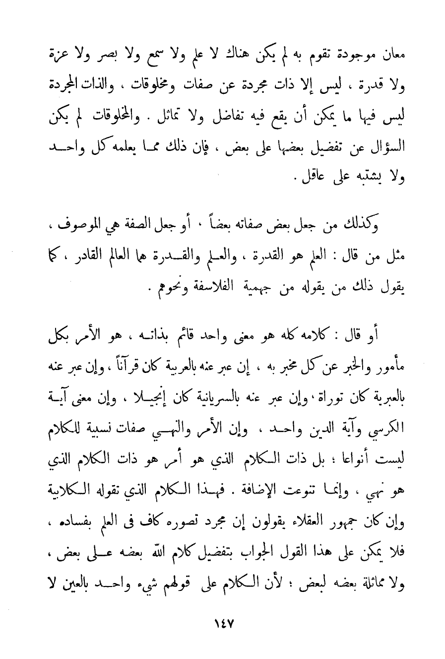 مَعَانٍ مَوْجُودَةٌ تَقُومُ بِهِ لَمْ يَكُنْ هُنَاكَ لَا عِلْمٌ وَلَا سَمْعٌ وَلَا بَصَرٌ وَلَا عِزَّةٌ وَلَا قُدْرَةٌ لَيْسَ إلَّا ذَاتٌ مُجَرَّدَةٌ عَنْ صِفَاتٍ وَمَخْلُوقَاتٍ وَالذَّاتُ الْمُجَرَّدَةُ لَيْسَ فِيهَا مَا يُمْكِنُ أَنْ يَقَعَ فِيهِ تَفَاضُلٌ وَلَا تَمَاثُلٌ. وَالْمَخْلُوقَاتُ لَمْ يَكُنْ السُّؤَالُ عَنْ تَفْضِيلِ بَعْضِهَا عَلَى بَعْضٍ فَإِنَّ ذَلِكَ مِمَّا يَعْلَمُهُ كُلُّ وَاحِدٍ وَلَا يَشْتَبِهُ عَلَى عَاقِلٍ. وَكَذَلِكَ مَنْ جَعَلَ بَعْضَ صِفَاتِهِ بَعْضًا أَوْ جَعَلَ الصِّفَةَ هِيَ الْمَوْصُوفَ مِثْلُ مَنْ قَالَ: الْعِلْمُ هُوَ الْقُدْرَةُ وَالْعِلْمُ وَالْقُدْرَةُ هُمَا الْعَالِمُ الْقَادِرُ كَمَا يَقُولُ ذَلِكَ مَنْ يَقُولُهُ مِنْ جهمية الْفَلَاسِفَةِ وَنَحْوِهِمْ. أَوْ قَالَ: كَلَامُهُ كُلُّهُ هُوَ مَعْنًى وَاحِدٌ قَائِمٌ بِذَاتِهِ هُوَ الْأَمْرُ بِكُلِّ مَأْمُورٍ وَالْخَبَرُ عَنْ كُلِّ مَخْبَرٍ بِهِ إنْ عَبَّرَ عَنْهُ بِالْعَرَبِيَّةِ كَانَ قُرْآنًا وَإِنْ عَبَّرَ عَنْهُ بِالْعِبْرِيَّةِ كَانَ تَوْرَاةً وَإِنْ عَبَّرَ عَنْهُ بالسريانية كَانَ إنْجِيلًا وَإِنَّ مَعْنَى آيَةِ الْكُرْسِيِّ وَآيَةِ الدَّيْنِ وَاحِدٌ وَإِنَّ الْأَمْرَ وَالنَّهْيَ صِفَاتٌ نِسْبِيَّةٌ لِلْكَلَامِ لَيْسَتْ أَنْوَاعًا؛ بَلْ ذَاتُ الْكَلَامِ الَّذِي هُوَ أَمْرٌ هُوَ ذَاتُ الْكَلَامِ الَّذِي هُوَ نَهْيٌ وَإِنَّمَا تَنَوَّعَتْ الْإِضَافَةُ. فَهَذَا الْكَلَامُ الَّذِي تَقُولُهُ الْكُلَّابِيَة وَإِنْ كَانَ جُمْهُورُ الْعُقَلَاءِ يَقُولُونَ إنَّ مُجَرَّدَ تَصَوُّرِهِ كَافٍ فِي الْعِلْمِ بِفَسَادِهِ فَلَا يُمْكِنُ عَلَى هَذَا الْقَوْلِ الْجَوَابُ بِتَفْضِيلِ كَلَامِ اللَّهِ بَعْضَهُ عَلَى بَعْضٍ وَلَا مُمَاثَلَةِ بَعْضَهُ لِبَعْضِ؛ لِأَنَّ الْكَلَامَ عَلَى قَوْلِهِمْ شَيْءٌ وَاحِدٌ بِالْعَيْنِ