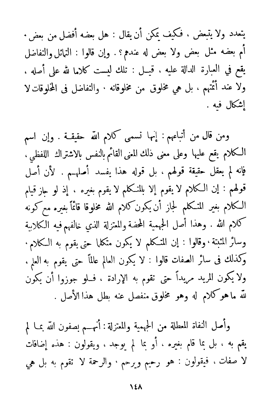 وَهَذَا أَصْلُ الْجَهْمِيَّة الْمَحْضَةِ وَالْمُعْتَزِلَةِ الَّذِي خَالَفَهُمْ فِيهِ الْكُلَّابِيَة وَسَائِرُ الْمُثَبِّتَةِ وَقَالُوا: إنَّ الْمُتَكَلِّمَ لَا يَكُونُ مُتَكَلِّمًا حَتَّى يَقُومَ بِهِ الْكَلَامُ وَكَذَلِكَ فِي سَائِرِ الصِّفَاتِ قَالُوا: لَا يَكُونُ الْعَالِمُ عَالِمًا حَتَّى يَقُومَ بِهِ الْعِلْمُ وَلَا يَكُونُ الْمُرِيدُ مُرِيدًا حَتَّى تَقُومَ بِهِ الْإِرَادَةُ فَلَوْ جَوَّزُوا أَنَّ يَكُونَ لِلَّهِ مَا هُوَ كَلَامٌ لَهُ وَهُوَ مَخْلُوقٌ مُنْفَصِلٌ عَنْهُ بَطَلَ هَذَا الْأَصْلُ.