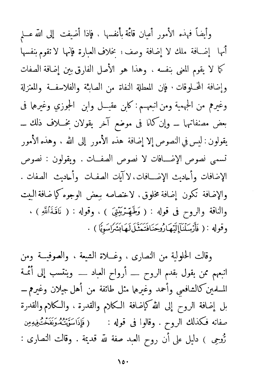 وَأَيْضًا فَهَذِهِ الْأُمُورُ أَعْيَانٌ قَائِمَةٌ بِأَنْفُسِهَا فَإِذَا أُضِيفَتْ إلَى اللَّهِ عُلِمَ أَنَّهَا إضَافَةُ مُلْكٍ لَا إضَافَةُ وَصْفٍ؛ بِخِلَافِ الْعِبَارَةِ فَإِنَّهَا لَا تَقُومُ بِنَفْسِهَا كَمَا لَا يَقُومُ الْمَعْنَى بِنَفْسِهِ وَهَذَا هُوَ الْأَصْلُ الْفَارِقُ بَيْنَ إضَافَةِ الصِّفَاتِ وَإِضَافَةِ الْمَخْلُوقَاتِ فَإِنَّ الْمُعَطِّلَةَ الْنُّفَاةِ مِنْ الصَّابِئَةِ وَالْفَلَاسِفَةِ وَالْمُعْتَزِلَةِ وَغَيْرِهِمْ مِنْ الْجَهْمِيَّة وَمَنْ اتَّبَعَهُمْ: كَابْنِ عَقِيلٍ وَابْنِ الْجَوْزِيِّ وَغَيْرِهِمَا فِي بَعْضِ مُصَنَّفَاتِهِمَا - وَإِنْ كَانَا فِي مَوْضِعٍ آخَرَ يَقُولَانِ بِخِلَافِ ذَلِكَ - يَقُولُونَ: لَيْسَ فِي النُّصُوصِ إلَّا إضَافَةُ هَذِهِ الْأُمُورِ إلَى اللَّهِ وَهَذِهِ الْأُمُورِ تُسَمَّى نُصُوصَ الْإِضَافَاتِ لَا نُصُوصَ الصِّفَاتِ. وَيَقُولُونَ: نُصُوصُ الْإِضَافَاتِ وَأَحَادِيثُ الْإِضَافَاتِ لَا آيَاتُ الصِّفَاتِ وَأَحَادِيثُ الصِّفَاتِ. وَالْإِضَافَةُ تَكُونُ إضَافَةَ مَخْلُوقٍ لِاخْتِصَاصِهِ بِبَعْضِ الْوُجُوهِ كَإِضَافَةِ الْبَيْتِ وَالنَّاقَةِ وَالرُّوحِ فِي قَوْلِهِ: {وَطَهِّرْ بَيْتِيَ} وَقَوْلِهِ: {نَاقَةُ اللَّهِ} وَقَوْلِهِ: {فَأَرْسَلْنَا إلَيْهَا رُوحَنَا فَتَمَثَّلَ لَهَا بَشَرًا سَوِيًّا} . وَقَالَتْ الْحُلُولِيَّةُ مِنْ النَّصَارَى وَغُلَاةُ الشِّيعَةِ وَالصُّوفِيَّةُ وَمَنْ اتَّبَعَهُمْ مِمَّنْ يَقُولُ بِقِدَمِ الرُّوحِ - أَرْوَاحُ الْعِبَادِ - وَيَنْتَسِبُ إلَى أَئِمَّةِ الْمُسْلِمِينَ كَالشَّافِعِيِّ وَأَحْمَد وَغَيْرِهِمَا مِثْلَ طَائِفَةٍ مِنْ أَهْلِ جِيلَانَ وَغَيْرِهِمْ - بَلْ إضَافَةُ الرُّوحِ إلَى اللَّهِ كَإِضَافَةِ الْكَلَامِ وَالْقُدْرَةِ وَالْكَلَامُ وَالْقُدْرَةُ صِفَاتُهُ فَكَذَلِكَ الرُّوحُ. وَقَالُوا فِي قَوْلِهِ: {فَإِذَا سَوَّيْتُهُ وَنَفَخْتُ فِيهِ مِنْ رُوحِي} دَلِيلٌ عَلَى أَنَّ رُوحَ الْعَبْدِ صِفَةٌ لِلَّهِ قَدِيمَةٌ. وَقَالَتْ النَّصَارَى: