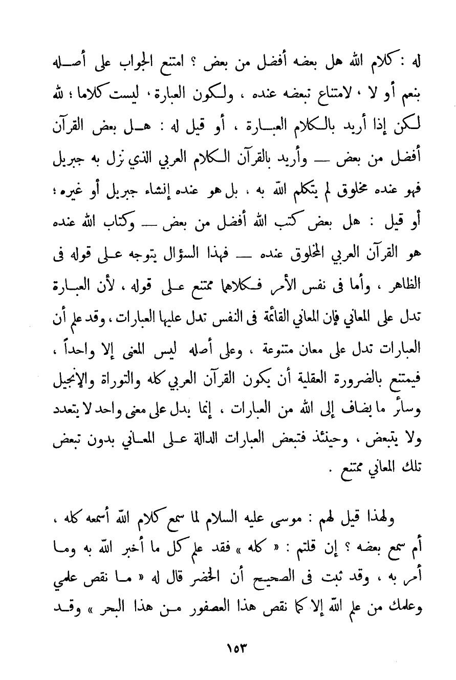 لَهُ: كَلَامُ اللَّهِ هَلْ بَعْضُهُ أَفْضَلُ مِنْ بَعْضٍ؟ امْتَنَعَ الْجَوَابُ عَلَى أَصْلِهِ بِنَعَمْ أَوْ لَا لِامْتِنَاعِ تَبَعُّضِهِ عِنْدَهُ وَلِكَوْنِ الْعِبَارَةِ لَيْسَتْ كَلَامًا؛ لِلَّهِ لَكِنْ إذَا أُرِيدَ بِالْكَلَامِ الْعِبَارَةُ أَوْ قِيلَ لَهُ: هَلْ بَعْضُ الْقُرْآنِ أَفْضَلُ مِنْ بَعْضٍ - وَأُرِيدَ بِالْقُرْآنِ الْكَلَامُ الْعَرَبِيُّ الَّذِي نَزَلَ بِهِ جِبْرِيلُ فَهُوَ عِنْدَهُ مَخْلُوقٌ لَمْ يَتَكَلَّمْ اللَّهُ بِهِ بَلْ هُوَ عِنْدَهُ إنْشَاءٌ جِبْرِيلُ أَوْ غَيْرُهُ؛ أَوْ قِيلَ: هَلْ بَعْضُ كُتُبِ اللَّهِ أَفْضَلُ مِنْ بَعْضٍ - وَكِتَابُ اللَّهِ عِنْدَهُ هُوَ الْقُرْآنُ الْعَرَبِيُّ الْمَخْلُوقُ عِنْدَهُ - فَهَذَا السُّؤَالُ يَتَوَجَّهُ عَلَى قَوْلِهِ فِي الظَّاهِرِ وَأَمَّا فِي نَفْسِ الْأَمْرِ فَكِلَاهُمَا مُمْتَنِعٌ عَلَى قَوْلِهِ لِأَنَّ الْعِبَارَةَ تَدُلُّ عَلَى الْمَعَانِي فَإِنَّ الْمَعَانِيَ الْقَائِمَةَ فِي النَّفْسِ تَدُلُّ عَلَيْهَا الْعِبَارَاتُ وَقَدْ عُلِمَ أَنَّ الْعِبَارَاتِ تَدُلُّ عَلَى مَعَانٍ مُتَنَوِّعَةٍ وَعَلَى أَصْلِهِ لَيْسَ الْمَعْنَى إلَّا وَاحِدًا فَيَمْتَنِعُ بِالضَّرُورَةِ الْعَقْلِيَّةِ أَنْ يَكُونَ الْقُرْآنُ الْعَرَبِيُّ كُلُّهُ وَالتَّوْرَاةُ وَالْإِنْجِيلُ وَسَائِرُ مَا يُضَافُ إلَى اللَّهِ مِنْ الْعِبَارَاتِ إنَّمَا يَدُلُّ عَلَى مَعْنًى وَاحِدٍ لَا يَتَعَدَّدُ وَلَا يَتَبَعَّضُ وَحِينَئِذٍ فَتَبَعُّضُ الْعِبَارَاتِ الدَّالَّةِ عَلَى الْمَعَانِي بِدُونِ تَبَعُّضِ تِلْكَ الْمَعَانِي مُمْتَنِعٌ. وَلِهَذَا قِيلَ لَهُمْ: مُوسَى عَلَيْهِ السَّلَامُ لَمَّا سَمِعَ كَلَامَ اللَّهِ أَسْمَعَهُ كُلَّهُ أَمْ سَمِعَ بَعْضَهُ؟ إنْ قُلْتُمْ: " كُلَّهُ " فَقَدْ عَلِمَ كُلَّ مَا أَخْبَرَ اللَّهُ بِهِ وَمَا أَمَرَ بِهِ وَقَدْ ثَبَتَ فِي الصَّحِيحِ أَنَّ الْخَضِرَ قَالَ لَهُ {مَا نَقَصَ عِلْمِي وَعِلْمُك مِنْ عِلْمِ اللَّهِ إلَّا كَمَا نَقَصَ هَذَا الْعُصْفُورُ مِنْ هَذَا الْبَحْرِ} وَقَدْ
