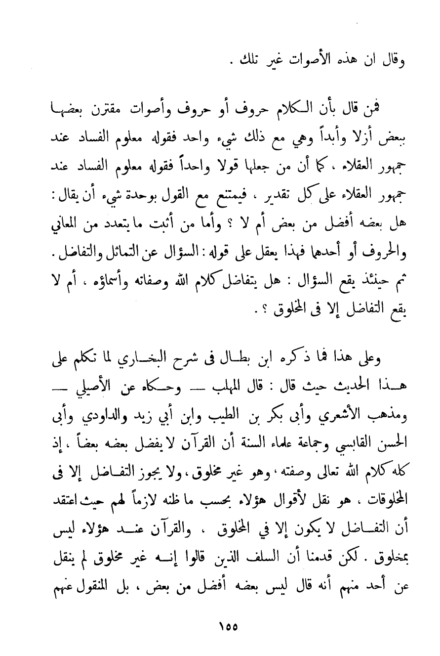 وَقَالَ أَنَّ هَذِهِ الْأَصْوَاتَ غَيْرُ تِلْكَ. فَمَنْ قَالَ بِأَنَّ الْكَلَامَ حُرُوفٌ أَوْ حُرُوفٌ وَأَصْوَاتٌ مُقْتَرِنٌ بَعْضُهَا بِبَعْضِ أَزَلًا وَأَبَدًا وَهِيَ مَعَ ذَلِكَ شَيْءٌ وَاحِدٌ فَقَوْلُهُ مَعْلُومُ الْفَسَادِ عِنْدَ جُمْهُورِ الْعُقَلَاءِ كَمَا أَنَّ مَنْ جَعَلَهَا قَوْلًا وَاحِدًا فَقَوْلُهُ مَعْلُومُ الْفَسَادِ عِنْدَ جُمْهُورِ الْعُقَلَاءِ عَلَى كُلِّ تَقْدِيرٍ فَيَمْتَنِعُ مَعَ الْقَوْلِ بِوَحْدَةِ شَيْءٍ أَنْ يُقَالَ: هَلْ بَعْضُهُ أَفْضَلُ مِنْ بَعْضٍ أَمْ لَا؟ وَأَمَّا مَنْ أَثْبَتَ مَا يَتَعَدَّدُ مِنْ الْمَعَانِي وَالْحُرُوفِ أَوْ أَحَدِهِمَا فَهَذَا يُعْقَلُ عَلَى قَوْلِهِ: السُّؤَالُ عَنْ التَّمَاثُلِ وَالتَّفَاضُلِ. ثُمَّ حِينَئِذٍ يَقَعُ السُّؤَالُ: هَلْ يَتَفَاضَلُ كَلَامُ اللَّهِ وَصِفَاتُهُ وَأَسْمَاؤُهُ أَمْ لَا يَقَعُ التَّفَاضُلُ إلَّا فِي الْمَخْلُوقِ؟ . وَعَلَى هَذَا فَمَا ذَكَرَهُ ابْنُ بَطَّالٍ فِي شَرْحِ الْبُخَارِيِّ لَمَّا تَكَلَّمَ عَلَى هَذَا الْحَدِيثِ حَيْثُ قَالَ: قَالَ الْمُهَلَّبُ - وَحَكَاهُ عَنْ الْأَصِيلِيَّ - وَمَذْهَبِ الْأَشْعَرِيِّ وَأَبِي بَكْرِ بْنِ الطَّيِّبِ وَابْنِ أَبِي زَيْدٍ والدَاوُدي وَأَبِي الْحَسَنِ الْقَابِسِيِّ وَجَمَاعَةِ عُلَمَاءِ السُّنَّةِ أَنَّ الْقُرْآنَ لَا يَفْضُلُ بَعْضُهُ بَعْضًا إذْ كُلُّهُ كَلَامُ اللَّهِ تَعَالَى وَصِفَتُهُ وَهُوَ غَيْرُ مَخْلُوقٍ وَلَا يَجُوزُ التَّفَاضُلُ إلَّا فِي الْمَخْلُوقَاتِ هُوَ نَقْلٌ لِأَقْوَالِ هَؤُلَاءِ بِحَسَبِ مَا ظَنَّهُ لَازِمًا لَهُمْ حَيْثُ اعْتَقَدَ أَنَّ التَّفَاضُلَ لَا يَكُونُ إلَّا فِي الْمَخْلُوقِ وَالْقُرْآنُ عِنْدَ هَؤُلَاءِ لَيْسَ بِمَخْلُوقِ. لَكِنْ قَدَّمْنَا أَنَّ السَّلَفَ الَّذِينَ قَالُوا إنَّهُ غَيْرُ مَخْلُوقٍ لَمْ يُنْقَلْ عَنْ أَحَدٍ مِنْهُمْ أَنَّهُ قَالَ لَيْسَ بَعْضُهُ أَفْضَلَ مِنْ بَعْضٍ بَلْ الْمَنْقُولُ عَنْهُمْ
