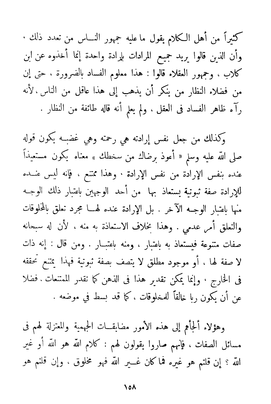 كَثِيرًا مِنْ أَهْلِ الْكَلَامِ يَقُولُ مَا عَلَيْهِ جُمْهُورُ النَّاسِ مِنْ تَعَدُّدِ ذَلِكَ وَأَنَّ الَّذِينَ قَالُوا يُرِيدُ جَمِيعَ الْمُرَادَاتِ بِإِرَادَةِ وَاحِدَةٍ إنَّمَا أَخَذُوهُ عَنْ ابْنِ كُلَّابٍ وَجُمْهُورُ الْعُقَلَاءِ قَالُوا: هَذَا مَعْلُومُ الْفَسَادِ بِالضَّرُورَةِ حَتَّى إنَّ مِنْ فُضَلَاءِ النُّظَّارِ مَنْ يُنْكِرُ أَنْ يَذْهَبَ إلَى هَذَا عَاقِلٌ مِنْ النَّاسِ لِأَنَّهُ رَآهُ ظَاهِرَ الْفَسَادِ فِي الْعَقْلِ وَلَمْ يَعْلَمْ أَنَّهُ قَالَهُ طَائِفَةٌ مِنْ النُّظَّارِ. وَكَذَلِكَ مَنْ جَعَلَ نَفْسَ إرَادَتِهِ هِيَ رَحْمَتَهُ وَهِيَ غَضَبَهُ يَكُونُ قَوْلُهُ صَلَّى اللَّهُ عَلَيْهِ وَسَلَّمَ {أَعُوذُ بِرِضَاك مِنْ سَخَطِك} مَعْنَاهُ يَكُونُ مُسْتَعِيذًا عِنْدَهُ بِنَفْسِ الْإِرَادَةِ مِنْ نَفْسِ الْإِرَادَةِ وَهَذَا مُمْتَنِعٌ فَإِنَّهُ لَيْسَ عِنْدَهُ لِلْإِرَادَةِ صِفَةٌ ثُبُوتِيَّةٌ يُسْتَعَاذُ بِهَا مِنْ أَحَدِ الْوَجْهَيْنِ بِاعْتِبَارِ ذَلِكَ الْوَجْهِ مِنْهَا بِاعْتِبَارِ الْوَجْهِ الْآخَرِ. بَلْ الْإِرَادَةُ عِنْدَهُ لَهَا مُجَرَّدُ تَعَلُّقٍ بِالْمَخْلُوقَاتِ وَالتَّعَلُّقُ أَمْرٌ عَدَمِيٌّ. وَهَذَا بِخِلَافِ الِاسْتِعَاذَةِ بِهِ مِنْهُ لِأَنَّ لَهُ سُبْحَانَهُ صِفَاتٌ مُتَنَوِّعَةٌ فَيُسْتَعَاذُ بِهِ بِاعْتِبَارِ وَمِنْهُ بِاعْتِبَارِ. وَمَنْ قَالَ: إنَّهُ ذَاتٌ لَا صِفَةَ لَهَا أَوْ مَوْجُودٌ مُطْلَقٌ لَا يَتَّصِفُ بِصِفَةِ ثُبُوتِيَّةٍ فَهَذَا يَمْتَنِعُ تَحَقُّقُهُ فِي الْخَارِجِ وَإِنَّمَا يُمْكِنُ تَقْدِيرُ هَذَا فِي الذِّهْنِ كَمَا تُقَدَّرُ الممتنعات فَضْلًا عَنْ أَنْ يَكُونَ رَبًّا خَالِقًا لِلْمَخْلُوقَاتِ كَمَا قَدْ بُسِطَ فِي مَوْضِعِهِ. وَهَؤُلَاءِ أَلْجَأَهُمْ إلَى هَذِهِ الْأُمُورِ مُضَايَقَاتُ الْجَهْمِيَّة وَالْمُعْتَزِلَةِ لَهُمْ فِي مَسَائِلِ الصِّفَاتِ فَإِنَّهُمْ صَارُوا يَقُولُونَ لَهُمْ: كَلَامُ اللَّهِ هُوَ اللَّهُ أَوْ غَيْرُ اللَّهِ؟ إنْ قُلْتُمْ هُوَ غَيْرُهُ فَمَا كَانَ غَيْرُ اللَّهِ فَهُوَ مَخْلُوقٌ وَإِنْ قُلْتُمْ هُوَ
