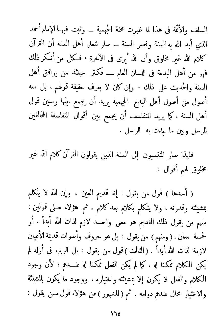 السَّلَفَ وَالْأَئِمَّةَ فِي هَذَا لَمَّا ظَهَرَتْ مِحْنَةُ الْجَهْمِيَّة - وَثَبَتَ فِيهَا الْإِمَامُ أَحْمَد الَّذِي أَيَّدَ اللَّهُ بِهِ السُّنَّةَ وَنَصَرَ السُّنَّةَ - صَارَ شِعَارُ أَهْلِ السُّنَّةِ أَنَّ الْقُرْآنَ كَلَامُ اللَّهِ غَيْرُ مَخْلُوقٍ وَأَنَّ اللَّهَ يُرَى فِي الْآخِرَةِ فَكُلُّ مَنْ أَنْكَرَ ذَلِكَ فَهُوَ مِنْ أَهْلِ الْبِدْعَةِ فِي اللِّسَانِ الْعَامِّ - فَكَثُرَ حِينَئِذٍ مَنْ يُوَافِقُ أَهْلَ السُّنَّةِ وَالْحَدِيثِ عَلَى ذَلِكَ وَإِنْ كَانَ لَا يَعْرِفُ حَقِيقَةَ قَوْلِهِمْ بَلْ مَعَهُ أُصُولٌ مِنْ أُصُولِ أَهْلِ الْبِدَعِ الْجَهْمِيَّة يُرِيدُ أَنْ يَجْمَعَ بَيْنَهَا وَبَيْنَ قَوْلِ أَهْلِ السُّنَّةِ كَمَا يُرِيدُ الْمُتَفَلْسِفُ أَنْ يَجْمَعَ بَيْنَ أَقْوَالِ الْمُتَفَلْسِفَةِ الْمُخَالِفِينَ لِلرُّسُلِ وَبَيْنَ مَا جَاءَتْ بِهِ الرُّسُلُ. فَلِهَذَا صَارَ الْمُنْتَسِبُونَ إلَى السُّنَّةِ الَّذِينَ يَقُولُونَ الْقُرْآنُ كَلَامُ اللَّهِ غَيْرُ مَخْلُوقٍ لَهُ أَقْوَالٌ: