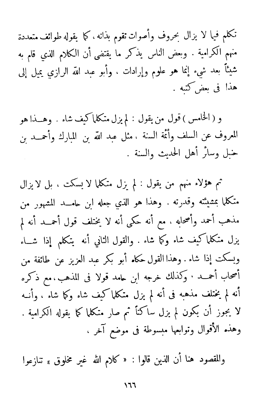وَالْخَامِسُ (1) : قَوْلُ مَنْ يَقُولُ: لَمْ يَزَلْ مُتَكَلِّمًا كَيْفَ شَاءَ. وَهَذَا هُوَ الْمَعْرُوفُ عَنْ السَّلَفِ وَأَئِمَّةِ السُّنَّةِ مِثْلَ عَبْدِ اللَّهِ بْنِ الْمُبَارَكِ وَأَحْمَد بْنِ حَنْبَلٍ وَسَائِرِ أَهْلِ الْحَدِيثِ وَالسُّنَّةِ. ثُمَّ هَؤُلَاءِ مِنْهُمْ مَنْ يَقُولُ: لَمْ يَزَلْ مُتَكَلِّمًا لَا يَسْكُتُ بَلْ لَا يَزَالُ مُتَكَلِّمًا بِمَشِيئَتِهِ وَقُدْرَتِهِ. وَهَذَا هُوَ الَّذِي جَعَلَهُ ابْنُ حَامِدٍ الْمَشْهُورَ مِنْ مَذْهَبِ أَحْمَد وَأَصْحَابِهِ مَعَ أَنَّهُ حُكِيَ أَنَّهُ لَا يَخْتَلِفُ قَوْلُ أَحْمَد أَنَّهُ لَمْ يَزَلْ مُتَكَلِّمًا كَيْفَ شَاءَ وَكَمَا شَاءَ. وَالْقَوْلُ الثَّانِي أَنَّهُ يَتَكَلَّمُ إذَا شَاءَ وَيَسْكُتُ إذَا شَاءَ. وَهَذَا الْقَوْلُ حَكَاهُ أَبُو بَكْرٍ عَبْدُ الْعَزِيزِ عَنْ طَائِفَةٍ مِنْ أَصْحَابِ أَحْمَد وَكَذَلِكَ خَرَّجَهُ ابْنُ حَامِدٍ قَوْلًا فِي الْمَذْهَبِ مَعَ ذِكْرِهِ أَنَّهُ لَمْ يَخْتَلِفْ مَذْهَبُهُ فِي أَنَّهُ لَمْ يَزَلْ مُتَكَلِّمًا كَيْفَ شَاءَ وَكَمَا شَاءَ وَأَنَّهُ لَا يَجُوزُ أَنْ يَكُونَ لَمْ يَزَلْ سَاكِتًا ثُمَّ صَارَ مُتَكَلِّمًا كَمَا يَقُولُهُ الكَرَّامِيَة. وَهَذِهِ الْأَقْوَالُ وَتَوَابِعُهَا مَبْسُوطَةٌ فِي مَوْضِعٍ آخَرَ وَالْمَقْصُودُ هُنَا أَنَّ الَّذِينَ قَالُوا: " كَلَامُ اللَّهِ غَيْرُ مَخْلُوقٍ " تَنَازَعُوا