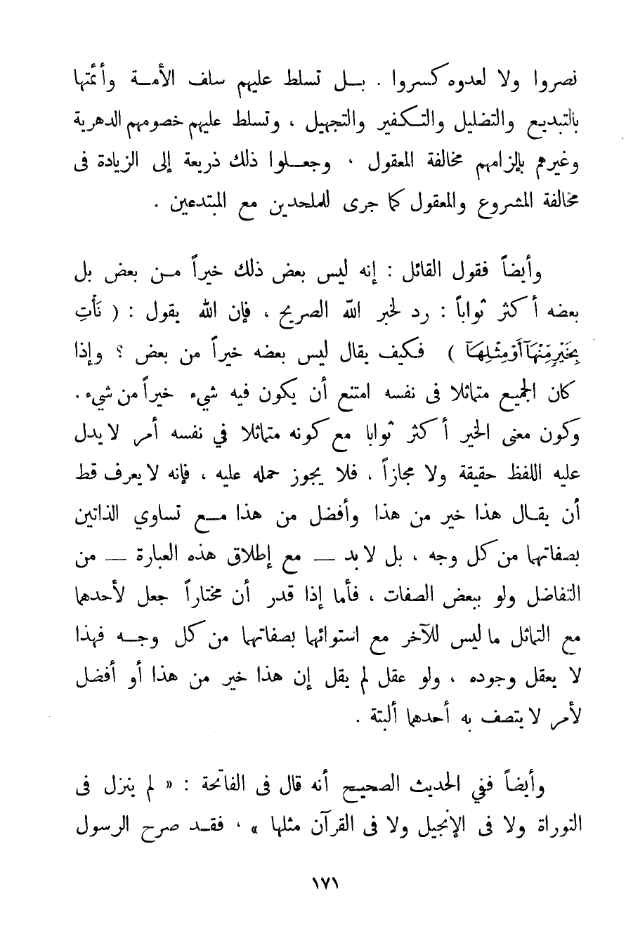 نَصَرُوا وَلَا لِعَدُوِّهِ كَسَرُوا بَلْ تَسَلَّطَ عَلَيْهِمْ سَلَفُ الْأُمَّةِ وَأَئِمَّتُهَا بِالتَّبْدِيعِ وَالتَّضْلِيلِ وَالتَّكْفِيرِ وَالتَّجْهِيلِ وَتَسَلَّطَ عَلَيْهِمْ خُصُومُهُمْ الدَّهْرِيَّةُ وَغَيْرُهُمْ بِإِلْزَامِهِمْ مُخَالَفَةَ الْمَعْقُولِ وَجَعَلُوا ذَلِكَ ذَرِيعَةً إلَى الزِّيَادَةِ فِي مُخَالَفَةِ الْمَشْرُوعِ وَالْمَعْقُولِ كَمَا جَرَى لِلْمُلْحِدِينَ مَعَ الْمُبْتَدِعِينَ. وَأَيْضًا فَقَوْلُ الْقَائِلِ: إنَّهُ لَيْسَ بَعْضُ ذَلِكَ خَيْرًا مِنْ بَعْضٍ بَلْ بَعْضُهُ أَكْثَرُ ثَوَابًا؛ رَدٌّ لِخَبَرِ اللَّهِ الصَّرِيحِ فَإِنَّ اللَّهَ يَقُولُ: {نَأْتِ بِخَيْرٍ مِنْهَا أَوْ مِثْلِهَا} فَكَيْفَ يُقَالُ لَيْسَ بَعْضُهُ خَيْرًا مِنْ بَعْضٍ؟ وَإِذَا كَانَ الْجَمِيعُ مُتَمَاثِلًا فِي نَفْسِهِ امْتَنَعَ أَنْ يَكُونَ فِيهِ شَيْءٌ خَيْرًا مِنْ شَيْءٍ. وَكَوْنُ مَعْنَى الْخَيْرِ أَكْثَرَ ثَوَابًا مَعَ كَوْنِهِ مُتَمَاثِلًا فِي نَفْسِهِ أَمْرٌ لَا يَدُلُّ عَلَيْهِ اللَّفْظُ حَقِيقَةً وَلَا مَجَازًا؛ فَلَا يَجُوزُ حَمْلُهُ عَلَيْهِ فَإِنَّهُ لَا يُعْرَفُ قَطُّ أَنْ يُقَالَ هَذَا خَيْرٌ مِنْ هَذَا وَأَفْضَلُ مِنْ هَذَا مَعَ تَسَاوِي الذَّاتَيْنِ بِصِفَاتِهِمَا مِنْ كُلِّ وَجْهٍ بَلْ لَا بُدَّ - مَعَ إطْلَاقِ هَذِهِ الْعِبَارَةِ - مِنْ التَّفَاضُلِ وَلَوْ بِبَعْضِ الصِّفَاتِ فَأَمَّا إذَا قُدِّرَ أَنَّ مُخْتَارًا جَعَلَ لِأَحَدِهِمَا مَعَ التَّمَاثُلِ مَا لَيْسَ لِلْآخَرِ مَعَ اسْتِوَائِهِمَا بِصِفَاتِهِمَا مِنْ كُلِّ وَجْهٍ فَهَذَا لَا يَعْقِلُ وُجُودَهُ وَلَوْ عَقَلَ لَمْ يَقُلْ إنَّ هَذَا خَيْرٌ مِنْ هَذَا أَوْ أَفْضَلُ لِأَمْرِ لَا يَتَّصِفُ بِهِ أَحَدُهُمَا أَلْبَتَّةَ. وَأَيْضًا فَفِي الْحَدِيثِ الصَّحِيحِ أَنَّهُ قَالَ فِي الْفَاتِحَةِ: {لَمْ يَنْزِلْ فِي التَّوْرَاةِ وَلَا فِي الْإِنْجِيلِ وَلَا فِي الْقُرْآنِ مِثْلُهَا} فَقَدْ صَرَّحَ الرَّسُولُ