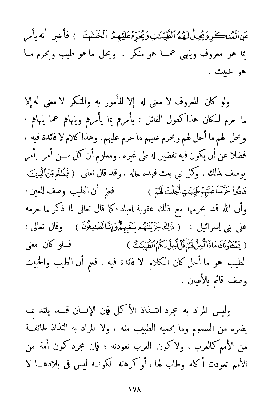 عَنِ الْمُنْكَرِ وَيُحِلُّ لَهُمُ الطَّيِّبَاتِ وَيُحَرِّمُ عَلَيْهِمُ الْخَبَائِثَ} فَأَخْبَرَ أَنَّهُ يَأْمُرُ بِمَا هُوَ مَعْرُوفٌ وَيَنْهَى عَمَّا هُوَ مُنْكَرٌ وَيُحِلُّ مَا هُوَ طَيِّبٌ وَيُحَرِّمُ مَا هُوَ خَبِيثٌ. وَلَوْ كَانَ الْمَعْرُوفُ لَا مَعْنَى لَهُ إلَّا الْمَأْمُورُ بِهِ وَالْمُنْكَرُ لَا مَعْنَى لَهُ إلَّا مَا حُرِّمَ لَكَانَ هَذَا كَقَوْلِ الْقَائِلِ: يَأْمُرُهُمْ بِمَا يَأْمُرُهُمْ وَيَنْهَاهُمْ عَمَّا يَنْهَاهُمْ وَيُحِلُّ لَهُمْ مَا أَحَلَّ لَهُمْ وَيُحَرِّمُ عَلَيْهِمْ مَا حَرَّمَ عَلَيْهِمْ. وَهَذَا كَلَامٌ لَا فَائِدَةَ فِيهِ فَضْلًا عَنْ أَنْ يَكُونَ فِيهِ تَفْضِيلٌ لَهُ عَلَى غَيْرِهِ. وَمَعْلُومٌ أَنَّ كُلَّ مَنْ أَمَرَ بِأَمْرِ يُوصَفُ بِذَلِكَ وَكُلُّ نَبِيٍّ بُعِثَ فَهَذِهِ حَالُهُ. وَقَدْ قَالَ تَعَالَى: {فَبِظُلْمٍ مِنَ الَّذِينَ هَادُوا حَرَّمْنَا عَلَيْهِمْ طَيِّبَاتٍ أُحِلَّتْ لَهُمْ} فَعُلِمَ أَنَّ الطَّيِّبَ وَصْفٌ لِلْعَيْنِ وَأَنَّ اللَّهَ قَدْ يُحَرِّمُهَا مَعَ ذَلِكَ عُقُوبَةً لِلْعِبَادِ كَمَا قَالَ تَعَالَى لَمَّا ذَكَرَ مَا حَرَّمَهُ عَلَى بَنِي إسْرَائِيلَ: {ذَلِكَ جَزَيْنَاهُمْ بِبَغْيِهِمْ وَإِنَّا لَصَادِقُونَ} وَقَالَ تَعَالَى: {يَسْأَلُونَكَ مَاذَا أُحِلَّ لَهُمْ قُلْ أُحِلَّ لَكُمُ الطَّيِّبَاتُ} فَلَوْ كَانَ مَعْنَى الطَّيِّبِ هُوَ مَا أُحِلَّ كَانَ الْكَلَامُ لَا فَائِدَةَ فِيهِ. فَعُلِمَ أَنَّ الطَّيِّبَ وَالْخَبِيثَ وَصْفٌ قَائِمٌ بِالْأَعْيَانِ. وَلَيْسَ الْمُرَادُ بِهِ مُجَرَّدَ الْتِذَاذِ الْأَكْلِ فَإِنَّ الْإِنْسَانَ قَدْ يَلْتَذُّ بِمَا يَضُرُّهُ مِنْ السُّمُومِ وَمَا يَحْمِيهِ الطَّبِيبُ مِنْهُ وَلَا الْمُرَادُ بِهِ الْتِذَاذَ طَائِفَةٍ مِنْ الْأُمَمِ كَالْعَرَبِ وَلَا كَوْنُ الْعَرَبِ تَعَوَّدَتْهُ؛ فَإِنَّ مُجَرَّدَ كَوْنِ أُمَّةٍ مِنْ الْأُمَمِ تَعَوَّدَتْ أَكْلَهُ وَطَابَ لَهَا أَوْ كَرِهَتْهُ لِكَوْنِهِ لَيْسَ فِي بِلَادِهَا