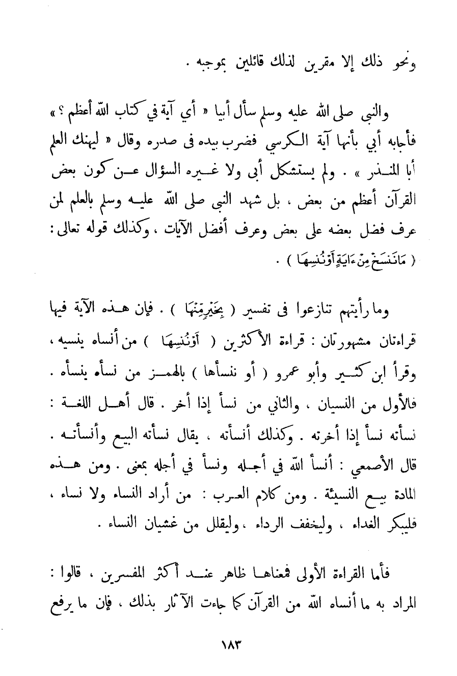 وَنَحْوِ ذَلِكَ إلَّا مُقِرِّينَ لِذَلِكَ قَائِلِينَ بِمُوجِبِهِ. {وَالنَّبِيُّ صَلَّى اللَّهُ عَلَيْهِ وَسَلَّمَ سَأَلَ أبيا أَيُّ آيَةٍ فِي كِتَابِ اللَّهِ أَعْظَمُ؟} فَأَجَابَهُ أبي بِأَنَّهَا آيَةُ الْكُرْسِيِّ فَضَرَبَ بِيَدِهِ فِي صَدْرِهِ وَقَالَ {ليهنك الْعِلْمُ أَبَا الْمُنْذِرِ} . وَلَمْ يَسْتَشْكِلْ أبي وَلَا غَيْرُهُ السُّؤَالَ عَنْ كَوْنِ بَعْضِ الْقُرْآنِ أَعْظَمَ مِنْ بَعْضٍ بَلْ شَهِدَ النَّبِيُّ صَلَّى اللَّهُ عَلَيْهِ وَسَلَّمَ بِالْعِلْمِ لِمَنْ عَرَفَ فَضْلَ بَعْضِهِ عَلَى بَعْضٍ وَعَرَفَ أَفْضَلَ الْآيَاتِ وَكَذَلِكَ قَوْلُهُ تَعَالَى: {مَا نَنْسَخْ مِنْ آيَةٍ أَوْ نُنْسِهَا} . وَمَا رَأَيْتهمْ تَنَازَعُوا فِي تَفْسِيرِ ( {بِخَيْرٍ مِنْهَا} . فَإِنَّ هَذِهِ الْآيَةَ فِيهَا قِرَاءَتَانِ مَشْهُورَتَانِ: قِرَاءَةُ الْأَكْثَرِينَ ( {أَوْ نُنْسِهَا} مَنْ أَنْسَاهُ يُنْسِيهِ وَقَرَأَ ابْنُ كَثِيرٍ وَأَبُو عَمْرٍو (أَوْ نَنْسَأهَا بِالْهَمْزِ مِنْ نَسَأَهُ يَنْسَأهُ. فَالْأَوَّلُ مِنْ النِّسْيَانِ وَالثَّانِي مِنْ نَسَأَ إذَا أَخَّرَ. قَالَ أَهْلُ اللُّغَةِ: نَسَأْته نَسْئًا إذَا أَخَّرْته. وَكَذَلِكَ أَنْسَأْته يُقَالُ نَسَأْته الْبَيْعَ وَأَنْسَأْته. قَالَ الْأَصْمَعِيُّ: أَنْسَأَ اللَّهُ فِي أَجَلِهِ وَنَسَأَ فِي أَجَلِهِ بِمَعْنَى. وَمِنْ هَذِهِ الْمَادَّةِ بَيْعُ النَّسِيئَةِ. وَمِنْ كَلَامِ الْعَرَبِ: مَنْ أَرَادَ النَّسَاءَ وَلَا نَسَاءً فَلْيُبَكِّرْ الْغَدَاءَ وَلْيُخَفِّفْ الرِّدَاءَ وَلْيُقَلِّلْ مِنْ غَشَيَانِ النَّسَاءِ. فَأَمَّا الْقِرَاءَةُ الْأُولَى فَمَعْنَاهَا ظَاهِرٌ عِنْدَ أَكْثَرِ الْمُفَسِّرِينَ قَالُوا: الْمُرَادُ بِهِ مَا أَنْسَاهُ اللَّهُ مِنْ الْقُرْآنِ كَمَا جَاءَتْ الْآثَارُ بِذَلِكَ فَإِنَّ مَا يَرْفَعُ