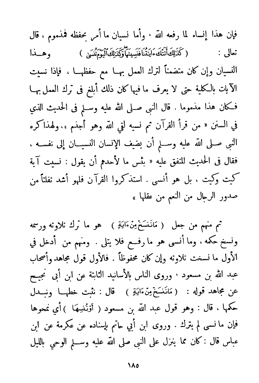 فَإِنَّ هَذَا إنْسَاءٌ لِمَا رَفَعَهُ اللَّهُ وَأَمَّا نِسْيَانُ مَا أَمَرَ بِحِفْظِهِ فَمَذْمُومٌ قَالَ تَعَالَى: {كَذَلِكَ أَتَتْكَ آيَاتُنَا فَنَسِيتَهَا وَكَذَلِكَ الْيَوْمَ تُنْسَى} وَهَذَا النِّسْيَانُ وَإِنْ كَانَ مُتَضَمِّنًا لِتَرْكِ الْعَمَلِ بِهَا مَعَ حِفْظِهَا فَإِذَا نُسِيَتْ الْآيَاتُ بِالْكُلِّيَّةِ حَتَّى لَا يُعْرَفُ مَا فِيهَا كَانَ ذَلِكَ أَبْلَغَ فِي تَرْكِ الْعَمَلِ بِهَا فَكَانَ هَذَا مَذْمُومًا. قَالَ النَّبِيُّ صَلَّى اللَّهُ عَلَيْهِ وَسَلَّمَ فِي الْحَدِيثِ الَّذِي فِي السُّنَنِ {مَنْ قَرَأَ الْقُرْآنَ ثُمَّ نَسِيَهُ لَقِيَ اللَّهَ وَهُوَ أَجْذَمُ} وَلِهَذَا كَرِهَ النَّبِيُّ صَلَّى اللَّهُ عَلَيْهِ وَسَلَّمَ أَنْ يُضِيفَ الْإِنْسَانُ النِّسْيَانَ إلَى نَفْسِهِ فَقَالَ فِي الْحَدِيثِ الْمُتَّفَقِ عَلَيْهِ {بِئْسَ مَا لِأَحَدِهِمْ أَنْ يَقُولَ: نَسِيت آيَةَ كَيْت وَكَيْت بَلْ هُوَ أَنْسَى. اسْتَذْكِرُوا الْقُرْآنَ فَلَهُوَ أَشَدُّ تَفَلُّتًا مِنْ صُدُورِ الرِّجَالِ مِنْ النَّعَمِ مِنْ عُقُلِهَا} ثُمَّ مِنْهُمْ مَنْ جَعَلَ {مَا نَنْسَخْ مِنْ آيَةٍ} هُوَ مَا تَرَكَ تِلَاوَتَهُ وَرَسْمَهُ وَنَسْخَ حُكْمِهِ وَمَا أَنْسَى هُوَ مَا رَفَعَ فَلَا يُتْلَى. وَمِنْهُمْ مَنْ أَدْخَلَ فِي الْأَوَّلِ مَا نُسِخَتْ تِلَاوَتُهُ وَإِنْ كَانَ مَحْفُوظًا. فَالْأَوَّلُ قَوْلُ مُجَاهِدٍ وَأَصْحَابِ عَبْدِ اللَّهِ بْنِ مَسْعُودٍ وَرَوَى النَّاسُ بِالْأَسَانِيدِ الثَّابِتَةِ عَنْ ابْنِ أَبِي نَجِيحٍ عَنْ مُجَاهِدٍ قَوْلَهُ: {مَا نَنْسَخْ مِنْ آيَةٍ} قَالَ: نُثْبِتُ خَطَّهَا وَنُبَدِّلُ حُكْمَهَا قَالَ: وَهُوَ قَوْلُ عَبْدِ اللَّهِ بْنِ مَسْعُودٍ {أَوْ نُنْسِهَا} أَيْ نَمْحُوهَا فَإِنَّ مَا نُسِيَ لَمْ يُتْرَكْ. وَرَوَى ابْنُ أَبِي حَاتِمٍ بِإِسْنَادِهِ عَنْ عِكْرِمَةَ {عَنْ ابْنِ عَبَّاسٍ قَالَ: كَانَ مِمَّا يَنْزِلُ عَلَى النَّبِيِّ صَلَّى اللَّهُ عَلَيْهِ وَسَلَّمَ الْوَحْيُ بِاللَّيْلِ