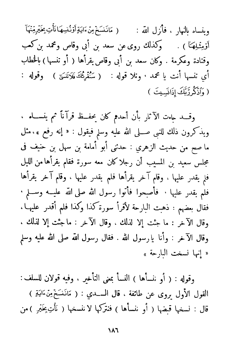 وَيَنْسَاهُ بِالنَّهَارِ فَأَنْزَلَ اللَّهُ: {مَا نَنْسَخْ مِنْ آيَةٍ أَوْ نُنْسِهَا نَأْتِ بِخَيْرٍ مِنْهَا أَوْ مِثْلِهَا} } . وَكَذَلِكَ رُوِيَ عَنْ سَعْدِ بْنِ أَبِي وَقَّاصٍ وَمُحَمَّدِ بْنِ كَعْبٍ وقتادة وَعِكْرِمَةَ. وَكَانَ سَعْدُ بْنُ أَبِي وَقَّاصٍ يَقْرَؤُهَا أَوْ تُنْسِهَا بِالْخِطَابِ أَيْ تُنْسِهَا أَنْتَ يَا مُحَمَّدُ وَتَلَا قَوْلَهُ: سَنُقْرِئُكَ فَلَا تَنْسَى وَقَوْلَهُ: {وَاذْكُرْ رَبَّكَ إذَا نَسِيتَ} وَقَدْ جَاءَتْ الْآثَارُ بِأَنَّ أَحَدَهُمْ {كَانَ يَحْفَظُ قُرْآنًا ثُمَّ يَنْسَاهُ وَيَذْكُرُونَ ذَلِكَ لِلنَّبِيِّ صَلَّى اللَّهُ عَلَيْهِ وَسَلَّمَ فَيَقُولُ: إنَّهُ رُفِعَ} مِثْلَ مَا صَحَّ مِنْ حَدِيثِ الزُّهْرِيّ: حَدَّثَنِي أَبُو أمامة بْنُ سَهْلِ بْنِ حنيف فِي مَجْلِسِ سَعِيدِ بْنِ الْمُسَيِّبِ {أَنَّ رَجُلًا كَانَ مَعَهُ سُورَةٌ فَقَامَ يَقْرَؤُهَا مِنْ اللَّيْلِ فَلَمْ يَقْدِرْ عَلَيْهَا وَقَامَ آخَرُ يَقْرَؤُهَا فَلَمْ يَقْدِرْ عَلَيْهَا وَقَامَ آخَرُ يَقْرَؤُهَا فَلَمْ يَقْدِرْ عَلَيْهَا فَأَصْبَحُوا فَأَتَوْا رَسُولَ اللَّهِ صَلَّى اللَّهُ عَلَيْهِ وَسَلَّمَ فَقَالَ بَعْضُهُمْ: ذَهَبْت الْبَارِحَةَ لِأَقْرَأَ سُورَةَ كَذَا وَكَذَا فَلَمْ أَقْدِرْ عَلَيْهَا وَقَالَ الْآخَرُ: مَا جِئْت إلَّا لِذَلِكَ وَقَالَ الْآخَرُ: مَا جِئْت إلَّا لِذَلِكَ وَقَالَ الْآخَرُ: وَأَنَا يَا رَسُولَ اللَّهِ. فَقَالَ رَسُولُ اللَّهِ صَلَّى اللَّهُ عَلَيْهِ وَسَلَّمَ إنَّهَا نُسِخَتْ الْبَارِحَةَ} وَقَوْلُهُ: أَوْ نَنْسَؤُهَا النَّسْءُ بِمَعْنَى التَّأْخِيرِ وَفِيهِ قَوْلَانِ السَّلَفُ: الْقَوْلُ الْأَوَّلُ يُرْوَى عَنْ طَائِفَةٍ قَالَ السدي: {مَا نَنْسَخْ مِنْ آيَةٍ} قَالَ: نَسْخُهَا قَبْضُهَا أَوْ نَنْسَأهَا فَنَتْرُكُهَا لَا نَنْسَخُهَا {نَأْتِ بِخَيْرٍ} مِنْ