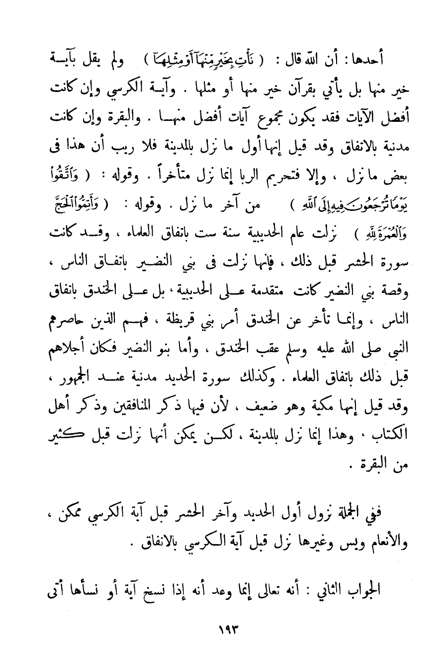 أَحَدُهَا: أَنَّ اللَّهَ قَالَ: {نَأْتِ بِخَيْرٍ مِنْهَا أَوْ مِثْلِهَا} وَلَمْ يَقُلْ بِآيَةِ خَيْرٍ مِنْهَا بَلْ يَأْتِي بِقُرْآنِ خَيْرٍ مِنْهَا أَوْ مِثْلِهَا. وَآيَةُ الْكُرْسِيِّ وَإِنْ كَانَتْ أَفْضَلَ الْآيَاتِ فَقَدْ يَكُونُ مَجْمُوعُ آيَاتٍ أَفْضَلَ مِنْهَا. وَالْبَقَرَةُ وَإِنْ كَانَتْ مَدَنِيَّةً بِالِاتِّفَاقِ وَقَدْ قِيلَ إنَّهَا أَوَّلُ مَا نَزَلَ بِالْمَدِينَةِ فَلَا رَيْب أَنَّ هَذَا فِي بَعْضِ مَا نَزَلَ وَإِلَّا فَتَحْرِيمُ الرِّبَا إنَّمَا نَزَلَ مُتَأَخِّرًا. وَقَوْلُهُ: {وَاتَّقُوا يَوْمًا تُرْجَعُونَ فِيهِ إلَى اللَّهِ} مِنْ آخِرِ مَا نَزَلَ. وَقَوْلُهُ: {وَأَتِمُّوا الْحَجَّ وَالْعُمْرَةَ لِلَّهِ} نَزَلَتْ عَامَ الْحُدَيْبِيَةِ سَنَةَ سِتٍّ بِاتِّفَاقِ الْعُلَمَاءِ وَقَدْ كَانَتْ سُورَةُ الْحَشْرِ قَبْلَ ذَلِكَ فَإِنَّهَا نَزَلَتْ فِي بَنِي النَّضِيرِ بِاتِّفَاقِ النَّاسِ وَقِصَّةُ بَنِي النَّضِيرِ كَانَتْ مُتَقَدِّمَةً عَلَى الْحُدَيْبِيَةِ بَلْ عَلَى الْخَنْدَقِ بِاتِّفَاقِ النَّاسِ وَإِنَّمَا تَأَخَّرَ عَنْ الْخَنْدَقِ أَمْرُ بَنِي قُرَيْظَةَ فَهُمْ الَّذِينَ حَاصَرَهُمْ النَّبِيُّ صَلَّى اللَّهُ عَلَيْهِ وَسَلَّمَ عَقِبَ الْخَنْدَقِ وَأَمَّا بَنُو النَّضِيرِ فَكَانَ أَجْلَاهُمْ قَبْلَ ذَلِكَ بِاتِّفَاقِ الْعُلَمَاءِ. وَكَذَلِكَ سُورَةُ الْحَدِيدِ مَدَنِيَّةٌ عِنْدَ الْجُمْهُورِ وَقَدْ قِيلَ إنَّهَا مَكِّيَّةٌ وَهُوَ ضَعِيفٌ لِأَنَّ فِيهَا ذِكْرُ الْمُنَافِقِينَ وَذِكْرُ أَهْلِ الْكِتَابِ وَهَذَا إنَّمَا نَزَلَ بِالْمَدِينَةِ لَكِنْ يُمْكِنُ أَنَّهَا نَزَلَتْ قَبْلَ كَثِيرٍ مِنْ الْبَقَرَةِ. فَفِي الْجُمْلَةِ نُزُولُ أَوَّلِ الْحَدِيدِ وَآخِرِ الْحَشْرِ قَبْلَ آيَةِ الْكُرْسِيِّ مُمْكِنٌ وَالْأَنْعَامِ وَيس وَغَيْرُهَا نَزَلَ قَبْلَ آيَةِ الْكُرْسِيِّ بِالِاتِّفَاقِ.