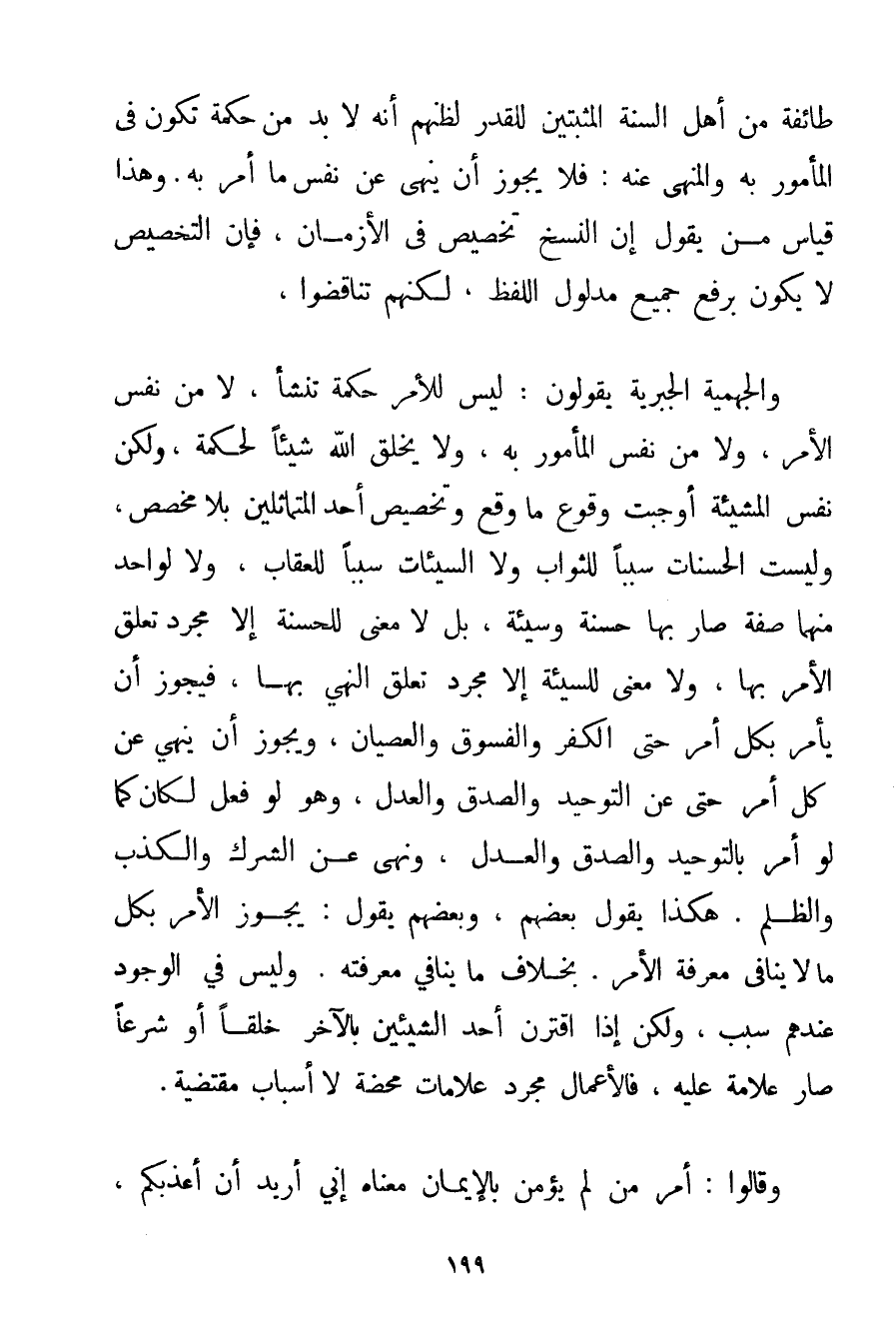 طَائِفَةٌ مِنْ أَهْلِ السُّنَّةِ الْمُثْبِتِينَ لِلْقَدَرِ لِظَنِّهِمْ أَنَّهُ لَا بُدَّ مِنْ حِكْمَةٍ تَكُونُ فِي الْمَأْمُورِ بِهِ وَالْمَنْهِيِّ عَنْهُ: فَلَا يَجُوزُ أَنْ يَنْهَى عَنْ نَفْسِ مَا أَمَرَ بِهِ. وَهَذَا قِيَاسُ مَنْ يَقُولُ إنَّ النَّسْخَ تَخْصِيصٌ فِي الْأَزْمَانِ فَإِنَّ التَّخْصِيصَ لَا يَكُونُ بِرَفْعِ جَمِيعِ مَدْلُولِ اللَّفْظِ لَكِنَّهُمْ تَنَاقَضُوا وَالْجَهْمِيَّة الْجَبْرِيَّةُ يَقُولُونَ: لَيْسَ لِلْأَمْرِ حِكْمَةٌ تَنْشَأُ لَا مِنْ نَفْسِ الْأَمْرِ وَلَا مِنْ نَفْسِ الْمَأْمُورِ بِهِ وَلَا يَخْلُقُ اللَّهُ شَيْئًا لِحِكْمَةِ وَلَكِنْ نَفْسُ الْمَشِيئَةِ أَوْجَبَتْ وُقُوعَ مَا وَقَعَ وَتَخْصِيصَ أَحَدِ الْمُتَمَاثِلَيْنِ بِلَا مُخَصَّصٍ وَلَيْسَتْ الْحَسَنَاتُ سَبَبًا لِلثَّوَابِ وَلَا السَّيِّئَاتُ سَبَبًا لِلْعِقَابِ وَلَا لِوَاحِدِ مِنْهُمَا صِفَةٌ صَارَ بِهَا حَسَنَةٌ وَسَيِّئَةٌ بَلْ لَا مَعْنَى لِلْحَسَنَةِ إلَّا مُجَرَّدَ تَعَلُّقِ الْأَمْرِ بِهَا وَلَا مَعْنَى لِلسَّيِّئَةِ إلَّا مُجَرَّدَ تَعَلُّقِ النَّهْيِ بِهَا فَيَجُوزُ أَنْ يَأْمُرَ بِكُلِّ أَمْرٍ حَتَّى الْكُفْرُ وَالْفُسُوقُ وَالْعِصْيَانُ وَيَجُوزُ أَنْ يُنْهِيَ عَنْ كُلِّ أَمْرٍ حَتَّى عَنْ التَّوْحِيدِ وَالصِّدْقِ وَالْعَدْلِ وَهُوَ لَوْ فُعِلَ لَكَانَ كَمَا لَوْ أَمَرَ بِالتَّوْحِيدِ وَالصِّدْقِ وَالْعَدْلِ وَنَهَى عَنْ الشِّرْكِ وَالْكَذِبِ وَالظُّلْمِ. هَكَذَا يَقُولُ بَعْضُهُمْ وَبَعْضُهُمْ يَقُولُ: يَجُوزُ الْأَمْرُ بِكُلِّ مَا لَا يُنَافِي مَعْرِفَةَ الْأَمْرِ. بِخِلَافِ مَا يُنَافِي مَعْرِفَتَهُ. وَلَيْسَ فِي الْوُجُودِ عِنْدَهُمْ سَبَبٌ وَلَكِنْ إذَا اقْتَرَنَ أَحَدُ الشَّيْئَيْنِ بِالْآخَرِ خُلُقًا أَوْ شَرْعًا صَارَ عَلَامَةً عَلَيْهِ فَالْأَعْمَالُ مُجَرَّدُ عَلَامَاتٍ مَحْضَةٍ لَا أَسْبَابَ مُقْتَضِيَةً. وَقَالُوا: أَمْرُ مَنْ لَمْ يُؤْمِنْ بِالْإِيمَانِ مَعْنَاهُ إنِّي أُرِيدُ أَنْ أُعَذِّبَكُمْ