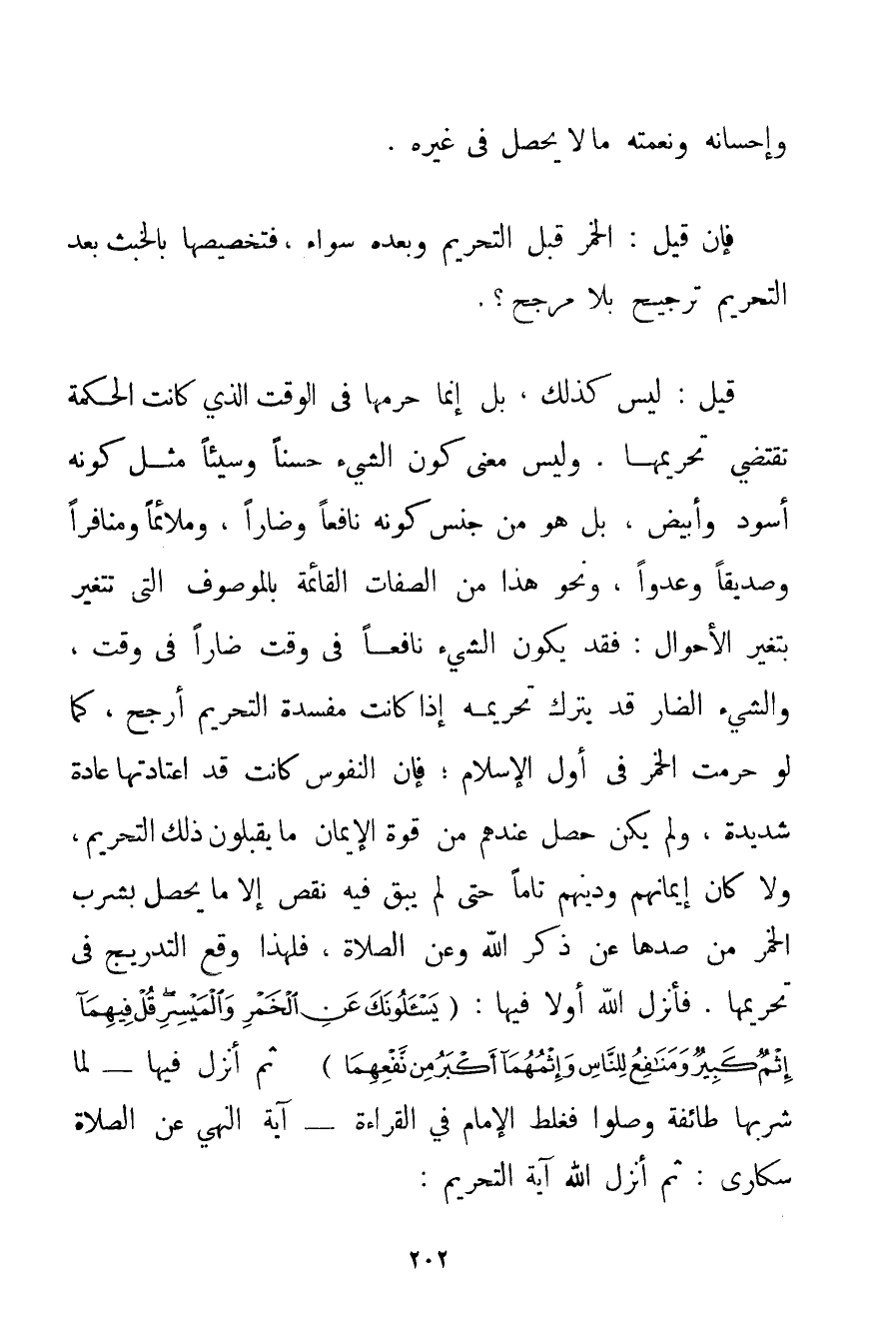 وَإِحْسَانِهِ وَنِعْمَتِهِ مَا لَا يَحْصُلُ فِي غَيْرِهِ. فَإِنْ قِيلَ: الْخَمْرُ قَبْلَ التَّحْرِيمِ وَبَعْدَهُ سَوَاءٌ فَتَخْصِيصُهَا بِالْخُبْثِ بَعْدَ التَّحْرِيمِ تَرْجِيحٌ بِلَا مُرَجِّحٍ؟ . قِيلَ: لَيْسَ كَذَلِكَ بَلْ إنَّمَا حَرَّمَهَا فِي الْوَقْتِ الَّذِي كَانَتْ الْحِكْمَةُ تَقْتَضِي تَحْرِيمَهَا. وَلَيْسَ مَعْنَى كَوْنِ الشَّيْءِ حَسَنًا وَسَيِّئًا مِثْلَ كَوْنِهِ أَسْوَدَ وَأَبْيَضَ بَلْ هُوَ مِنْ جِنْسِ كَوْنِهِ نَافِعًا وَضَارًّا وَمُلَائِمًا وَمُنَافِرًا وَصِدِّيقًا وَعَدُوًّا وَنَحْوَ هَذَا مِنْ الصِّفَاتِ الْقَائِمَةِ بِالْمَوْصُوفِ الَّتِي تَتَغَيَّرُ بِتَغَيُّرِ الْأَحْوَالِ: فَقَدْ يَكُونُ الشَّيْءُ نَافِعًا فِي وَقْتٍ ضَارًّا فِي وَقْتٍ وَالشَّيْءُ الضَّارُّ قَدْ يُتْرَكُ تَحْرِيمُهُ إذَا كَانَتْ مَفْسَدَةُ التَّحْرِيمِ أَرْجَحَ كَمَا لَوْ حُرِّمَتْ الْخَمْرُ فِي أَوَّلِ الْإِسْلَامِ؛ فَإِنَّ النُّفُوسَ كَانَتْ قَدْ اعْتَادَتْهَا عَادَةً شَدِيدَةً وَلَمْ يَكُنْ حَصَلَ عِنْدَهُمْ مِنْ قُوَّةِ الْإِيمَانِ مَا يَقْبَلُونَ ذَلِكَ التَّحْرِيمَ وَلَا كَانَ إيمَانُهُمْ وَدِينُهُمْ تَامًّا حَتَّى لَمْ يَبْقَ فِيهِ نَقْصٌ إلَّا مَا يَحْصُلُ بِشُرْبِ الْخَمْرِ مِنْ صَدِّهَا عَنْ ذِكْرِ اللَّهِ وَعَنْ الصَّلَاةِ فَلِهَذَا وَقَعَ التَّدْرِيجُ فِي تَحْرِيمِهَا. فَأَنْزَلَ اللَّهُ أَوَّلًا فِيهَا: {يَسْأَلُونَكَ عَنِ الْخَمْرِ وَالْمَيْسِرِ قُلْ فِيهِمَا إثْمٌ كَبِيرٌ وَمَنَافِعُ لِلنَّاسِ وَإِثْمُهُمَا أَكْبَرُ مِنْ نَفْعِهِمَا} ثُمَّ أَنْزَلَ فِيهَا - لَمَّا شَرِبَهَا طَائِفَةٌ وَصَلَّوْا فَغَلِطَ الْإِمَامُ فِي الْقِرَاءَةِ - آيَةُ النَّهْيِ عَنْ الصَّلَاةِ سُكَارَى: ثُمَّ أَنْزَلَ اللَّهُ آيَةَ التَّحْرِيمِ: