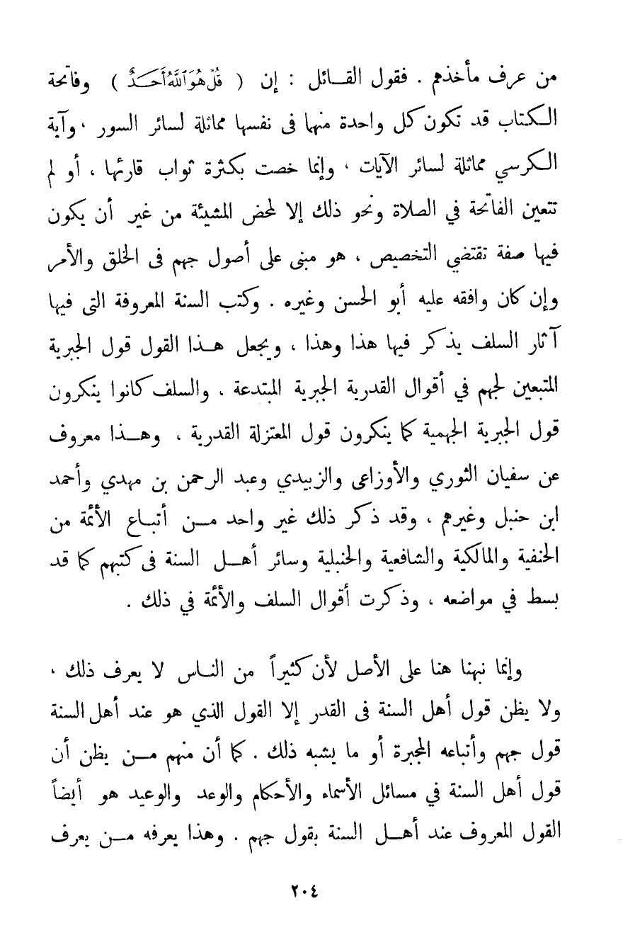 مَنْ عَرَفَ مَأْخَذَهُمْ فَقَوْلُ الْقَائِلِ: إنَّ {قُلْ هُوَ اللَّهُ أَحَدٌ} وَفَاتِحَةُ الْكِتَابِ قَدْ تَكُونُ كُلُّ وَاحِدَةٍ مِنْهُمَا فِي نَفْسِهَا مُمَاثِلَةً لِسَائِرِ السُّوَرِ وَآيَةُ الْكُرْسِيِّ مُمَاثِلَةٌ لِسَائِرِ الْآيَاتِ وَإِنَّمَا خُصَّتْ بِكَثْرَةِ ثَوَابِ قَارِئِهَا أَوْ لَمْ تَتَعَيَّنْ الْفَاتِحَةُ فِي الصَّلَاةِ وَنَحْوِ ذَلِكَ إلَّا لِمَحْضِ الْمَشِيئَةِ مِنْ غَيْرِ أَنْ يَكُونَ فِيهَا صِفَةٌ تَقْتَضِي التَّخْصِيصَ هُوَ مَبْنِيٌّ عَلَى أُصُولِ جَهْمٍ فِي الْخَلْقِ وَالْأَمْرِ وَإِنْ كَانَ وَافَقَهُ عَلَيْهِ أَبُو الْحَسَنِ وَغَيْرُهُ. وَكَتَبَ السُّنَّةُ الْمَعْرُوفَةُ الَّتِي فِيهَا آثَارُ السَّلَفِ يَذْكُرُ فِيهَا هَذَا وَهَذَا وَيَجْعَلُ هَذَا الْقَوْلَ قَوْلَ الْجَبْرِيَّةِ الْمُتَّبِعِينَ لِجَهْمِ فِي أَقْوَالِ الْقَدَرِيَّةِ الْجَبْرِيَّةِ الْمُبْتَدِعَةِ وَالسَّلَفُ كَانُوا يُنْكِرُونَ قَوْلَ الْجَبْرِيَّةِ الْجَهْمِيَّة كَمَا يُنْكِرُونَ قَوْلَ الْمُعْتَزِلَةِ الْقَدَرِيَّةِ وَهَذَا مَعْرُوفٌ عَنْ سُفْيَانَ الثَّوْرِيِّ وَالْأَوْزَاعِي وَالزُّبَيْدِيِّ وَعَبْدِ الرَّحْمَنِ بْنِ مَهْدِيٍّ وَأَحْمَد بْنِ حَنْبَلٍ وَغَيْرِهِمْ وَقَدْ ذَكَرَ ذَلِكَ غَيْرُ وَاحِدٍ مِنْ أَتْبَاعِ الْأَئِمَّةِ مِنْ الْحَنَفِيَّةِ وَالْمَالِكِيَّةِ وَالشَّافِعِيَّةِ وَالْحَنْبَلِيَّةِ وَسَائِرِ أَهْلِ السُّنَّةِ فِي كُتُبِهِمْ كَمَا قَدْ بُسِطَ فِي مَوَاضِعِهِ وَذَكَرْت أَقْوَالَ السَّلَفِ وَالْأَئِمَّةِ فِي ذَلِكَ. وَإِنَّمَا نَبَّهْنَا هُنَا عَلَى الْأَصْلِ لِأَنَّ كَثِيرًا مِنْ النَّاسِ لَا يَعْرِفُ ذَلِكَ وَلَا يَظُنُّ قَوْلَ أَهْلِ السُّنَّةِ فِي الْقَدَرِ إلَّا الْقَوْلَ الَّذِي هُوَ عِنْدَ أَهْلِ السُّنَّةِ قَوْلَ جَهْمٍ وَأَتْبَاعِهِ الْمُجَبِّرَةِ أَوْ مَا يُشْبِهُ ذَلِكَ. كَمَا أَنَّ مِنْهُمْ مَنْ يَظُنُّ أَنَّ قَوْلَ أَهْلِ السُّنَّةِ فِي مَسَائِلِ الْأَسْمَاءِ وَالْأَحْكَامِ وَالْوَعْدِ وَالْوَعِيدِ هُوَ أَيْضًا الْقَوْلُ الْمَعْرُوفُ عِنْدَ أَهْلِ السُّنَّةِ بِقَوْلِ جَهْمٍ. وَهَذَا يَعْرِفُهُ مَنْ يَعْرِفُ
