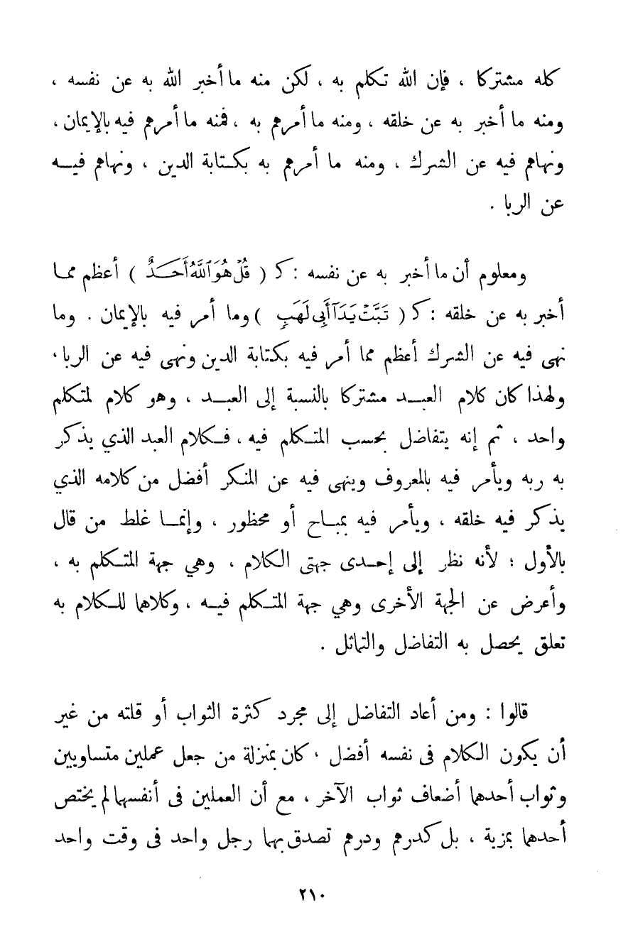 كُلُّهُ مُشْتَرِكًا فَإِنَّ اللَّهَ تَكَلَّمَ بِهِ لَكِنَّ مِنْهُ مَا أَخْبَرَ اللَّهُ بِهِ عَنْ نَفْسِهِ وَمِنْهُ مَا أَخْبَرَ بِهِ عَنْ خَلْقِهِ وَمِنْهُ مَا أَمَرَهُمْ بِهِ فَمِنْهُ مَا أَمَرَهُمْ فِيهِ بِالْإِيمَانِ وَنَهَاهُمْ فِيهِ عَنْ الشِّرْكِ وَمِنْهُ مَا أَمَرَهُمْ بِهِ بِكِتَابَةِ الدَّيْنِ وَنَهَاهُمْ فِيهِ عَنْ الرِّبَا. وَمَعْلُومٌ أَنَّ مَا أَخْبَرَ بِهِ عَنْ نَفْسِهِ: ك {قُلْ هُوَ اللَّهُ أَحَدٌ} أَعْظَمُ مِمَّا أَخْبَرَ بِهِ عَنْ خَلْقِهِ: ك {تَبَّتْ يَدَا أَبِي لَهَبٍ} وَمَا أَمَرَ فِيهِ بِالْإِيمَانِ. وَمَا نَهَى فِيهِ عَنْ الشِّرْكِ أَعْظَمُ مِمَّا أَمَرَ فِيهِ بِكِتَابَةِ الدَّيْنِ وَنَهَى فِيهِ عَنْ الرِّبَا وَلِهَذَا كَانَ كَلَامُ الْعَبْدِ مُشْتَرِكًا بِالنِّسْبَةِ إلَى الْعَبْدِ وَهُوَ كَلَامٌ لِمُتَكَلِّمِ وَاحِدٍ ثُمَّ إنَّهُ يَتَفَاضَلُ بِحَسَبِ الْمُتَكَلِّمِ فِيهِ فَكَلَامُ الْعَبْدِ الَّذِي يَذْكُرُ بِهِ رَبَّهُ وَيَأْمُرُ فِيهِ بِالْمَعْرُوفِ وَيَنْهَى فِيهِ عَنْ الْمُنْكَرِ أَفْضَلُ مِنْ كَلَامِهِ الَّذِي يَذْكُرُ فِيهِ خَلْقَهُ وَيَأْمُرُ فِيهِ بِمُبَاحِ أَوْ مَحْظُورٍ وَإِنَّمَا غَلِطَ مَنْ قَالَ بِالْأَوَّلِ؛ لِأَنَّهُ نَظَرَ إلَى إحْدَى جِهَتَيْ الْكَلَامِ وَهِيَ جِهَةُ الْمُتَكَلِّمِ بِهِ وَأَعْرَضَ عَنْ الْجِهَةِ الْأُخْرَى وَهِيَ جِهَةُ الْمُتَكَلَّمِ فِيهِ وَكِلَاهُمَا لِلْكَلَامِ بِهِ تَعَلُّقٌ يَحْصُلُ بِهِ التَّفَاضُلُ وَالتَّمَاثُلُ. قَالُوا: وَمَنْ أَعَادَ التَّفَاضُلَ إلَى مُجَرَّدِ كَثْرَةِ الثَّوَابِ أَوْ قِلَّتِهِ مِنْ غَيْرِ أَنْ يَكُونَ الْكَلَامُ فِي نَفْسِهِ أَفْضَلَ كَانَ بِمَنْزِلَةِ مَنْ جَعَلَ عَمَلَيْنِ مُتَسَاوِيَيْنِ وَثَوَابُ أَحَدِهِمَا أَضْعَافُ ثَوَابِ الْآخَرِ مَعَ أَنَّ الْعَمَلَيْنِ فِي أَنْفُسِهِمَا لَمْ يَخْتَصَّ أَحَدُهُمَا بِمَزِيَّةِ بَلْ كَدِرْهَمِ وَدِرْهَمٍ تَصَدَّقَ بِهِمَا رَجُلٌ وَاحِدٌ فِي وَقْتٍ وَاحِدٍ وَمَكَانٍ