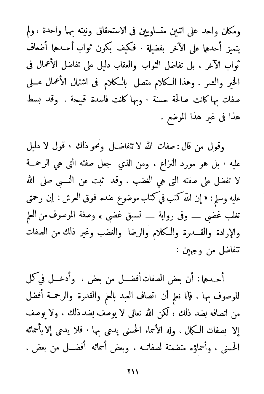 وَاحِدٍ عَلَى اثْنَيْنِ مُتَسَاوِيَيْنِ فِي الِاسْتِحْقَاقِ وَنِيَّتُهُ بِهِمَا وَاحِدَةٌ وَلَمْ يَتَمَيَّزْ أَحَدُهُمَا عَلَى الْآخَرِ بِفَضِيلَةِ فَكَيْفَ يَكُونُ ثَوَابُ أَحَدِهِمَا أَضْعَافَ ثَوَابِ الْآخَرِ بَلْ تَفَاضُلُ الثَّوَابِ وَالْعِقَابِ دَلِيلٌ عَلَى تَفَاضُلِ الْأَعْمَالِ فِي الْخَيْرِ وَالشَّرِّ. وَهَذَا الْكَلَامُ مُتَّصِلٌ بِالْكَلَامِ فِي اشْتِمَالِ الْأَعْمَالِ عَلَى صِفَاتٍ بِهَا كَانَتْ صَالِحَةً حَسَنَةً وَبِهَا كَانَتْ فَاسِدَةً قَبِيحَةً. وَقَدْ بُسِطَ هَذَا فِي غَيْرِ هَذَا الْمَوْضِعِ. وَقَوْلُ مَنْ قَالَ: صِفَاتُ اللَّهِ لَا تَتَفَاضَلُ وَنَحْوَ ذَلِكَ؛ قَوْلٌ لَا دَلِيلَ عَلَيْهِ بَلْ هُوَ مَوْرِدُ النِّزَاعِ وَمَنْ الَّذِي جَعَلَ صِفَتَهُ الَّتِي هِيَ الرَّحْمَةُ لَا تَفْضُلُ عَلَى صِفَتِهِ الَّتِي هِيَ الْغَضَبُ وَقَدْ ثَبَتَ عَنْ النَّبِيِّ صَلَّى اللَّهُ عَلَيْهِ وَسَلَّمَ {إنَّ اللَّهَ كَتَبَ فِي كِتَابٍ مَوْضُوعٍ عِنْدَهُ فَوْقَ الْعَرْشِ: إنَّ رَحْمَتِي تَغْلِبُ غَضَبِي - وَفِي رِوَايَةٍ - تَسْبِقُ غَضَبِي} وَصِفَةُ الْمَوْصُوفِ مِنْ الْعِلْمِ وَالْإِرَادَةِ وَالْقُدْرَةِ وَالْكَلَامِ وَالرِّضَا وَالْغَضَبِ وَغَيْرِ ذَلِكَ مِنْ الصِّفَاتِ تَتَفَاضَلُ مِنْ وَجْهَيْنِ: أَحَدُهُمَا: أَنَّ بَعْضَ الصِّفَاتِ أَفْضَلُ مِنْ بَعْضٍ وَأَدْخَلَ فِي كُلِّ الْمَوْصُوفِ بِهَا فَإِنَّا نَعْلَمُ أَنَّ اتِّصَافَ الْعَبْدِ بِالْعِلْمِ وَالْقُدْرَةِ وَالرَّحْمَةِ أَفْضَلُ مِنْ اتِّصَافِهِ بِضِدِّ ذَلِكَ؛ لَكِنَّ اللَّهَ تَعَالَى لَا يُوصَفُ بِضِدِّ ذَلِكَ وَلَا يُوصَفُ إلَّا بِصِفَاتِ الْكَمَالِ وَلَهُ الْأَسْمَاءُ الْحُسْنَى يُدْعَى بِهَا فَلَا يُدْعَى إلَّا بِأَسْمَائِهِ الْحُسْنَى وَأَسْمَاؤُهُ مُتَضَمِّنَةٌ لِصِفَاتِهِ وَبَعْضُ أَسْمَائِهِ أَفْضَلُ مِنْ بَعْضٍ